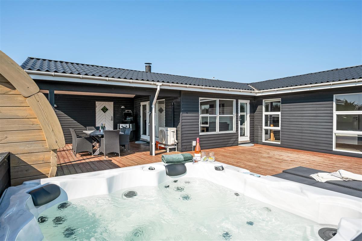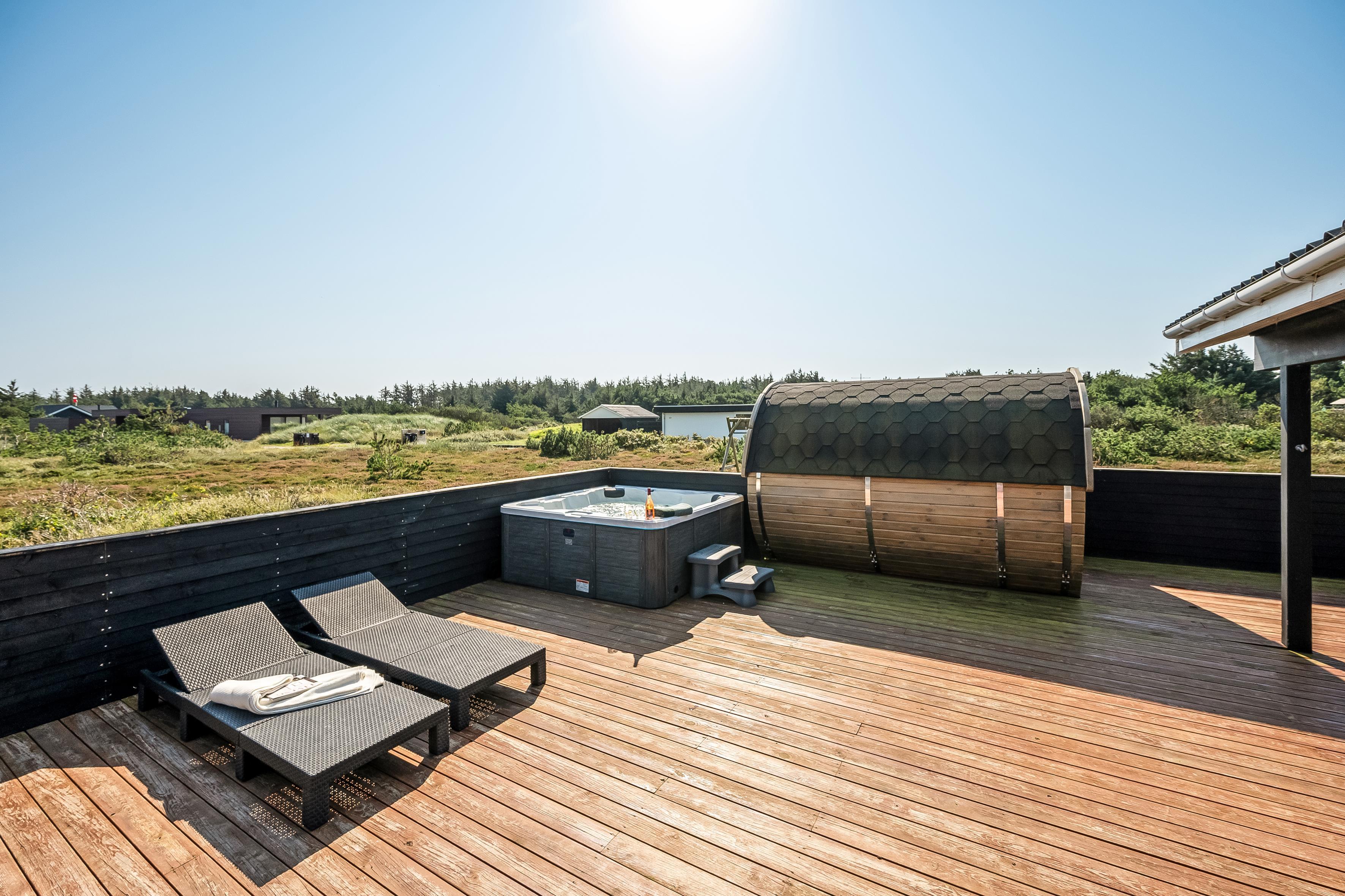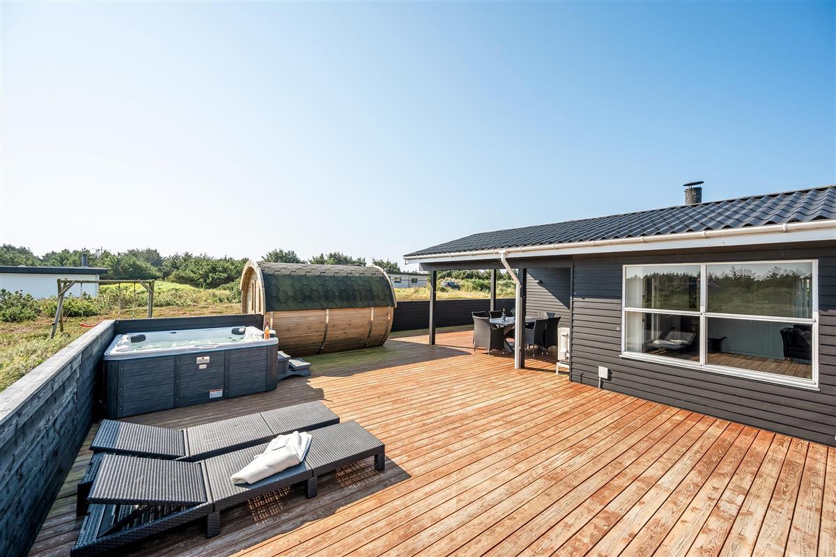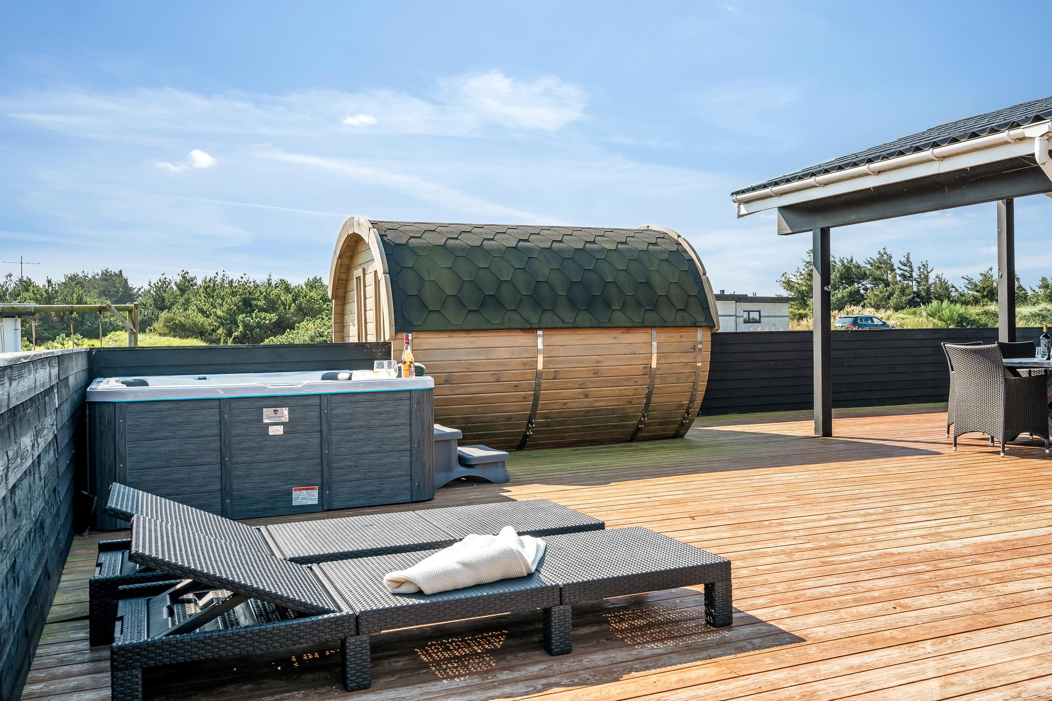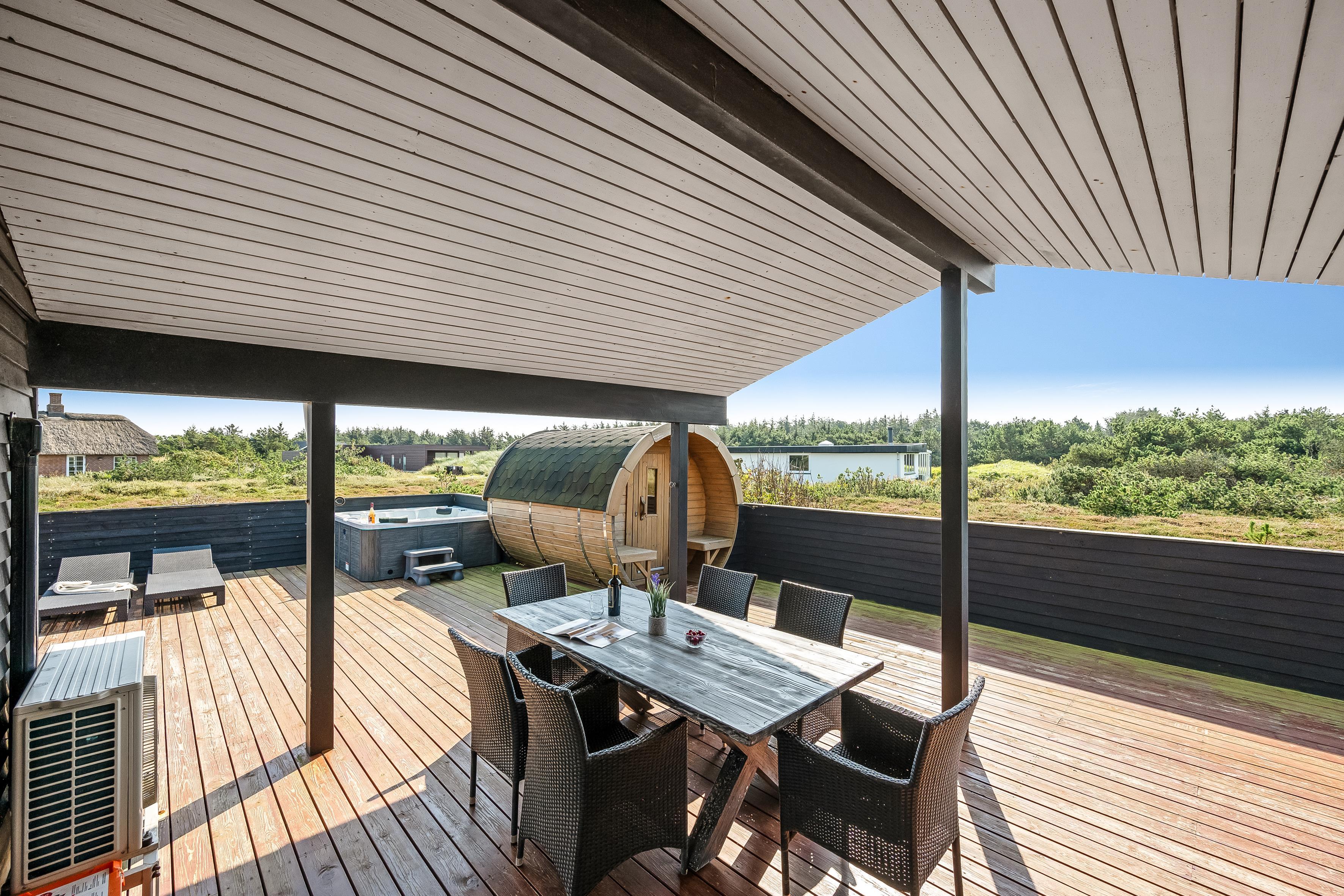 The holiday home has a spacious, enclosed wooden terrace, where you can enjoy the fresh sea air. The terrace includes an outdoor sauna, ideal for unwinding after a day at the beach, and a 6-person outdoor spa, where you can enjoy the bubbles under the open sky. Part of the terrace is covered, so you can sit outside regardless of the weather.