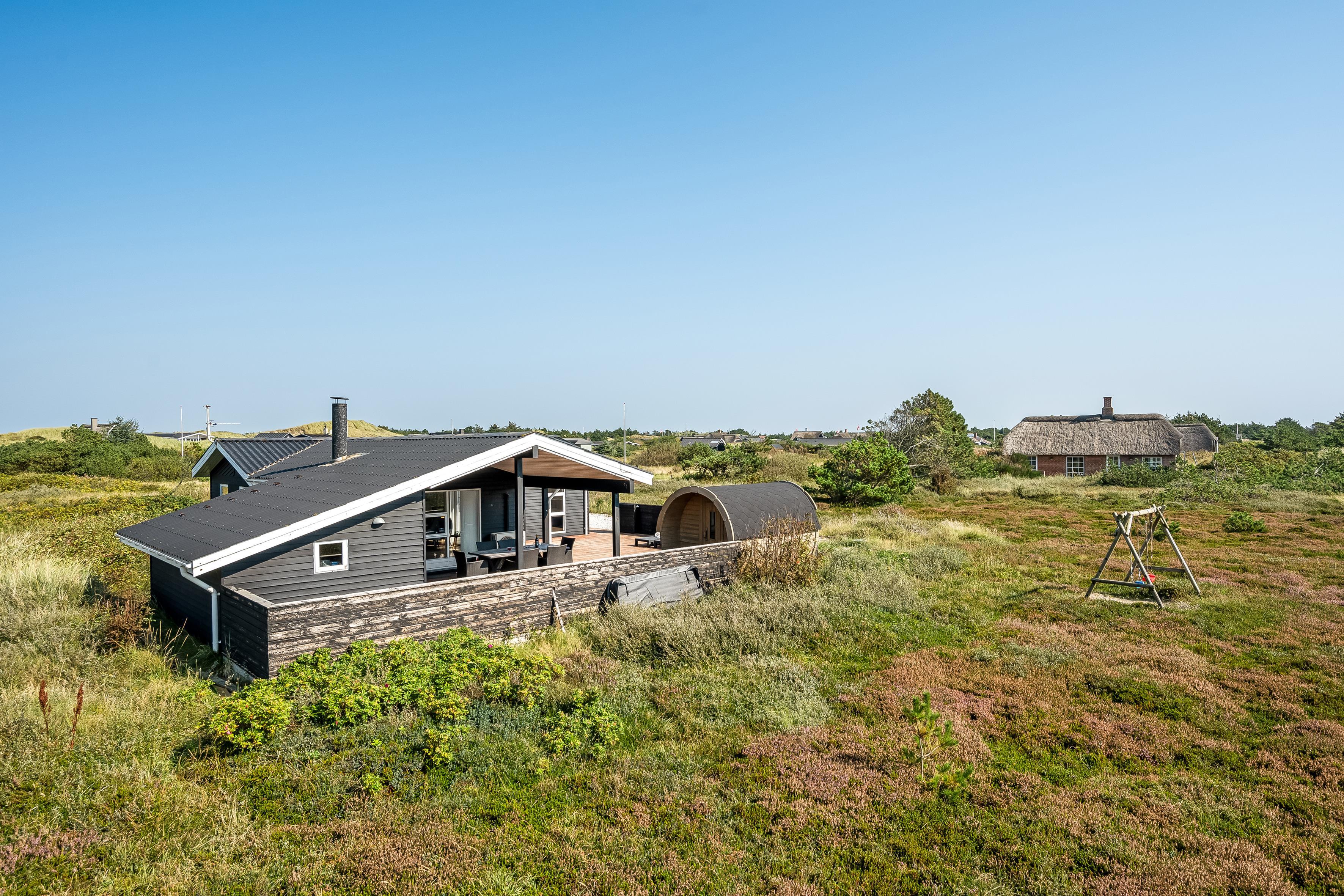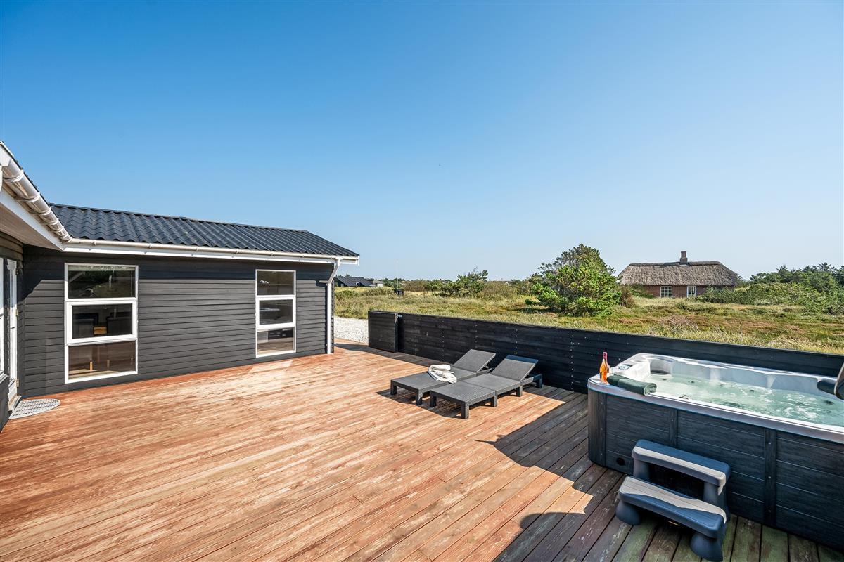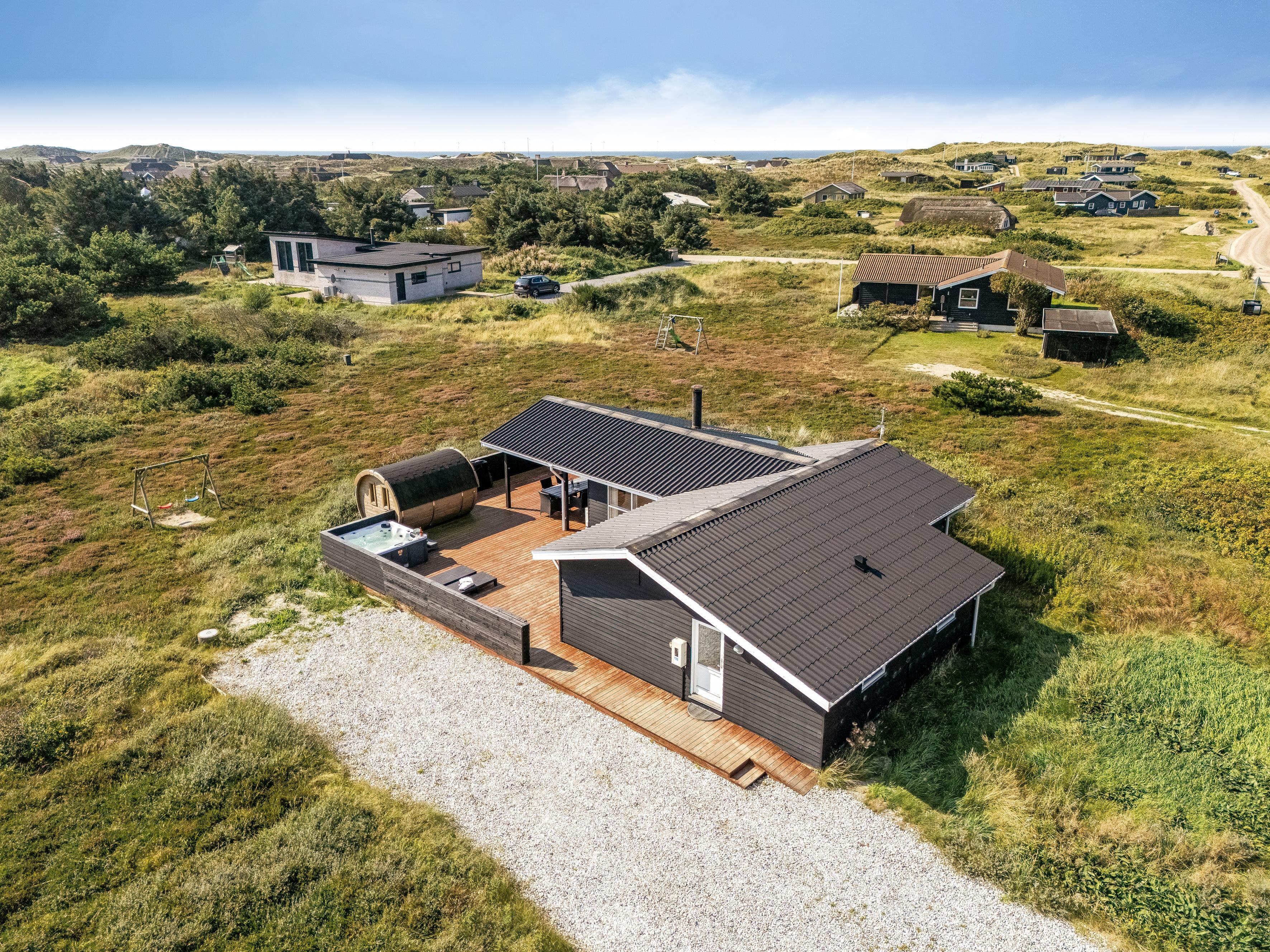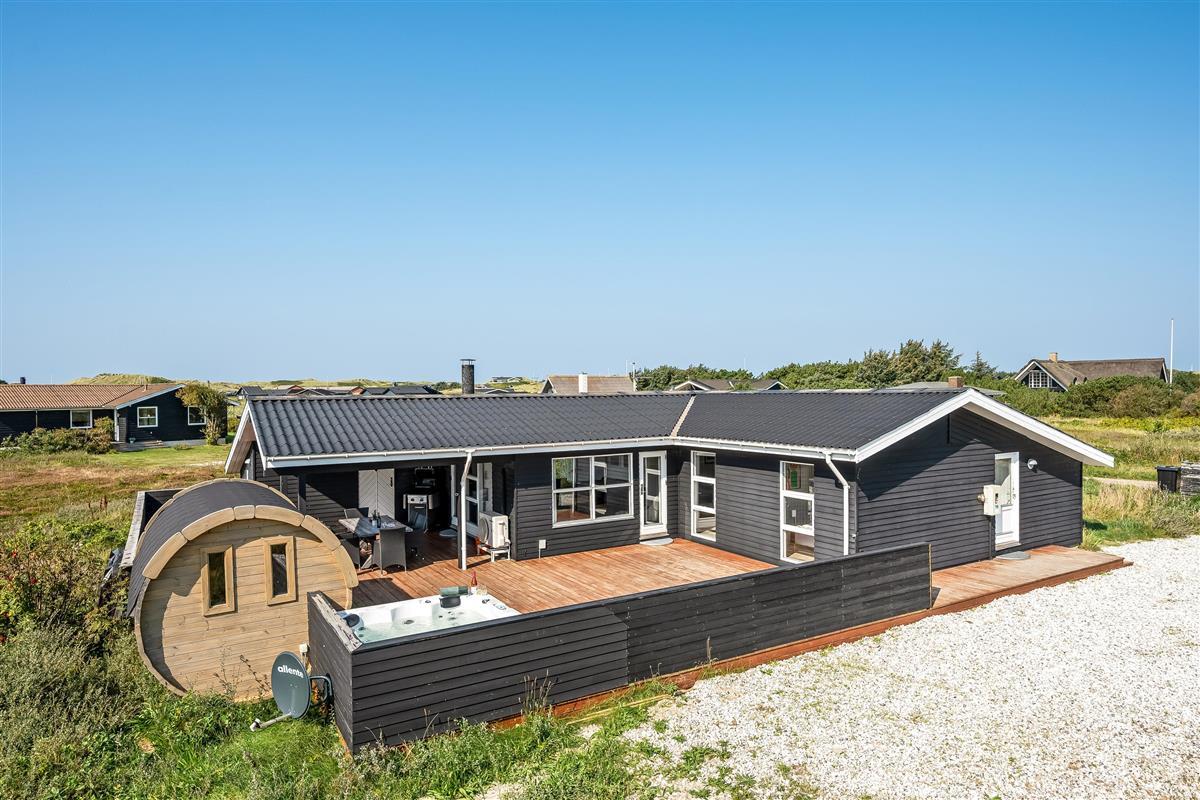 The holiday home has a spacious, enclosed wooden terrace, where you can enjoy the fresh sea air. The terrace includes an outdoor sauna, ideal for unwinding after a day at the beach, and a 6-person outdoor spa, where you can enjoy the bubbles under the open sky. Part of the terrace is covered, so you can sit outside regardless of the weather.