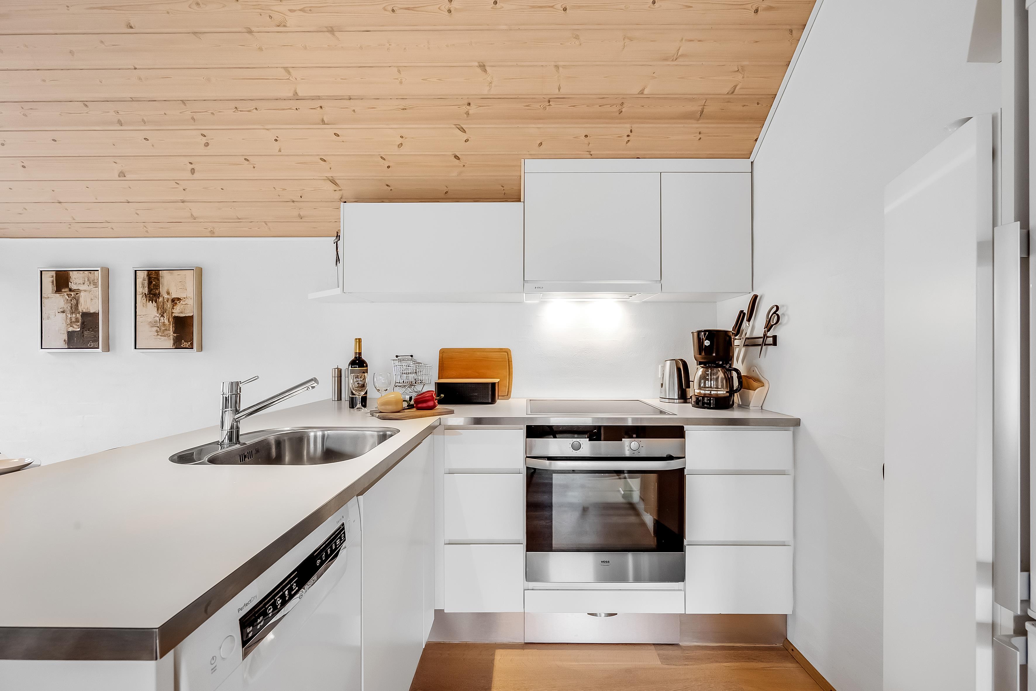 For those who love to cook, the kitchen will be a delight. It is equipped with modern appliances, including an oven, dishwasher, refrigerator and freezer with a capacity of 40 liters. A washing machine and dryer are also available, so you can keep your laundry fresh during your stay. After a lovely dinner, you can enjoy a cozy moment in front of the wood-burning stove, which spreads warmth and atmosphere.