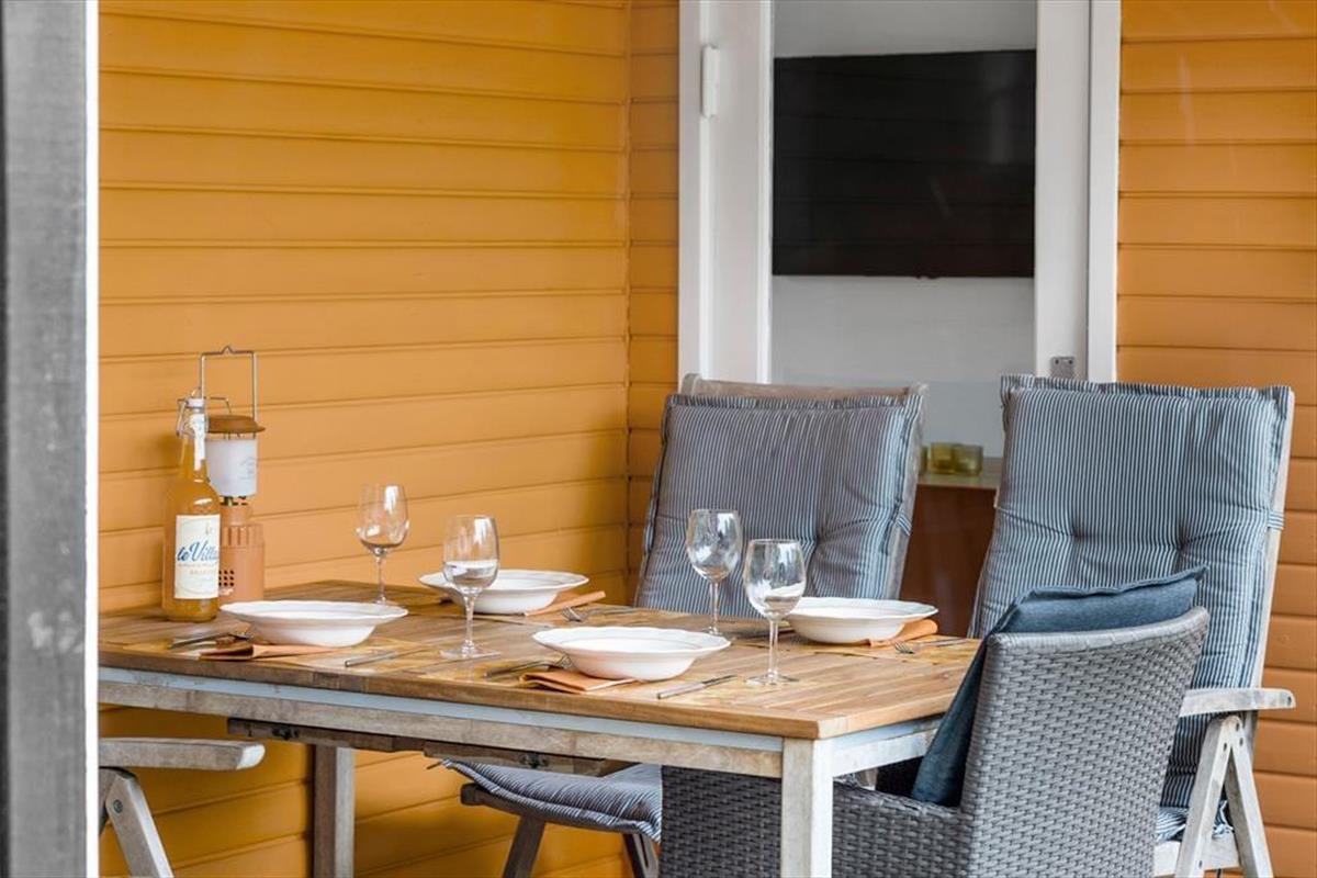 Draußen findest du sowohl eine schöne überdachte Terrasse – natürlich mit orangefarbenen Details – als auch eine herrliche Sonnenterrasse, auf der du die Sonne in vollen Zügen genießen kannst. Hier verblasst der Alltag schnell, und die Urlaubsstimmung entfaltet sich.