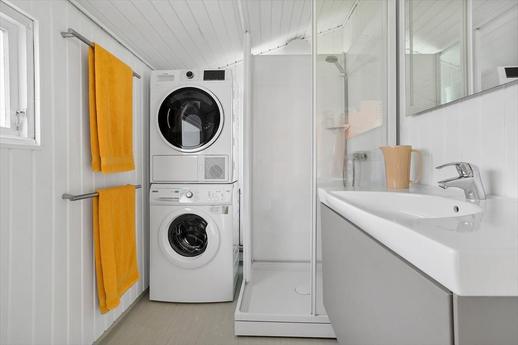 Von der überdachten Terrasse aus gibt es auch Zugang zu einem praktischen Hauswirtschaftsraum mit Waschmaschine und Trockner – und hier findest du auch den Eingang zum WC und Badezimmer des Ferienhauses. Alles überdacht, aber mit Zugang von außen.