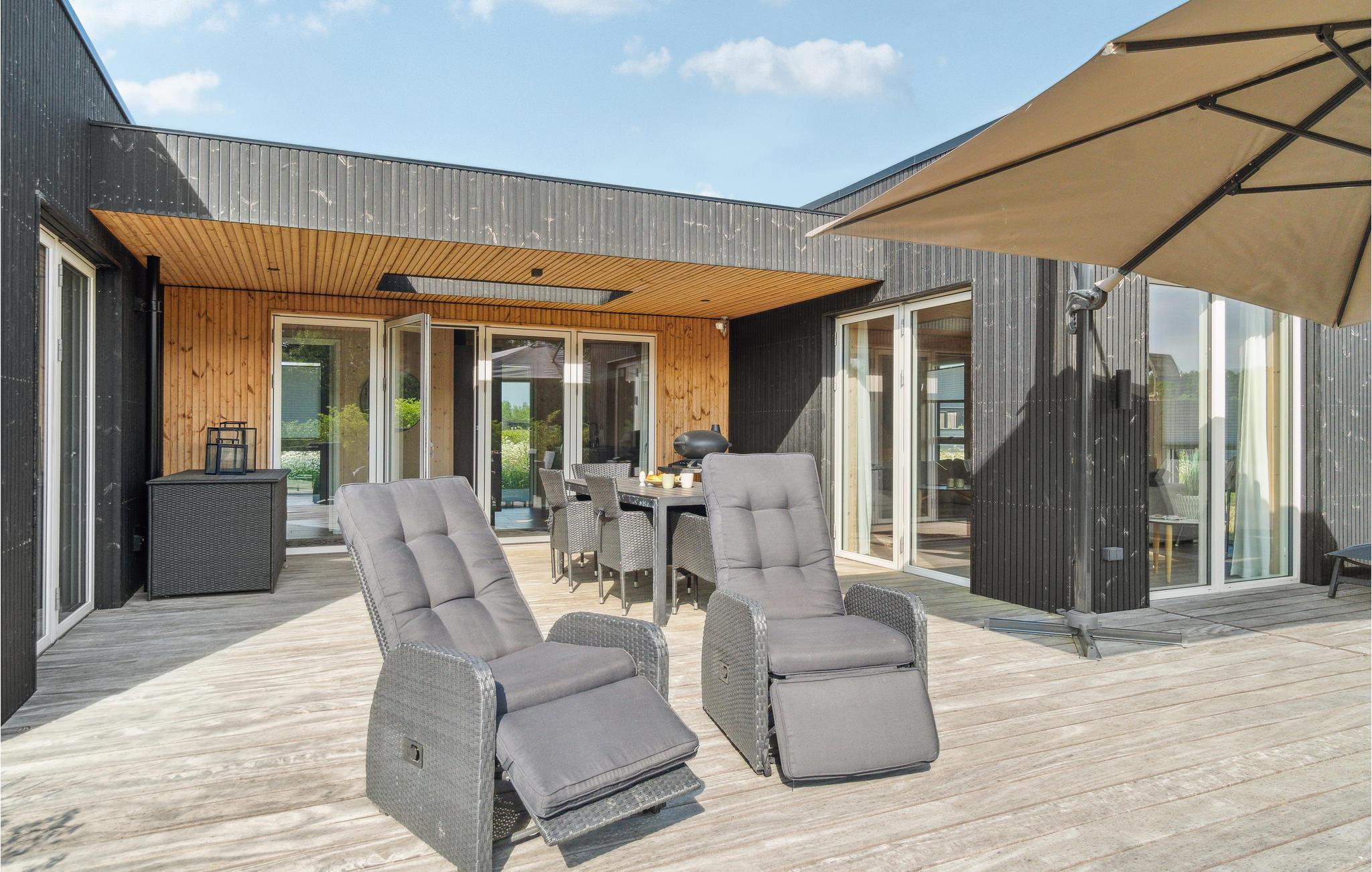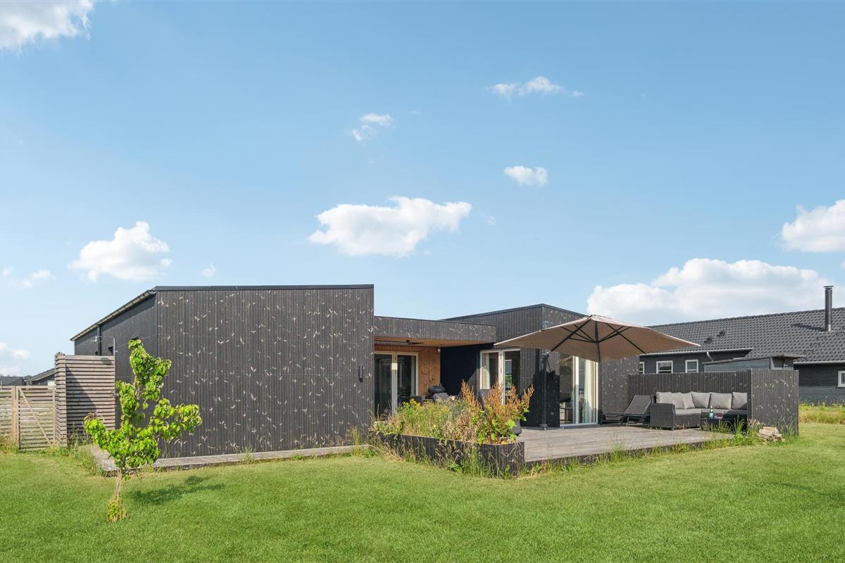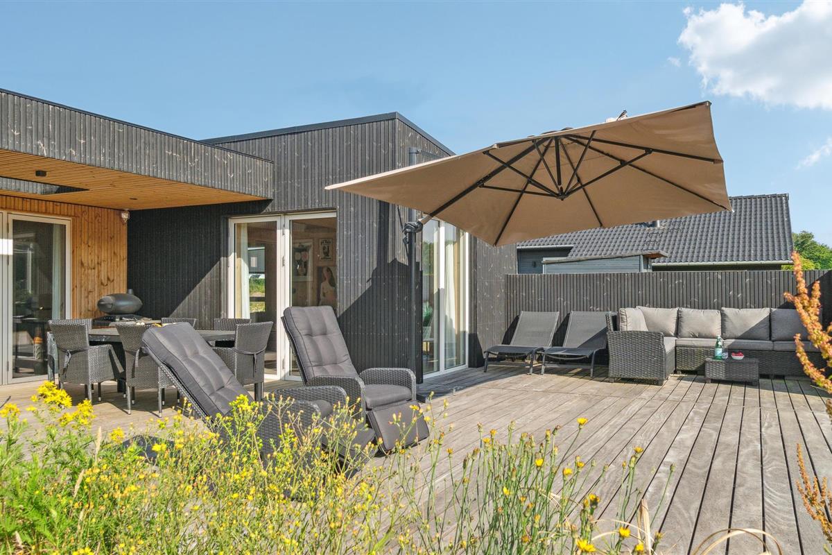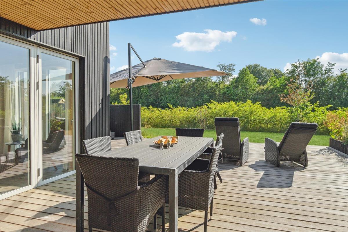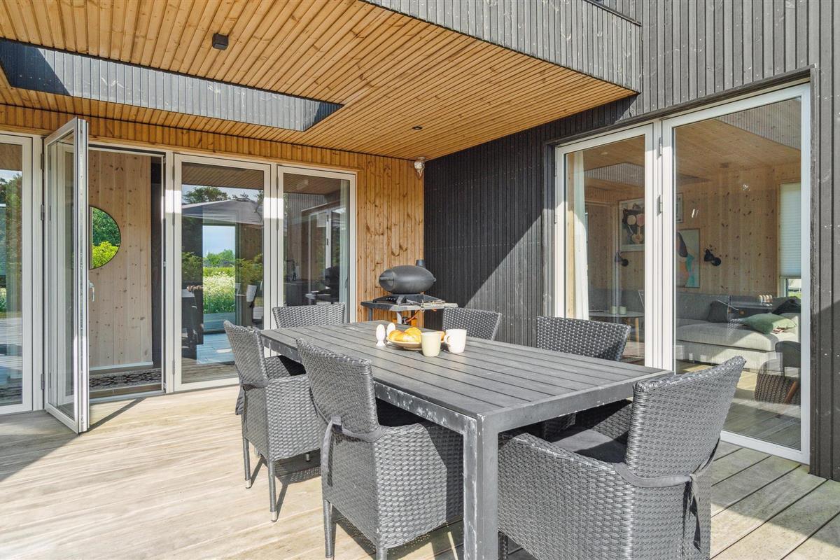 Modern houten vakantiehuis nabij het strand van Saksild, met ruim terras en luxe voorzieningen voor een ontspannen gezinsvakantie.