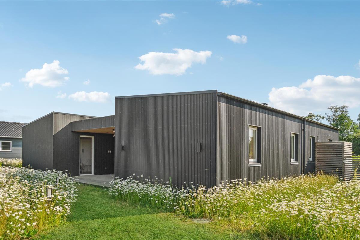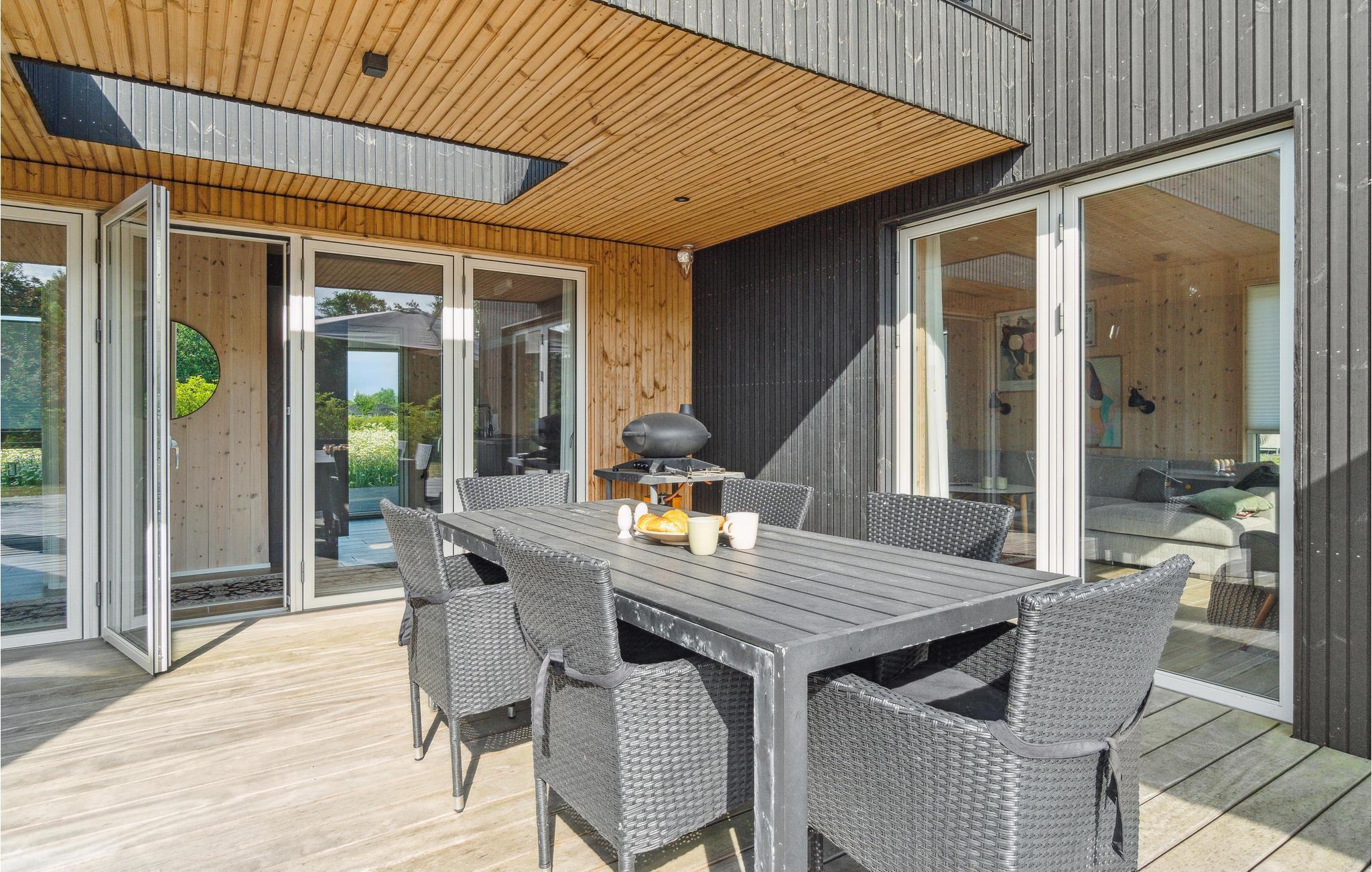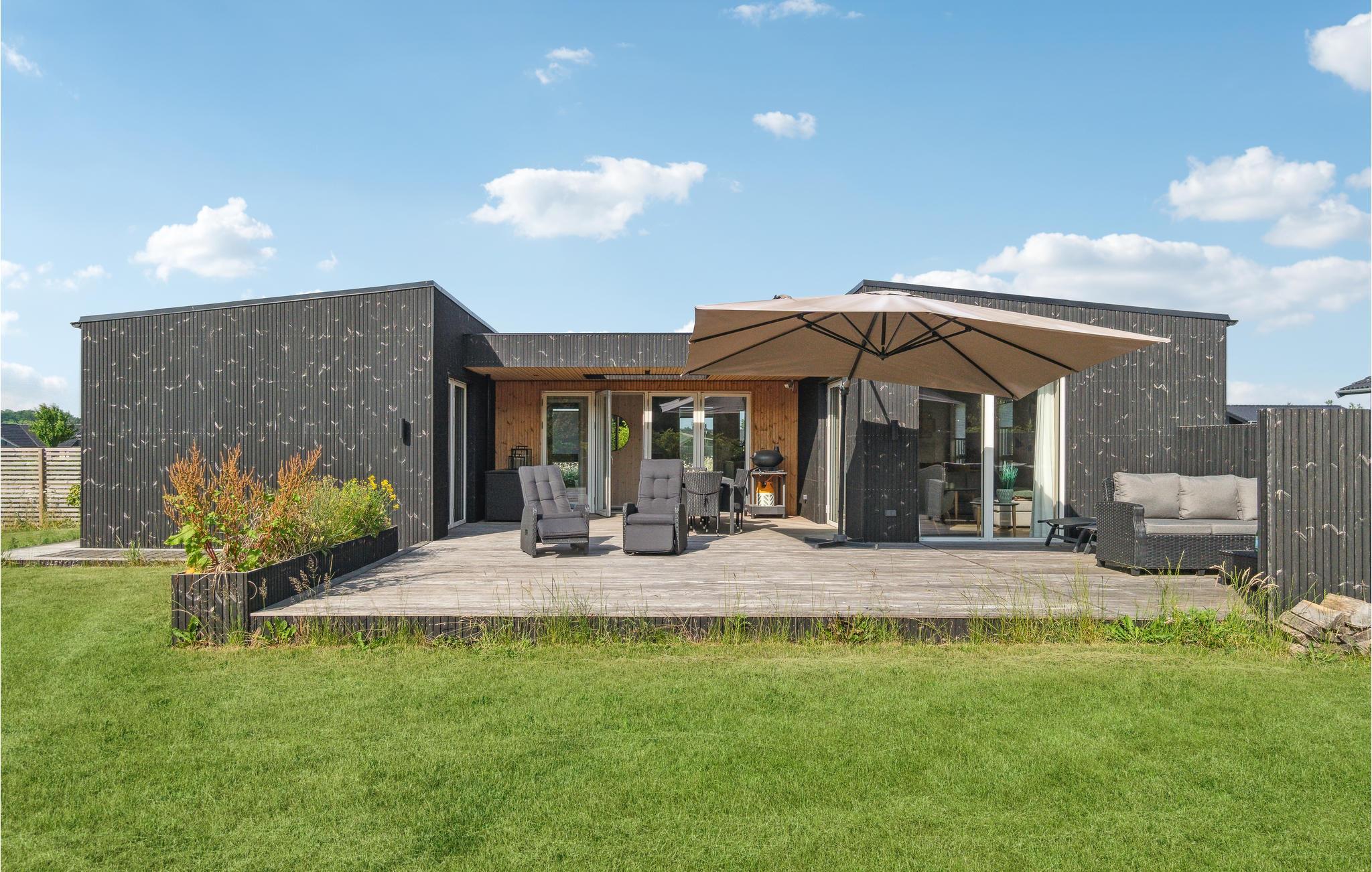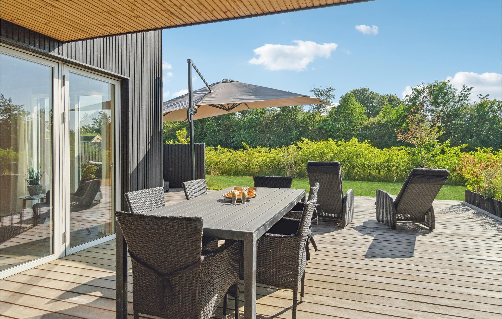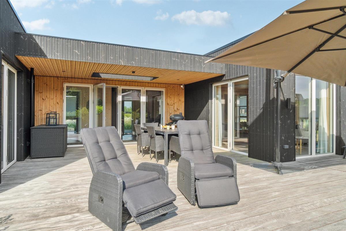 Modern houten vakantiehuis nabij het strand van Saksild, met ruim terras en luxe voorzieningen voor een ontspannen gezinsvakantie.