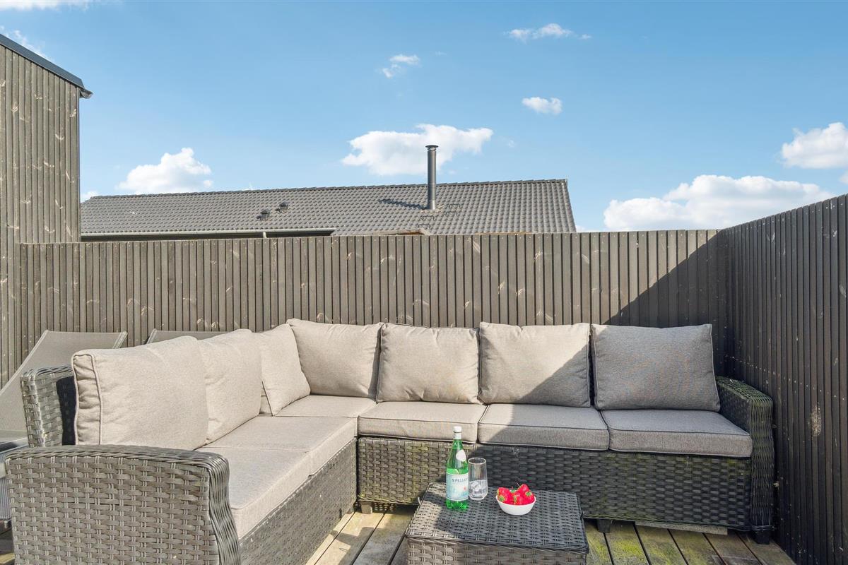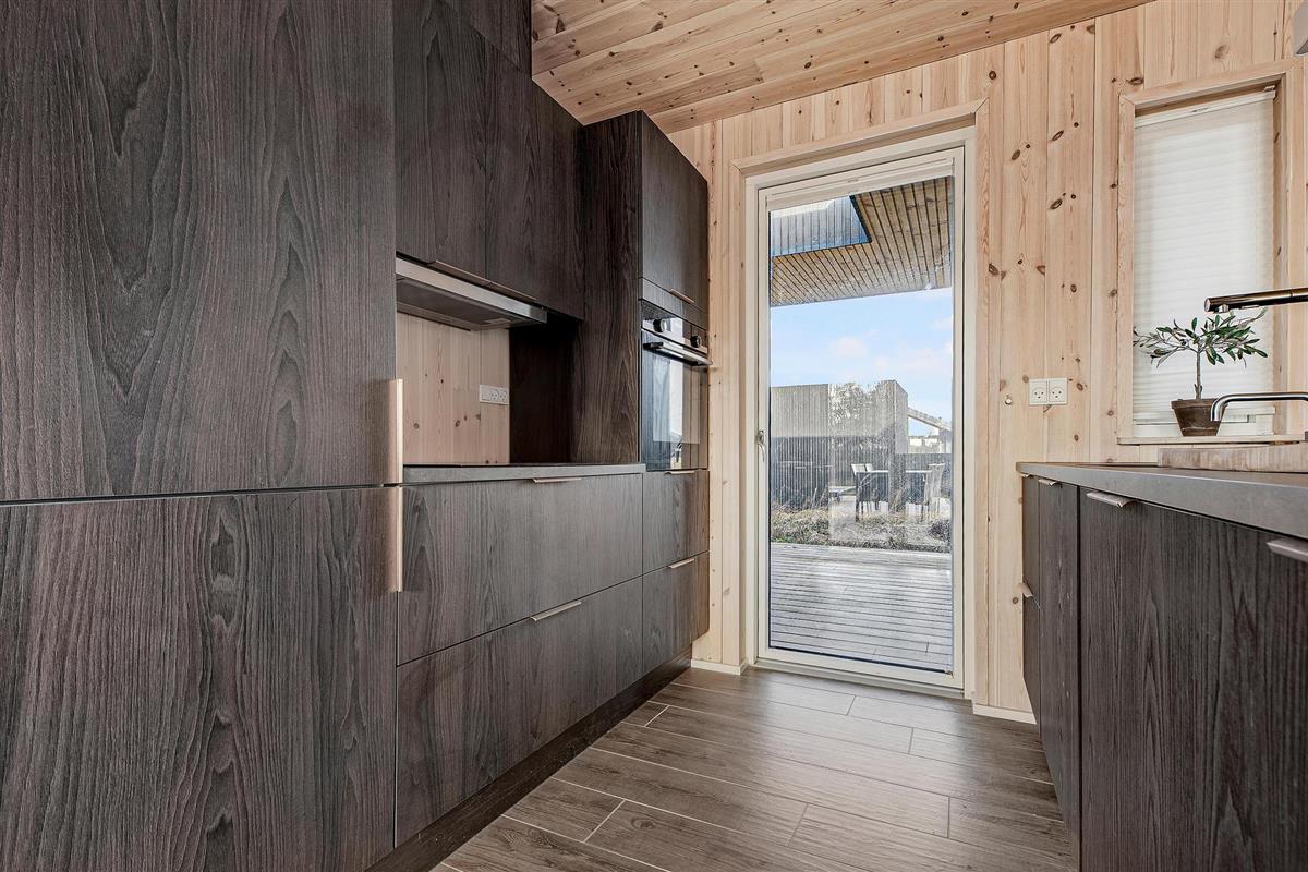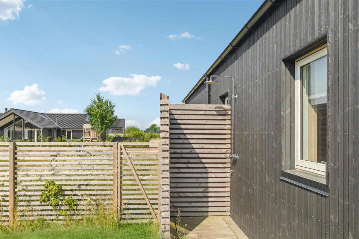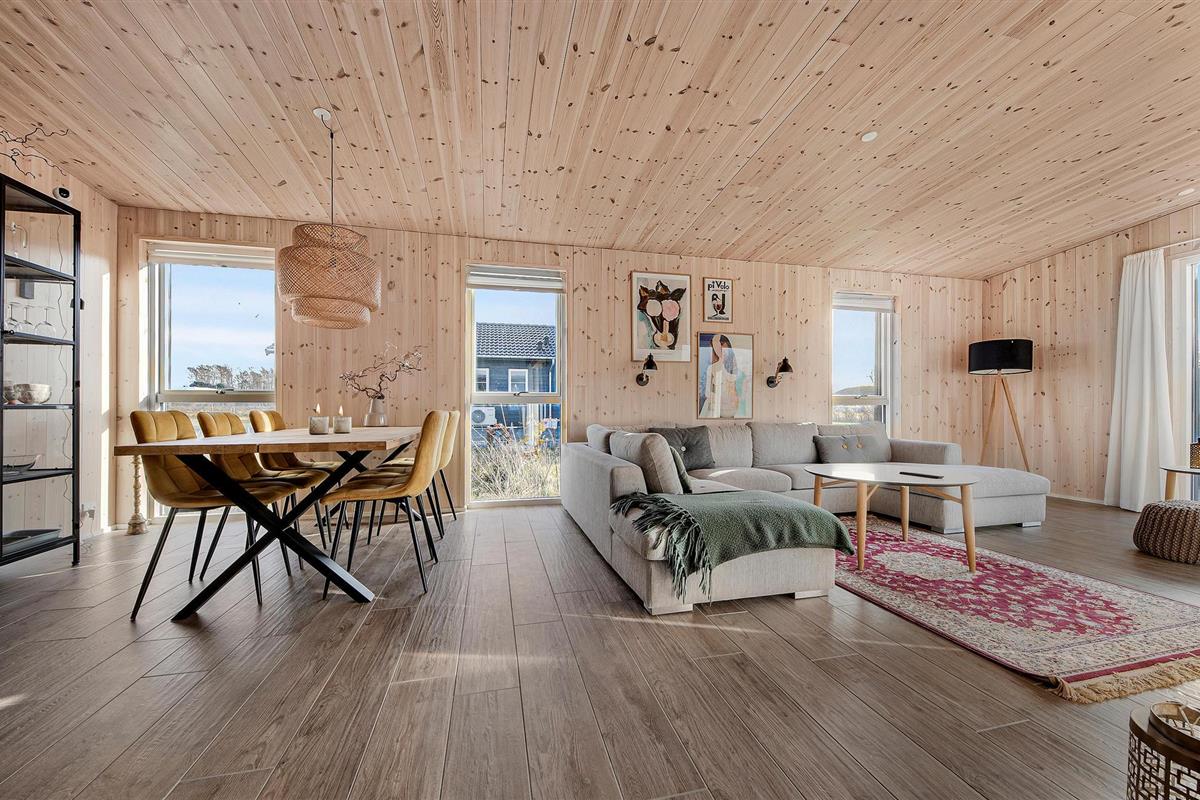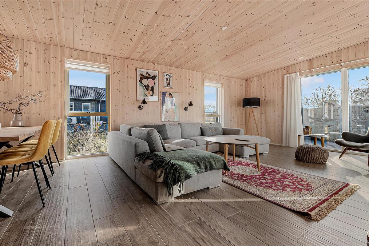 Modern houten vakantiehuis nabij het strand van Saksild, met ruim terras en luxe voorzieningen voor een ontspannen gezinsvakantie.