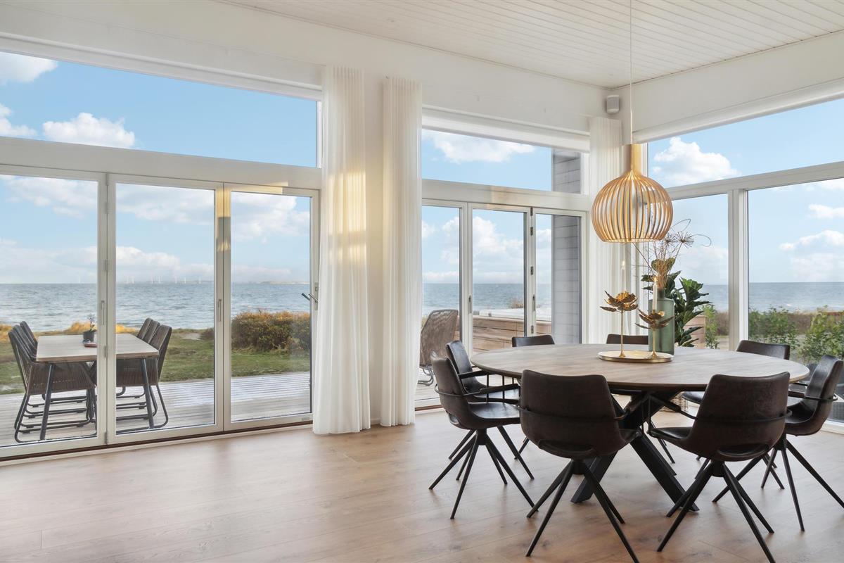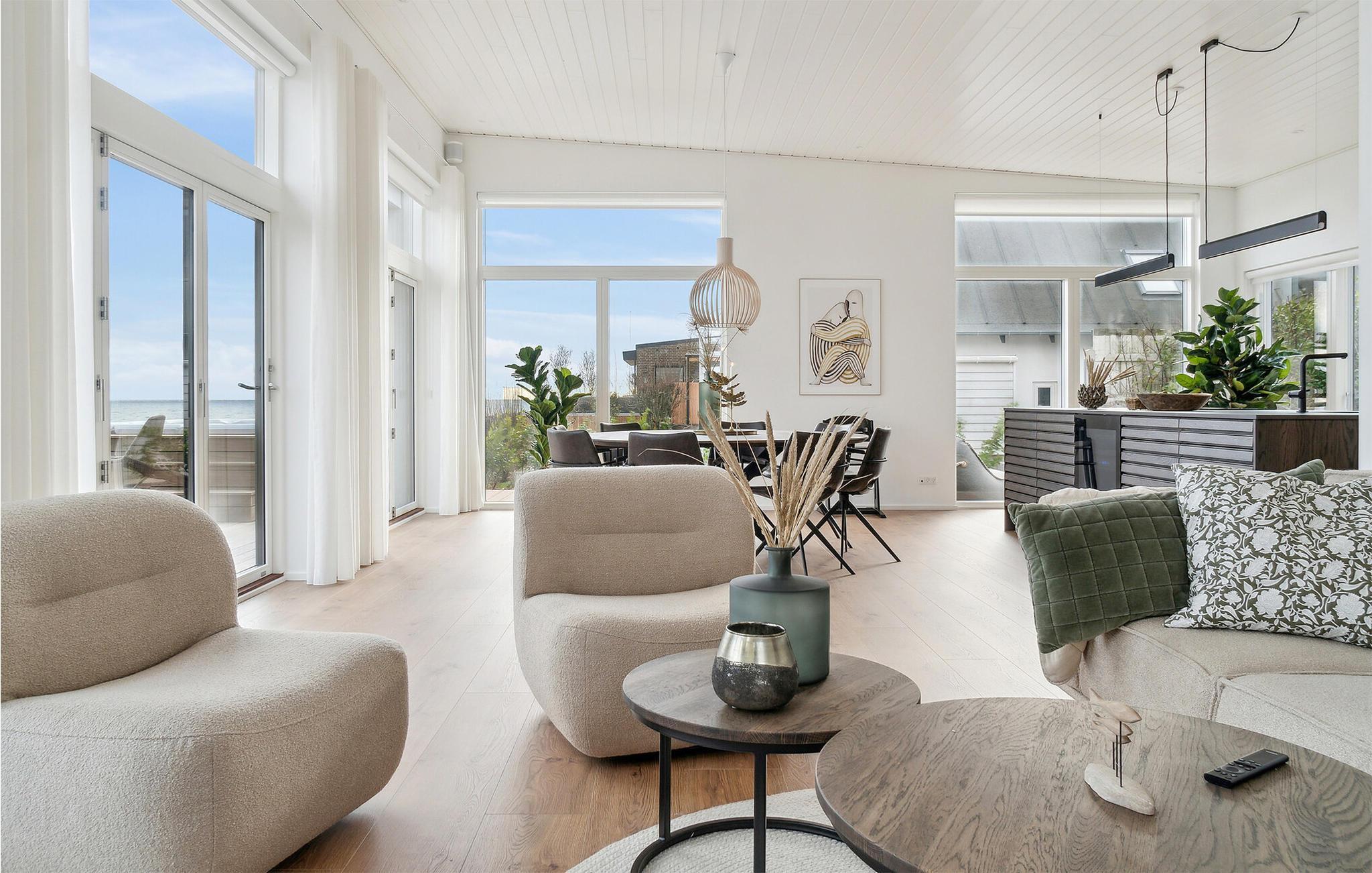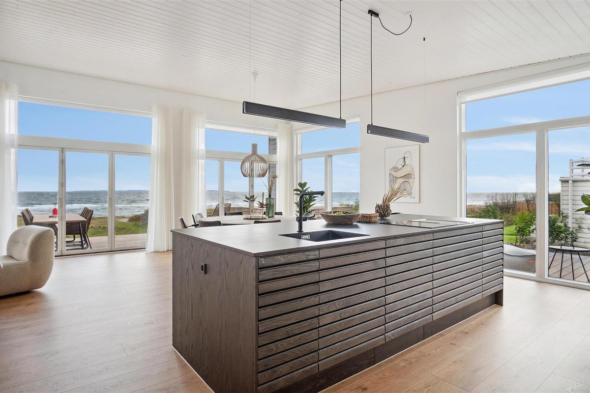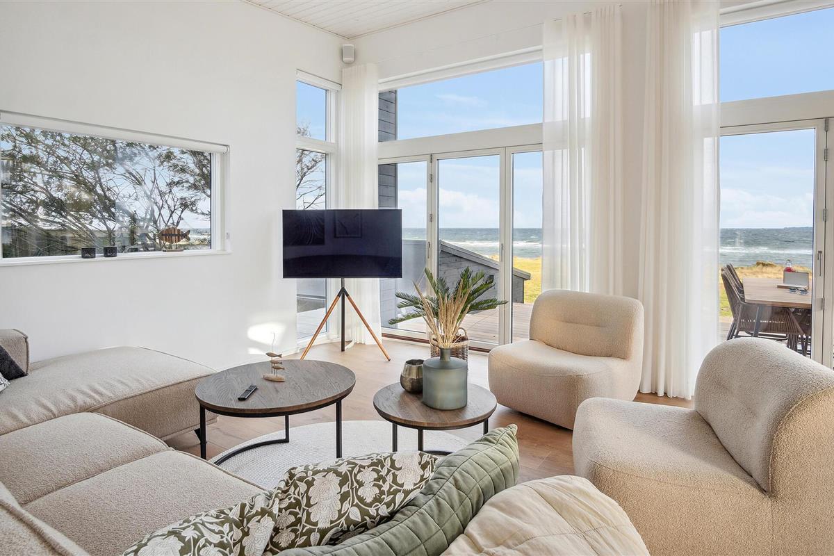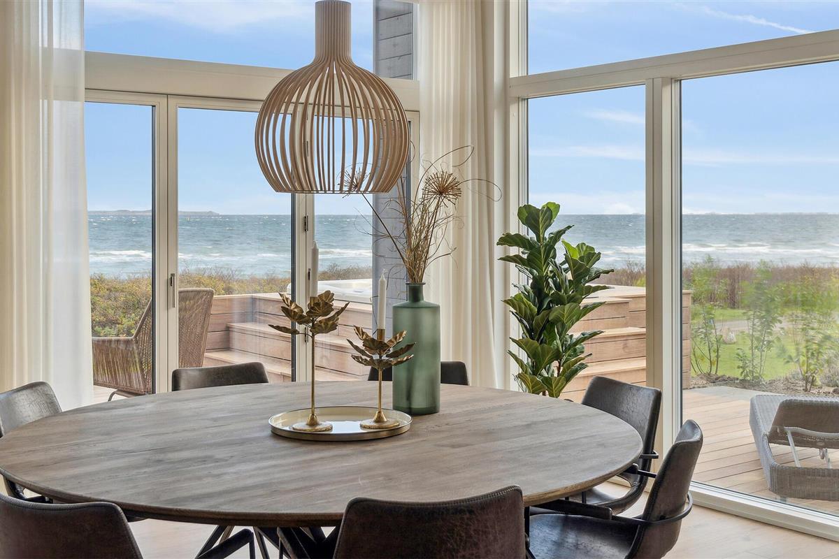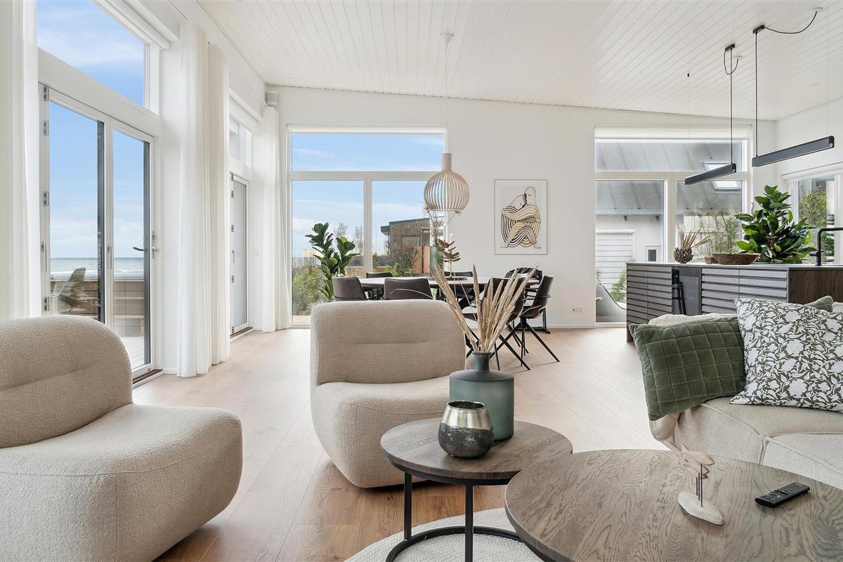 Stap het mooie huis binnen en geniet van het uitzicht op het water vanuit de grote woonkamer door de vele ramen van vloer tot plafond. Het huis zal je verrukken met zijn comfort, grote lichtinval en hoogwaardige inrichting. Waarom organiseer je geen kookwedstrijd in de grote keuken met kookeiland en dineer je aan de eettafel met uitzicht op het water? Je kunt ook een film kijken of naar de golven van de zee kijken vanaf de bank.