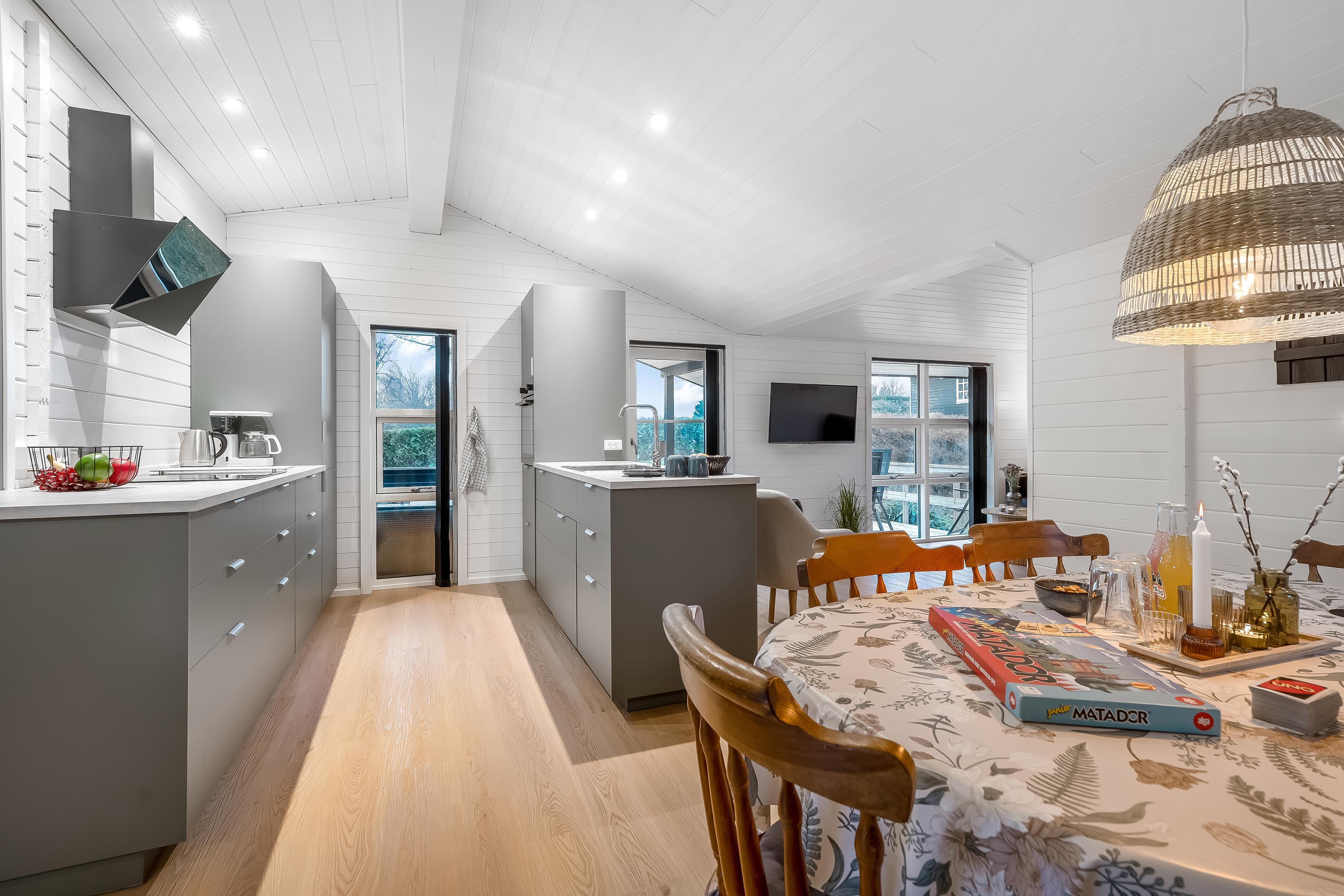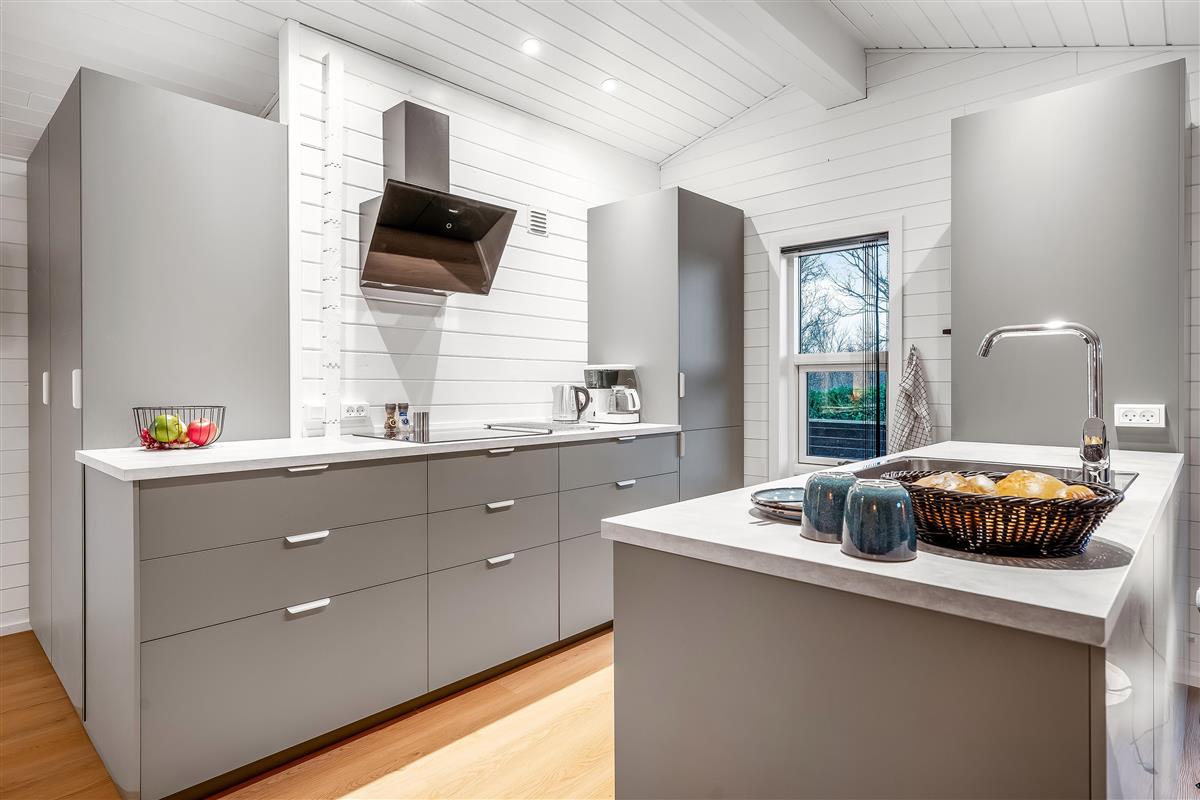 The modern kitchen is equipped with all the necessities, including an induction hob, oven, microwave, dishwasher, fridge and a freezer with a capacity of 60 litres. This makes it easy to prepare delicious meals, which can be enjoyed on the lovely terrace, where a barbecue is also available for outdoor cooking.