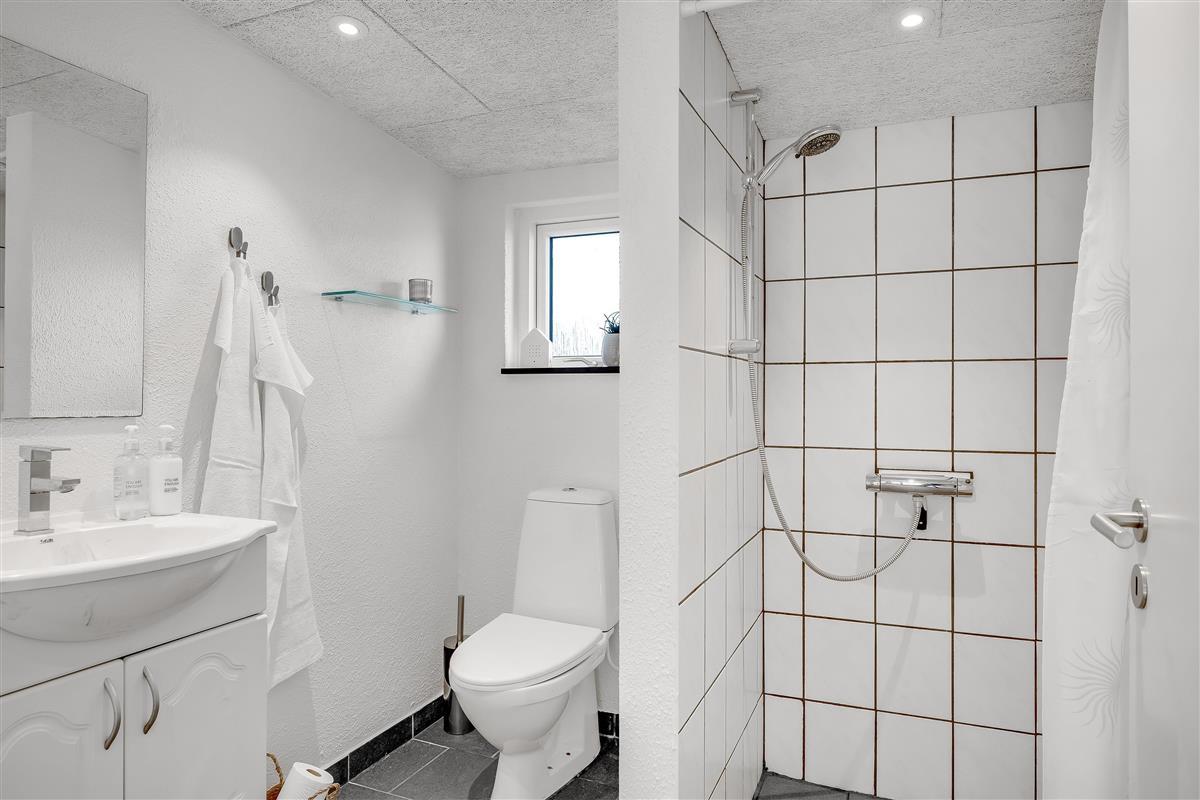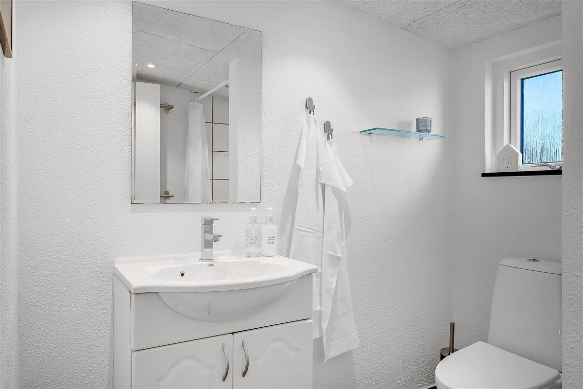 The modern bathroom is equipped with both toilet, shower and underfloor heating, which ensures a comfortable experience, even on the coldest days.
