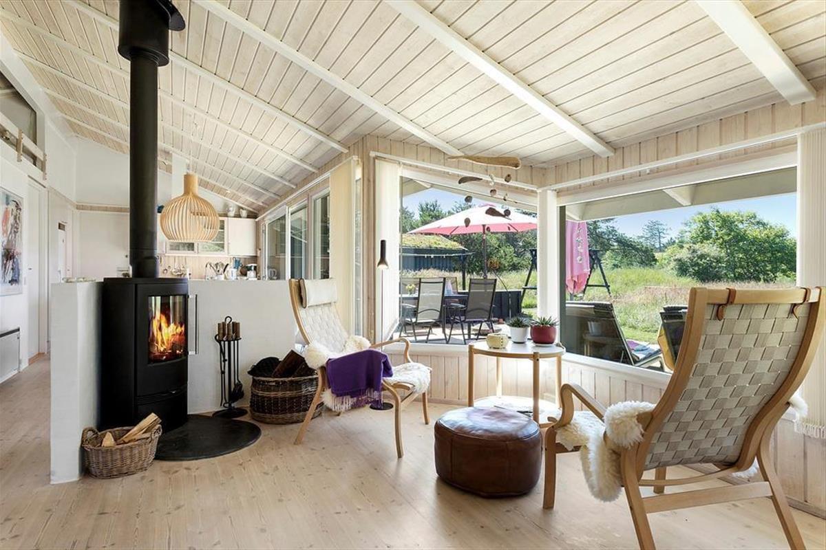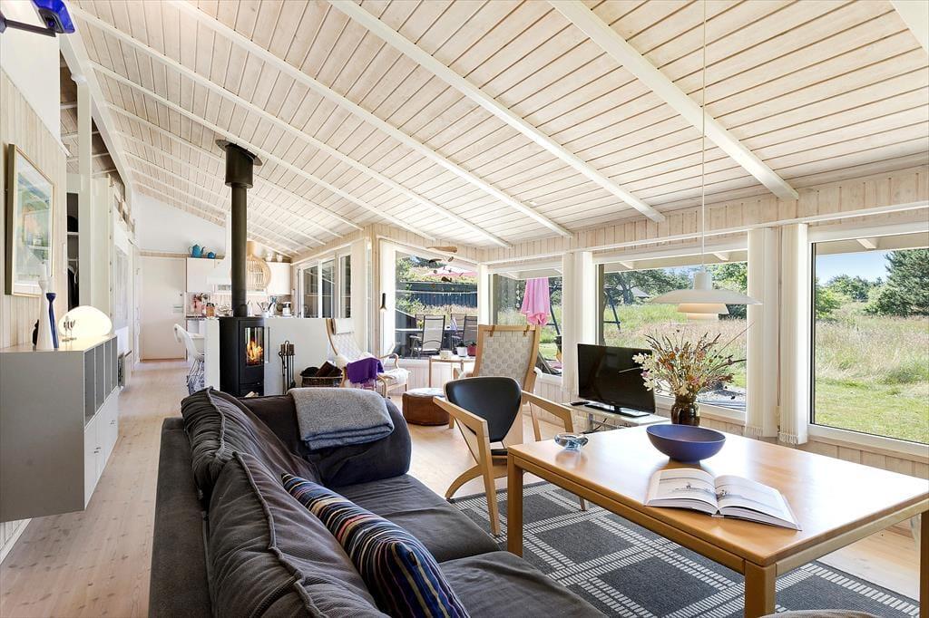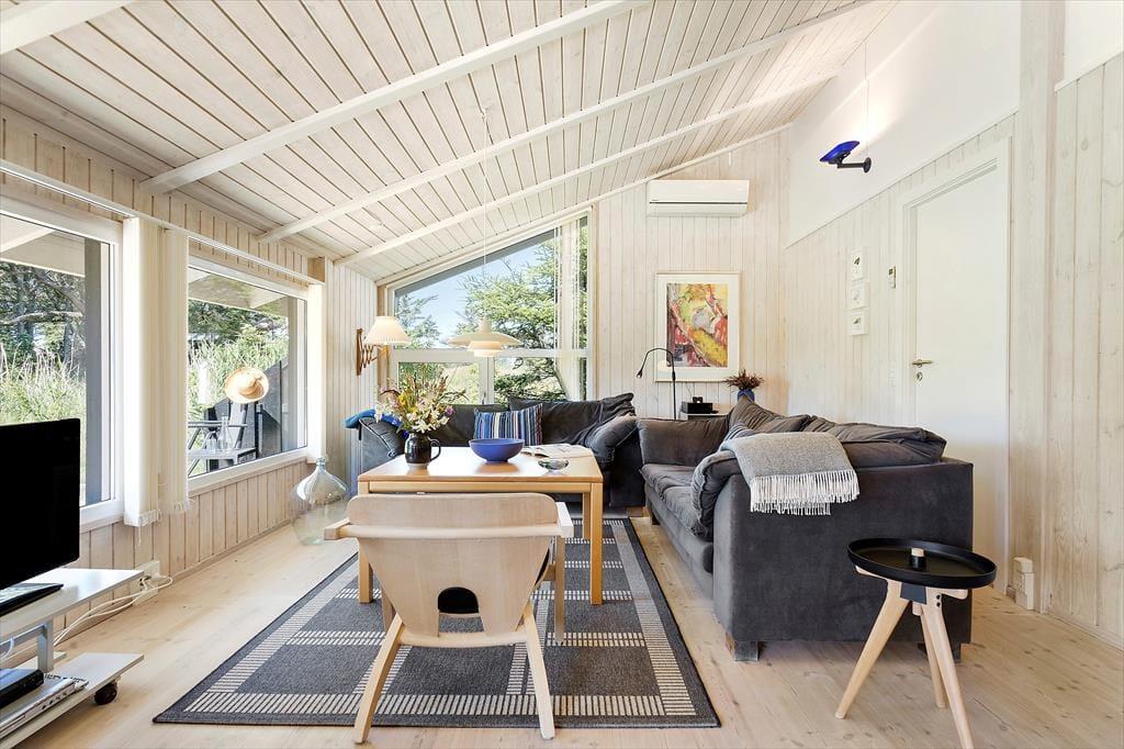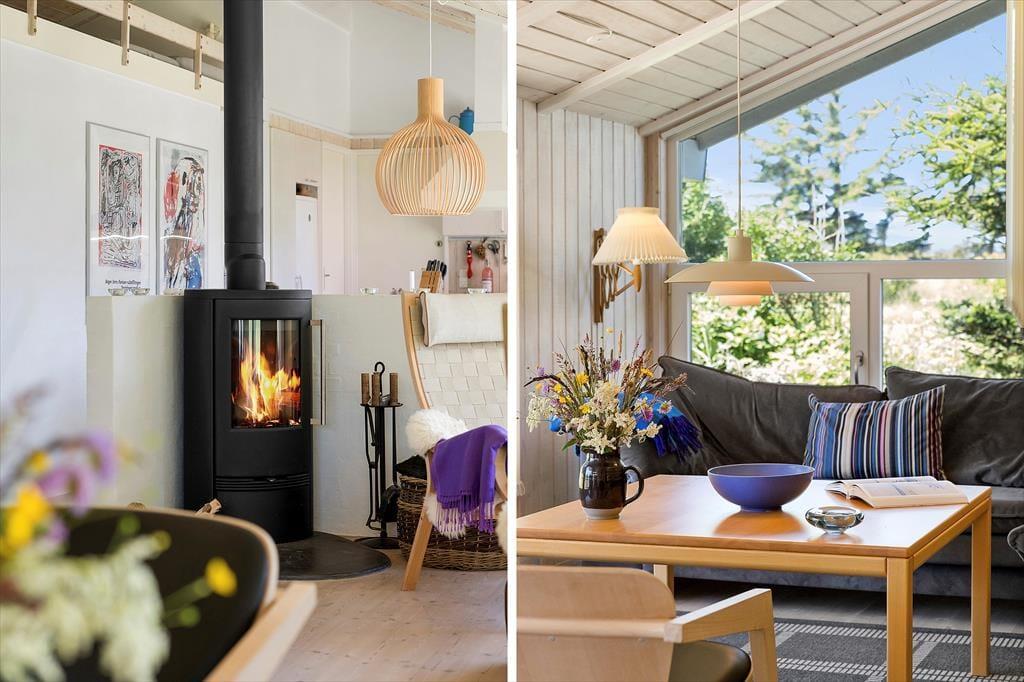 Das Haus ist in hellen Tönen und modernem Stil, mit schicken Möbeln eingerichtet. Die Küche hat eine separate Kücheninsel zwischen Küche und Esstisch, damit Sie während des Kochens beisammen sitzen können. Hinter dem Essbereich liegt das Wohnzimmer mit schönem Blick in die Natur durch die großen Fenster und mit mehreren gemütlichen Ecken zum Ausruhen, Entspannen und Lesen vor dem gusseisernen Kamin. Die vier Schlafzimmer, wovon eines eine Art Schlafnische ist, befinden sich etwas voneinander entfernt, damit Sie sich auch einmal zurückziehen können, falls Sie mit mehreren Familien reisen. Außerdem verfügt das Haus über zwei Badezimmer, beide mit Dusche, und einem Whirlpool und Sauna in dem größeren der beiden, wo etwas Wellnessstimmung aufkommen darf. Hochstuhl und Kinderbett befinden sich im Haus.