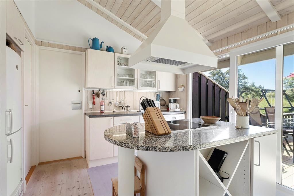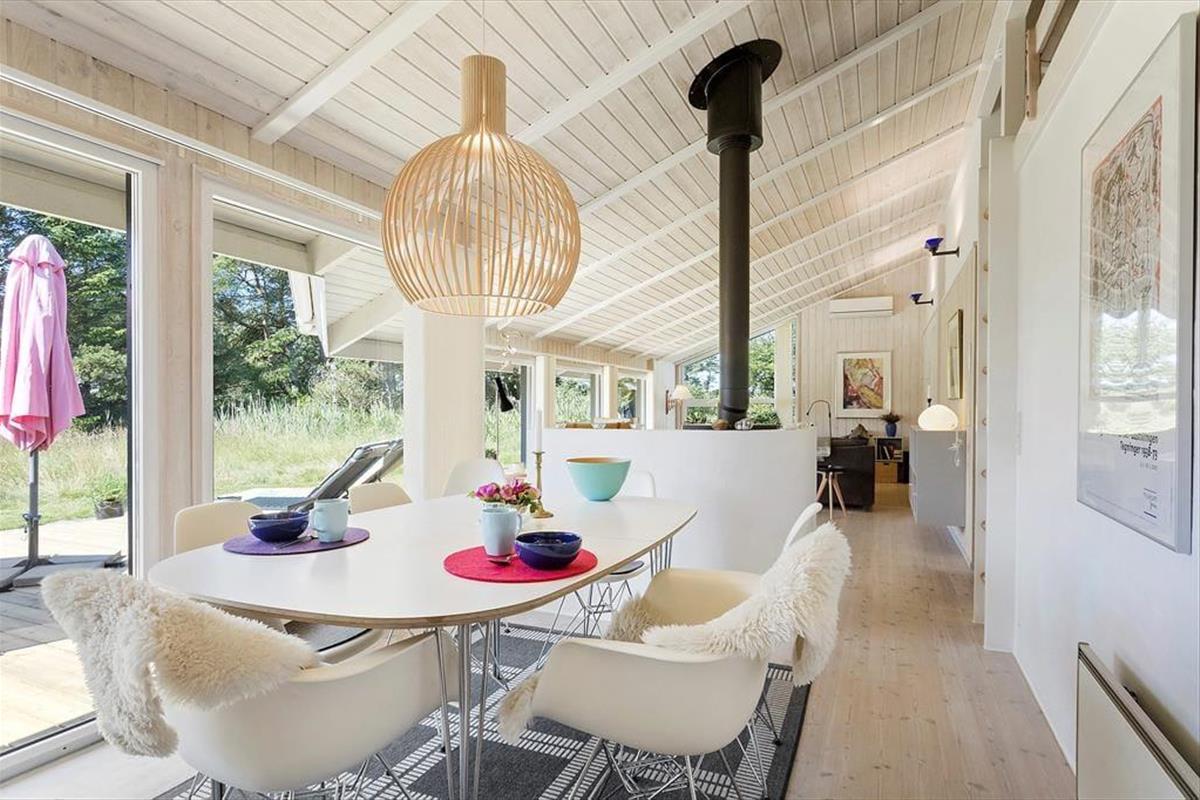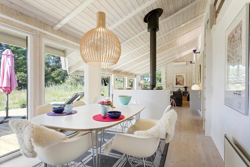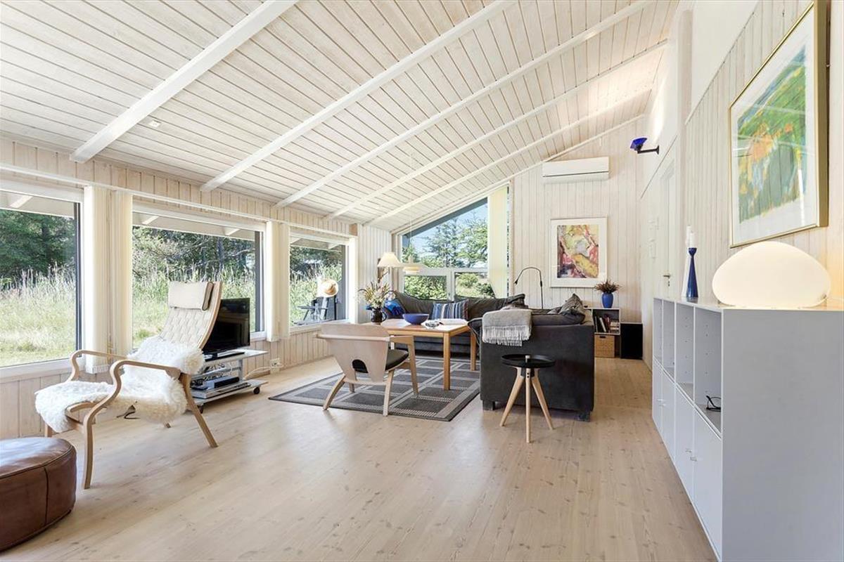 Das Haus ist in hellen Tönen und modernem Stil, mit schicken Möbeln eingerichtet. Die Küche hat eine separate Kücheninsel zwischen Küche und Esstisch, damit Sie während des Kochens beisammen sitzen können. Hinter dem Essbereich liegt das Wohnzimmer mit schönem Blick in die Natur durch die großen Fenster und mit mehreren gemütlichen Ecken zum Ausruhen, Entspannen und Lesen vor dem gusseisernen Kamin. Die vier Schlafzimmer, wovon eines eine Art Schlafnische ist, befinden sich etwas voneinander entfernt, damit Sie sich auch einmal zurückziehen können, falls Sie mit mehreren Familien reisen. Außerdem verfügt das Haus über zwei Badezimmer, beide mit Dusche, und einem Whirlpool und Sauna in dem größeren der beiden, wo etwas Wellnessstimmung aufkommen darf. Hochstuhl und Kinderbett befinden sich im Haus.