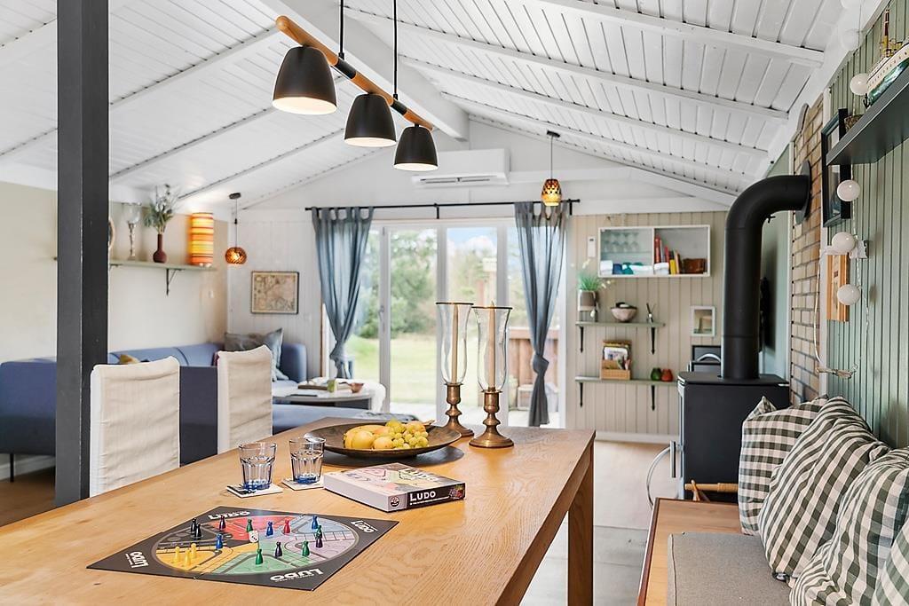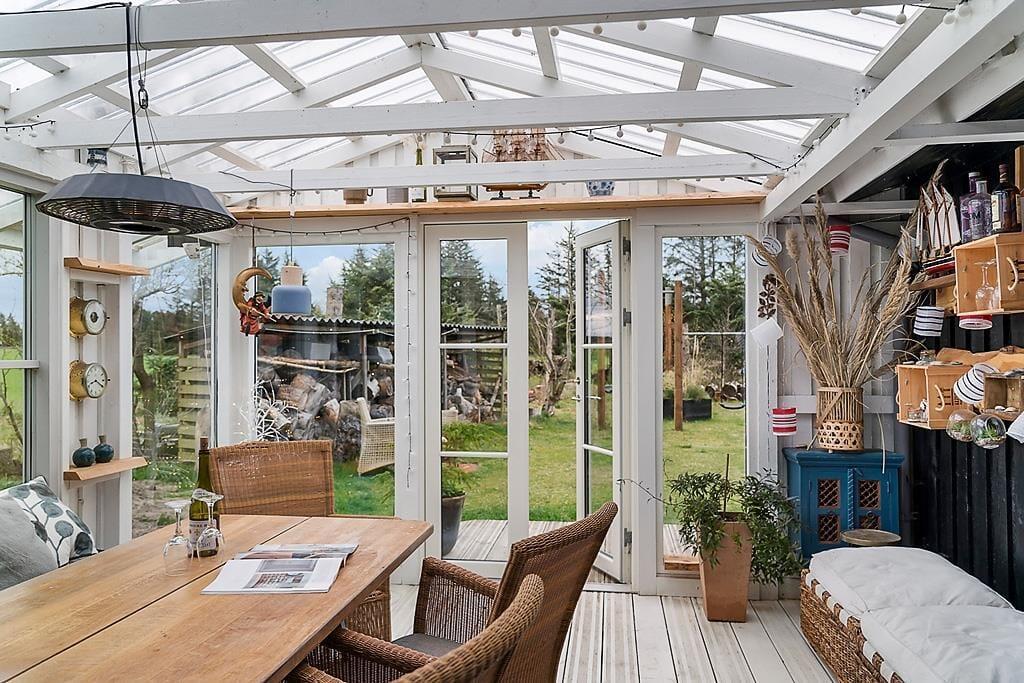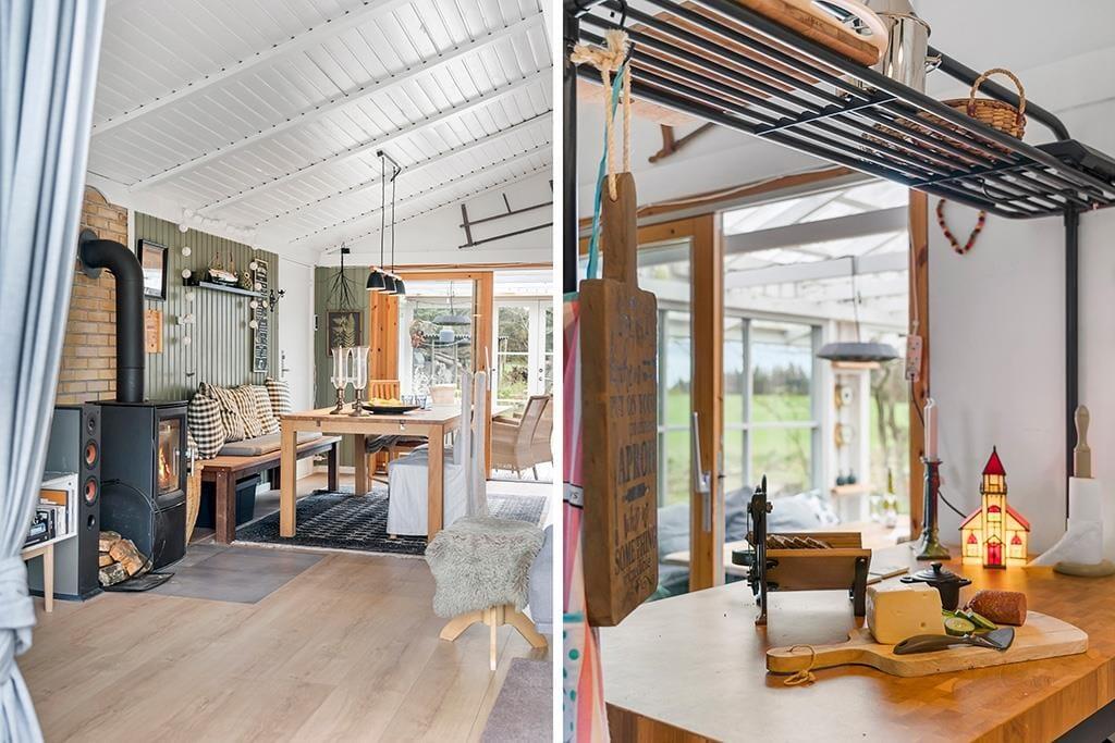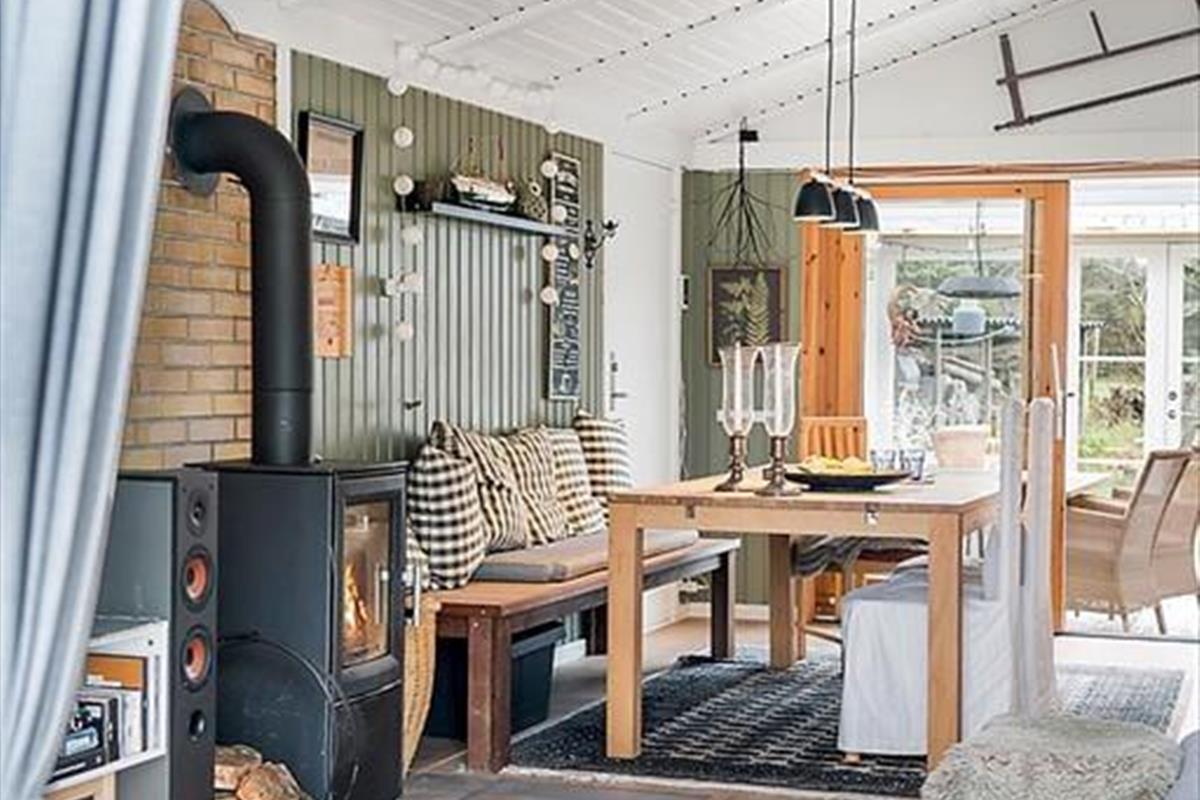 Beim Betreten des Ferienhauses wirst du von einer hellen und geräumigen Einrichtung begrüßt, die sowohl zu Gemütlichkeit als auch zum gemeinsamen Beisammensein einlädt. Das offene Wohnzimmer mit Kaminofen sorgt für eine warme und behagliche Atmosphäre, in der du dich mit einem guten Buch entspannen oder nach einem aktiven Tag einen Film anschauen kannst. Der schöne Wintergarten ist ein weiteres gemütliches Zimmer und perfekt für Entspannung – sei es für eine Tasse Kaffee am Morgen, zum Lesen oder einfach, um auf das große Grundstück zu schauen. Die Küche ist funktional und einfach zu bedienen, sodass du beim Kochen und Genießen von Ferienmahlzeiten in guter Gesellschaft viel Spaß haben wirst.