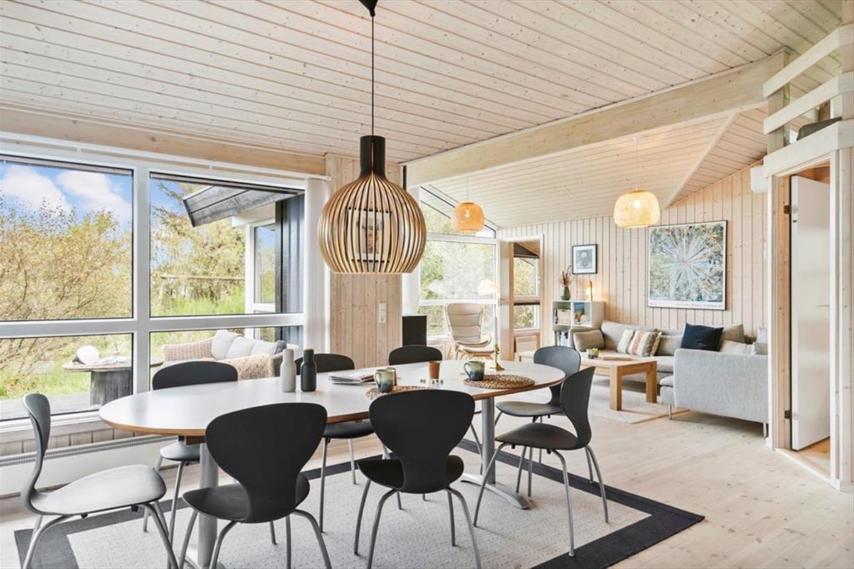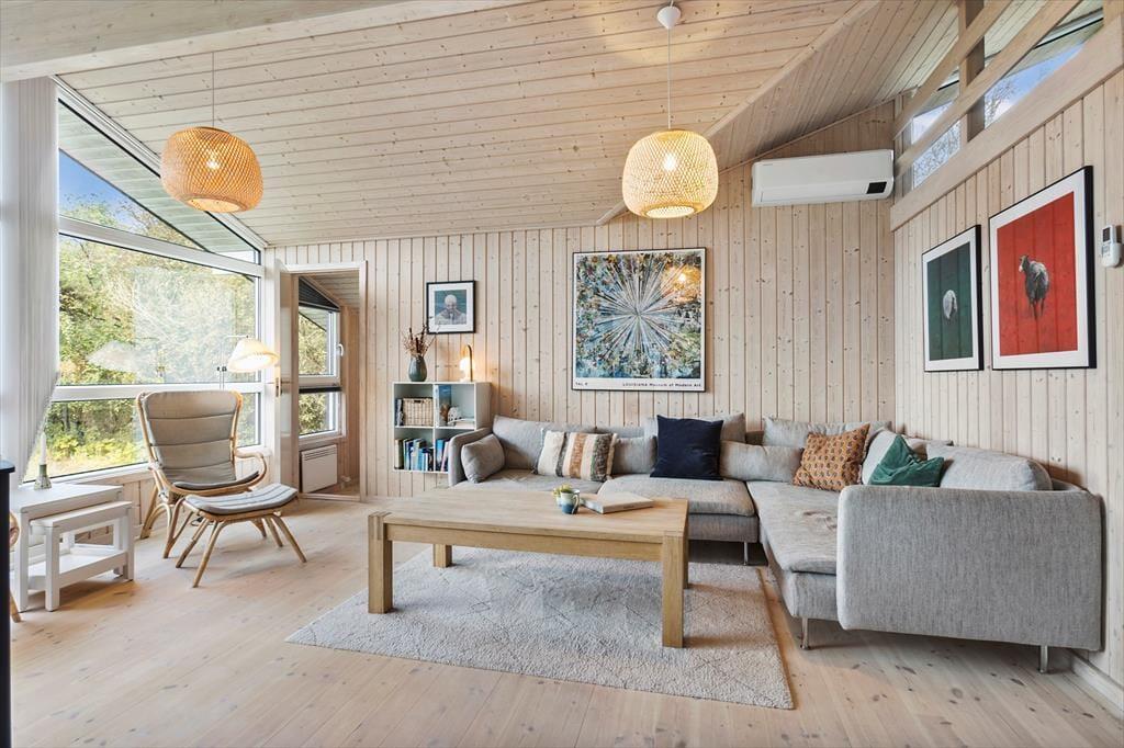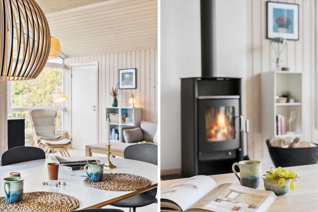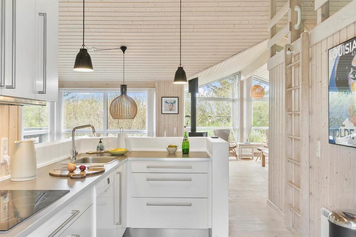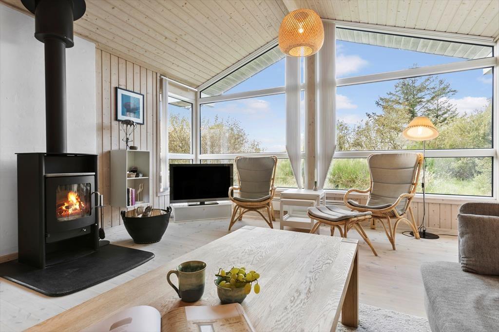 Die Einrichtung des Ferienhauses ist hell und freundlich, und in den geräumigen Wohnräumen wurde viel Wert auf Details gelegt. Das Wohnzimmer und die offene Küche bilden den natürlichen Mittelpunkt des Hauses, wo du deine Mahlzeiten genießen oder dich mit einem guten Buch am Kamin entspannen kannst. Das Haus bietet Platz für sechs Personen, verteilt auf vier gemütliche Schlafzimmer, die nach einem erlebnisreichen Tag zu einer erholsamen Nachtruhe einladen. Die Küche ist gut ausgestattet, sodass du mühelos alles vom Frühstück bis zum Abendessen in heimischer Atmosphäre zubereiten kannst. Große Fensterfronten bieten dir zudem einen wunderschönen Blick auf die umliegende Natur.
