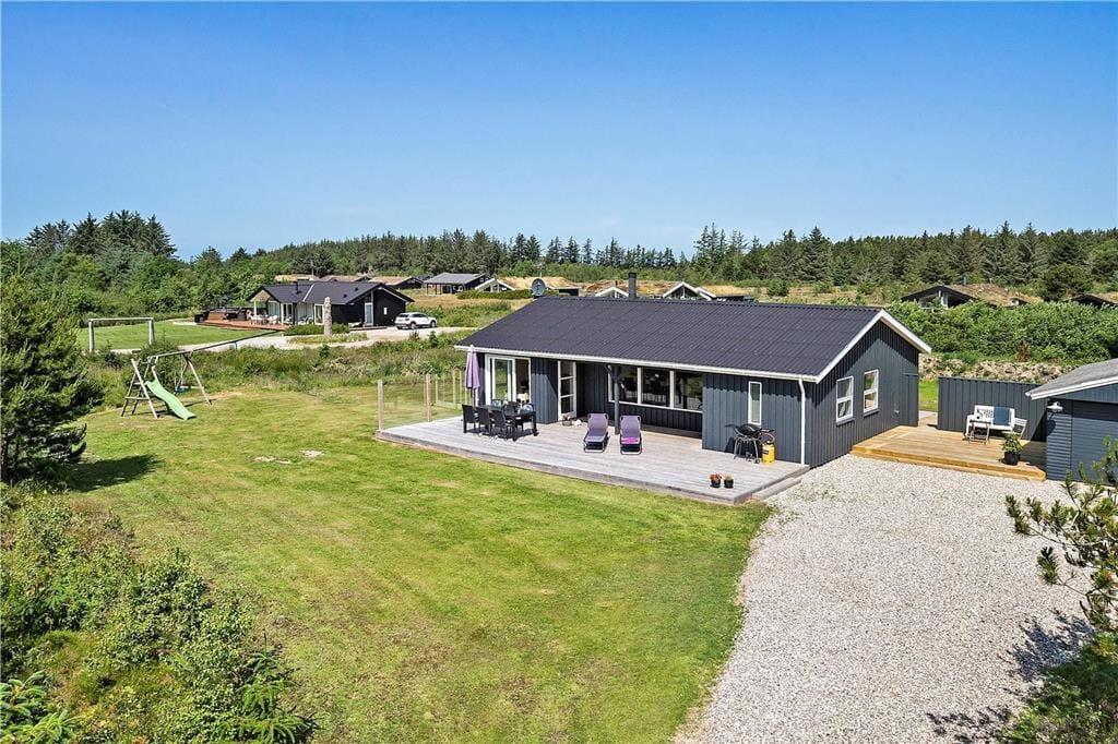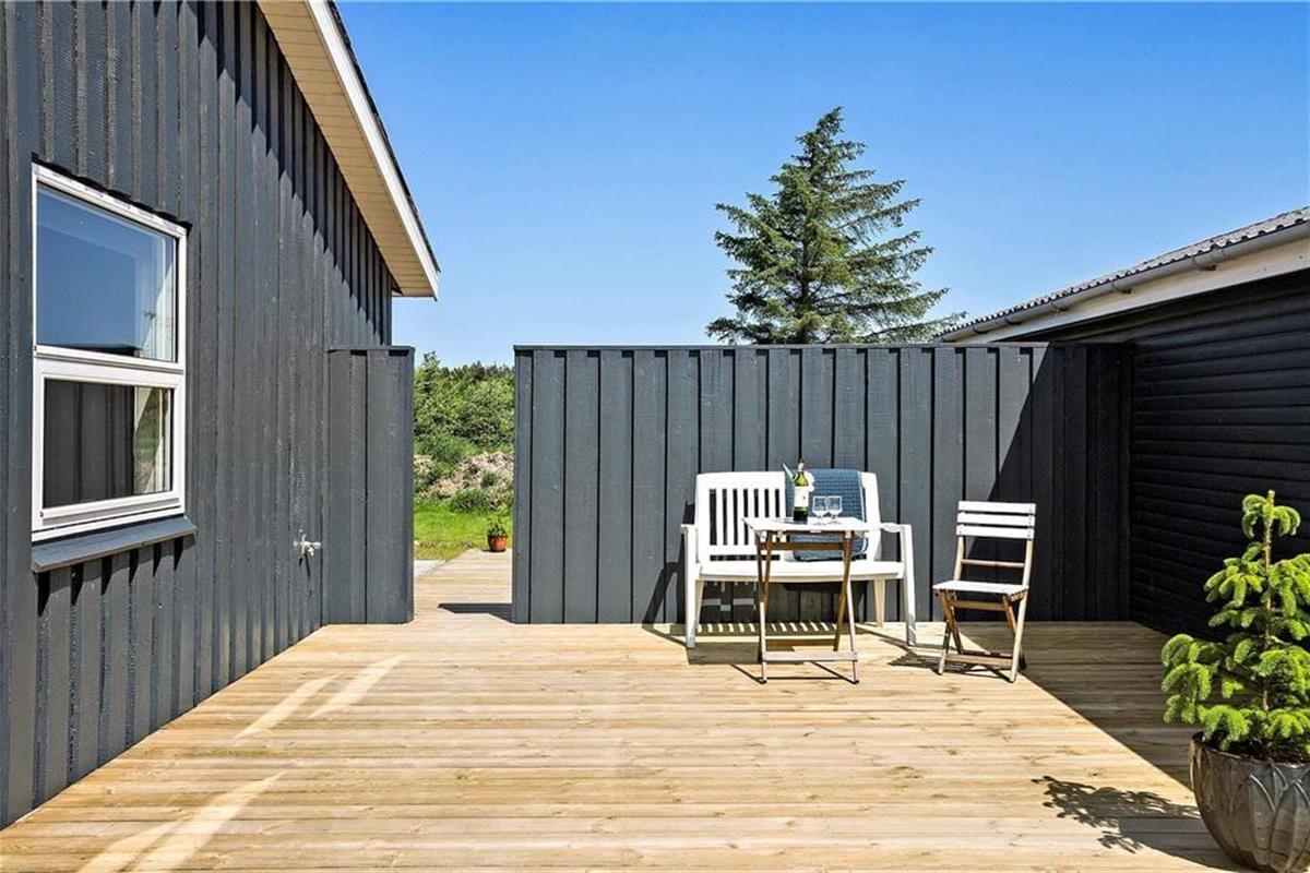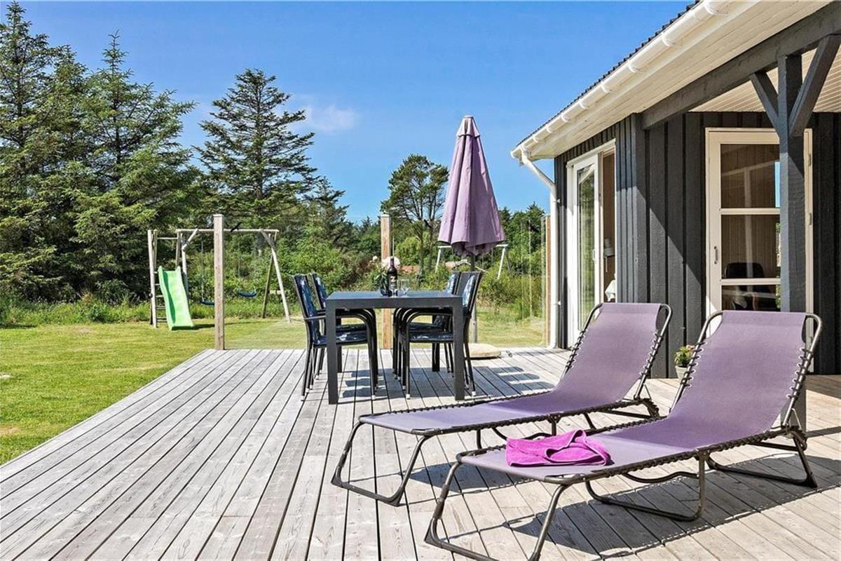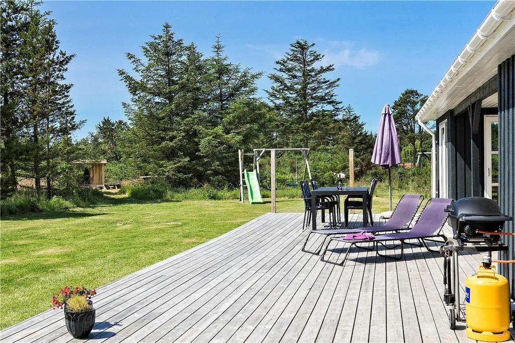 Vom Wohnzimmer und der Küche aus gelangt man auf die Terrasse, die angenehm abgeschirmt ist und einen schönen Blick auf den Garten bietet, der mit einer Schaukel und einem Sandkasten ausgestattet ist. Das Ferienhaus liegt in einer ruhigen Ferienhaussiedlung und ist ideal für alle, die sich etwas mehr Platz zum Spielen und Entspannen wünschen.
