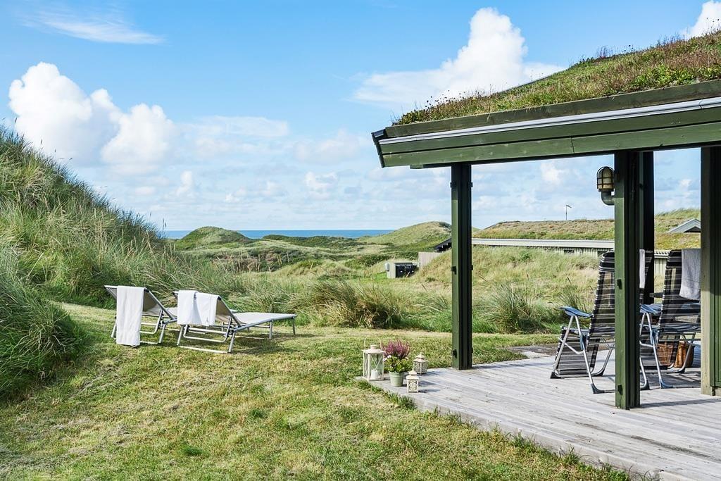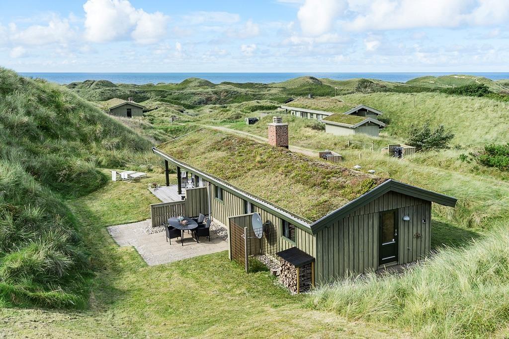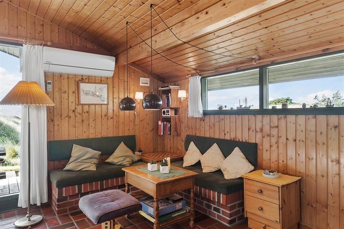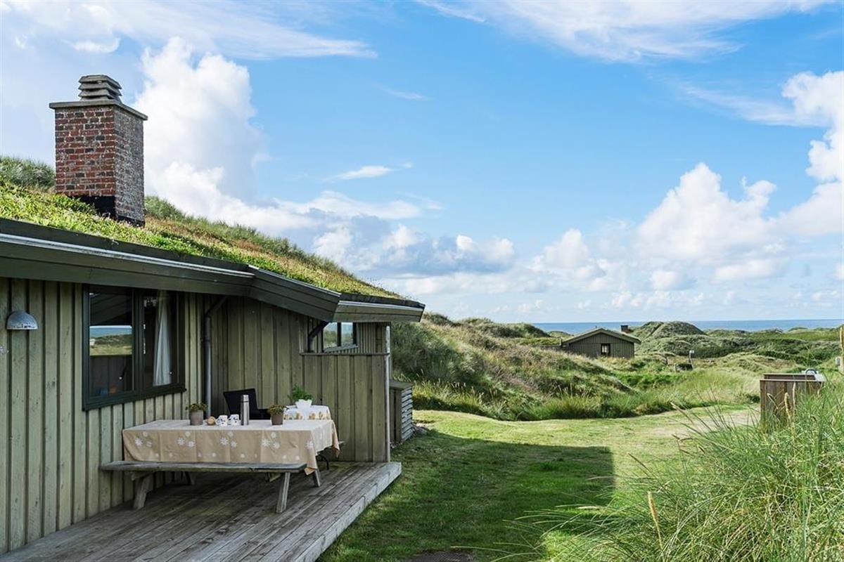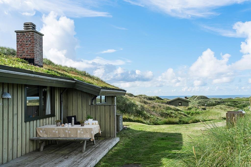Bei diesem, aus dem Jahr 1975 stammenden Ferienhaus, wurde der für damalige Zeit typische Stil in netter Art und Weise bewahrt. Die Holzwände, der rote Ziegelsteinboden, das auf Mauersteinen befindliche Sofa, die klassischen Fliesen im Bad und die teilweise noch original aus den Siebziger Jahren stammenden Möbel, dürften passionierten Dänemarkurlaubern noch bekannt vorkommen. Alles im Haus ist gepflegt und voll funktionstüchtig. Durch die sechs Schlafplätze eignet sich dieses Haus auch für eine größere Familie. Dieses Ferienhaus verfügt über drei Schlafräume, ein Badezimmer mit Dusche, eine Küche und einen Wohnraum mit einer ganz fantastischen Aussicht über die Dünen und die nur 300 Meter entfernte Nordsee. An kühleren Tagen können Sie den Kaminofen anheizen und den Tag ganz gemütlich mit einem guten Buch, einem Kartenspiel und einem warmen Kakao genießen. Für alle Ferienhäuser in diesem Gebiet gibt es strikte Auflagen. So müssen die Häuser beispielsweise mit einem Grasdach versehen sein, damit sie sich nahtlos in die traumhaft schöne Natur einfügen. Sollten Sie im Urlaub Wert auf Luxus und eine moderne Ausstattung legen, so ist dieses Ferienhaus nicht für Sie geeignet. Wenn allerdings Ruhe, Erholung, traumhafte Natur und die typische gemütliche Urlaubsstimmung für Sie die Hauptkriterien sind, so ist dieses Objekt die perfekte Wahl.