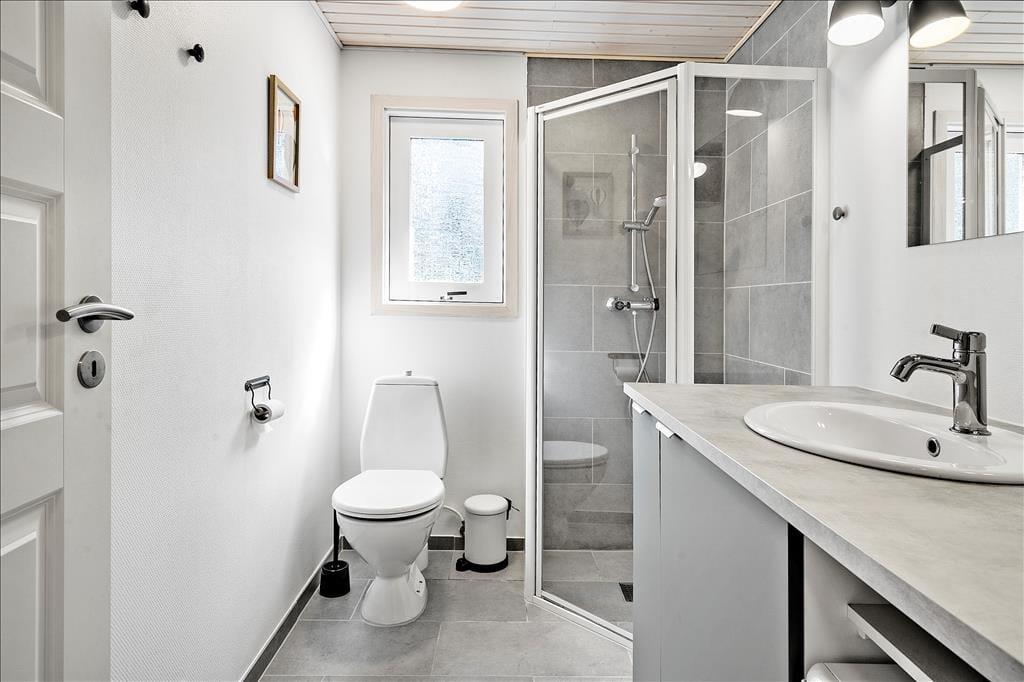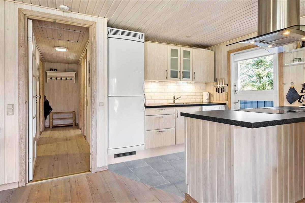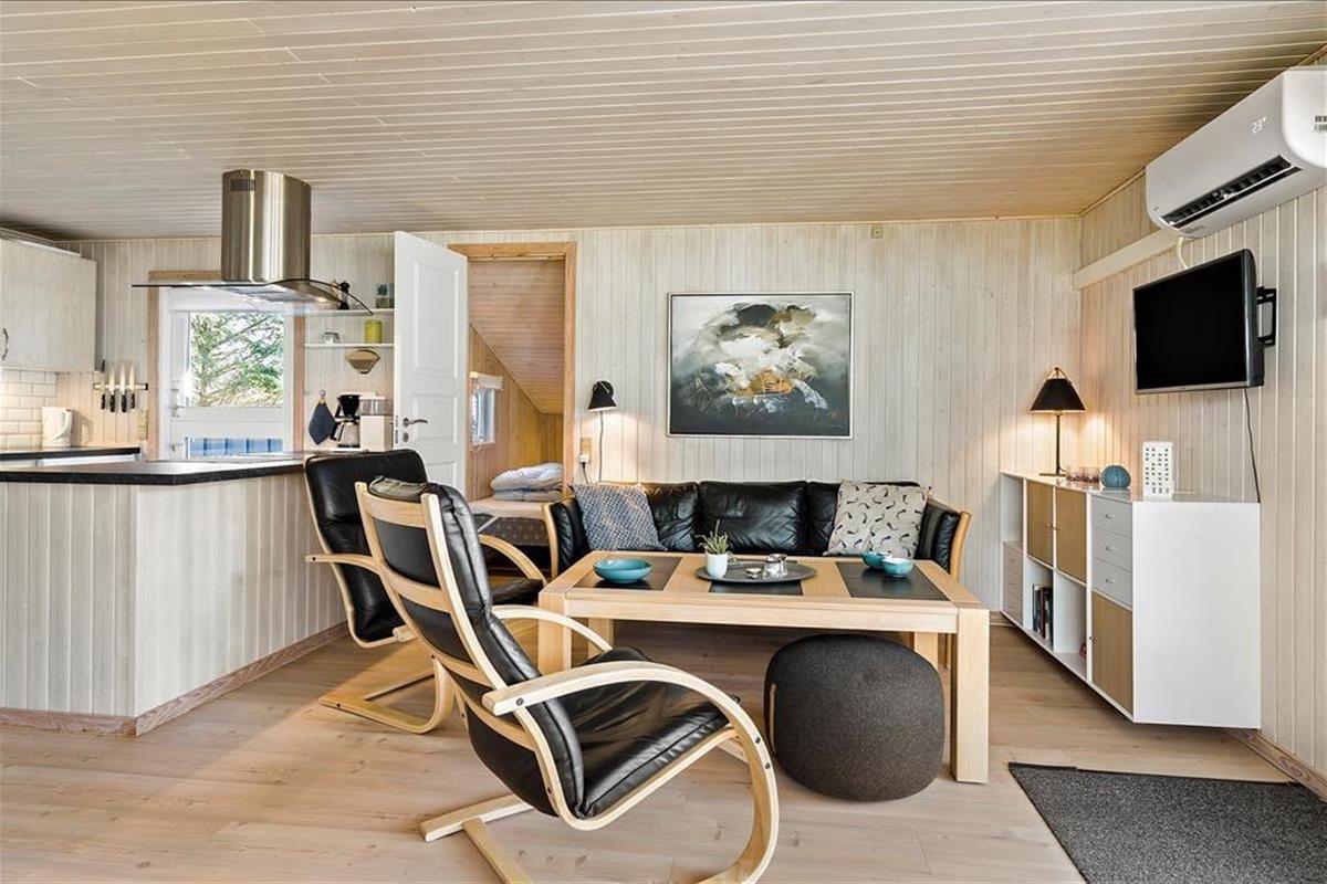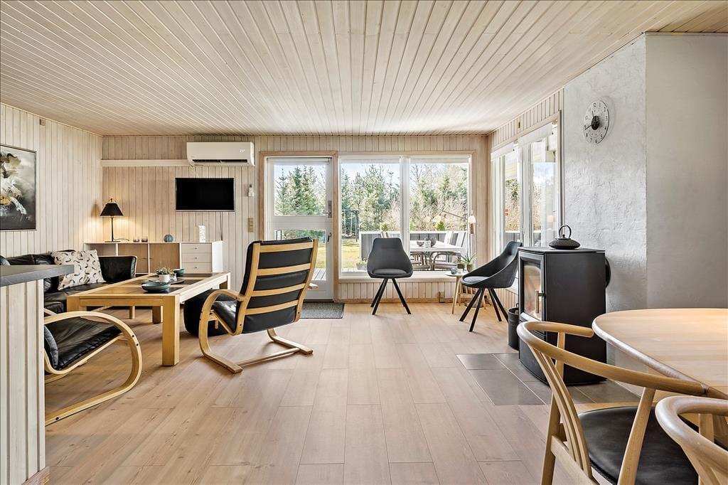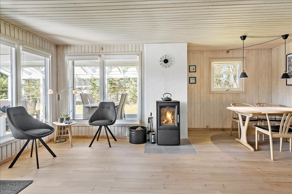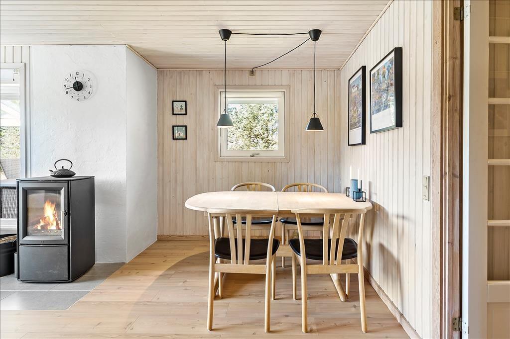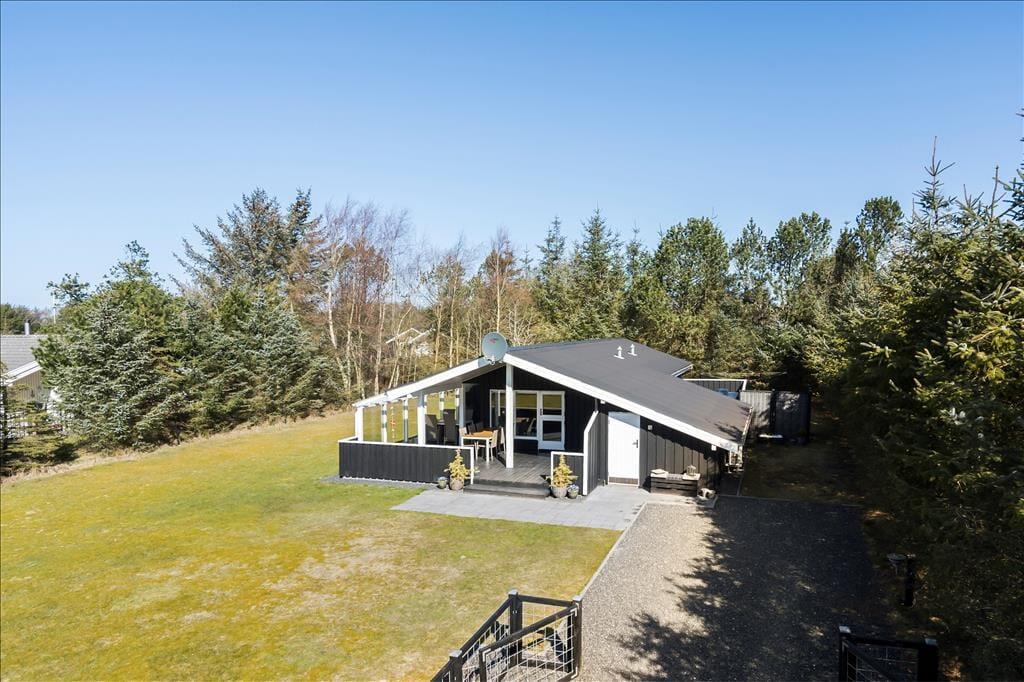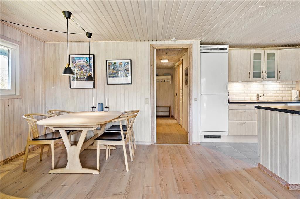 Dieses im Jahre 1985 erbaute Ferienhaus wurde im Laufe der Jahre gehegt und gepflegt, sodass es auch heute noch ein sehr schönes Urlaubsdomizil darstellt. Im Haus befinden sich vier Schlafräume, ein Badezimmer und ein offener Küchen- und Wohnbereich. Hier kann sich Ihre gesamte Familie versammeln, um gemeinsam zu essen oder um es sich auf den Sofas vor dem Kamin gemütlich zu machen. Zwei der Schlafräume sind mit einem Doppelbett ausgestattet. In den anderen beiden Räumen befinden sich zwei Einzelbetten. o können Sie ganz nach Belieben Ihren Schlafplatz wählen. Drei der Zimmer gehen von einem kleinen Flur ab, der durch eine Tür vom Wohnbereich abgetrennt werden kann. Insbesondere wenn Sie mit kleinen Kinder reisen, ist dies von Vorteil, da die Kinder abends nicht durch Geräusche aus dem Wohnbereich oder der Küche gestört werden. Das Ferienhaus verfügt über einen Geschirrspüler, Parabolempfang mit ausländischen und dänischen Sendern, sowie über einen drahtlosen Internetzugang. Vergessen Sie bitte nicht Ihr Laptop oder Tablet! Der Wohnbereich verwöhnt Sie aufgrund der großen Fenster mit einem wunderbaren Lichteinfall. In diesem ansprechenden und gepflegten Rahmen werden sich sowohl Familien als auch Paare sehr wohl fühlen und schnell einleben.