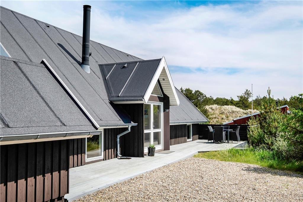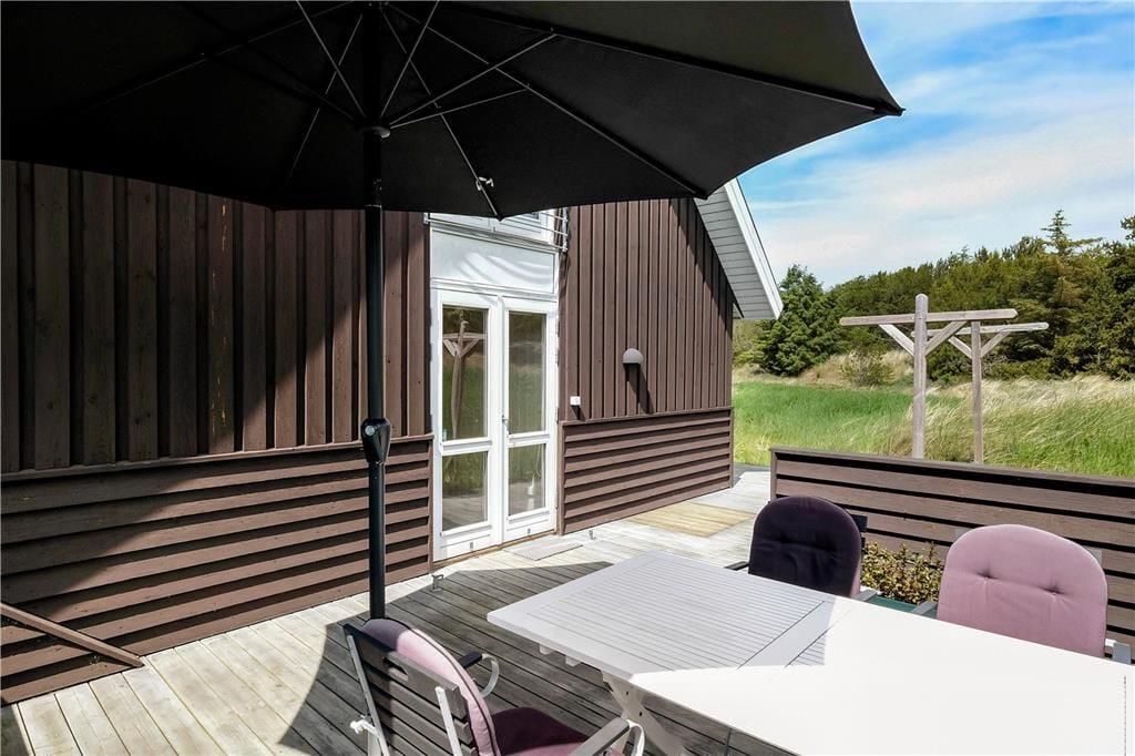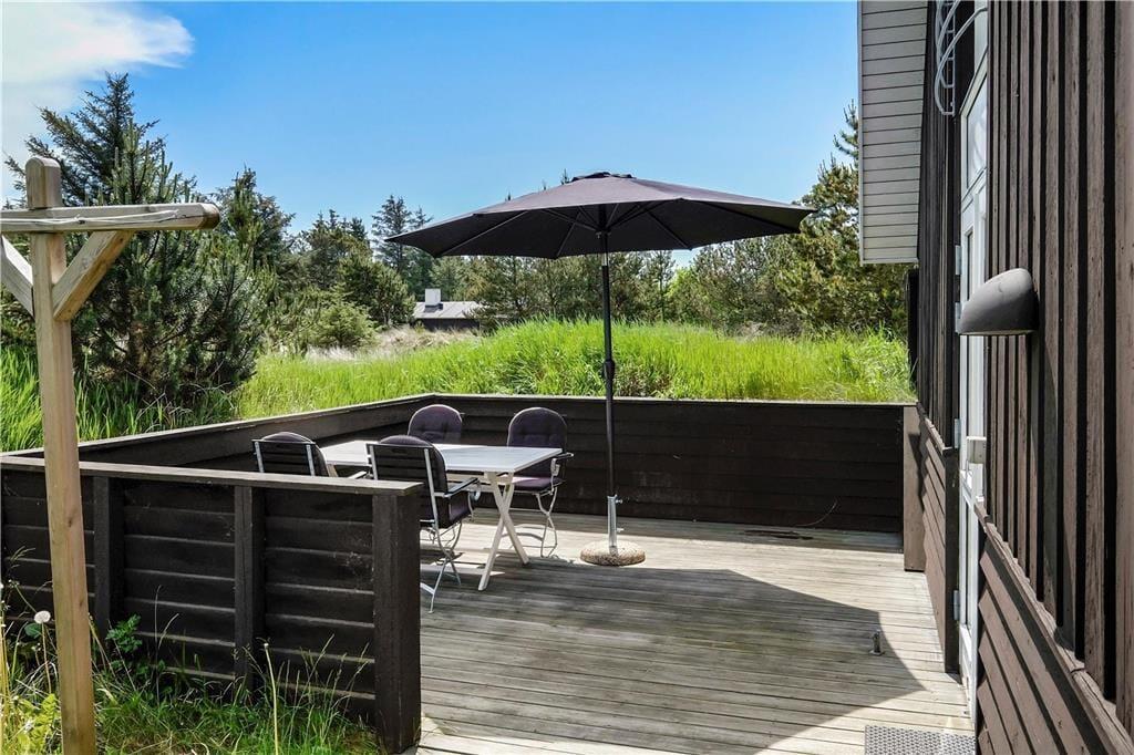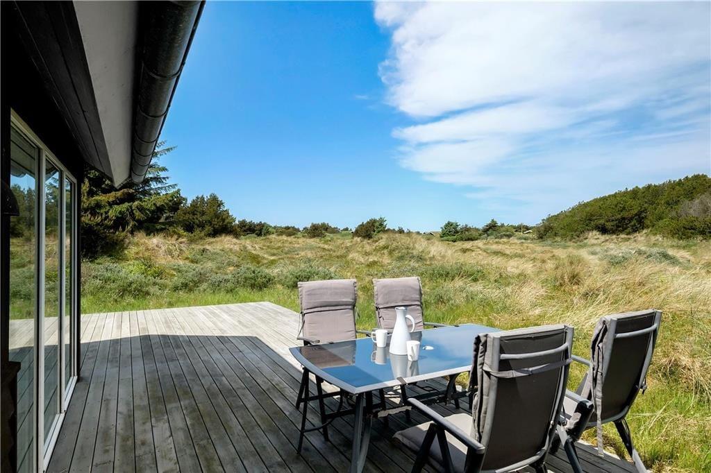 Das Ferienhaus liegt auf einem großen Naturgrundstück und ist durch höhere Bäume und die kleinen vorgelagerten Dünen schön geschützt. Die große, schöne Holzterrasse erstreckt sich rund um das Haus. Ihnen bietet sich demnach die Möglichkeit, die Sonne nahezu rund um die Uhr zu genießen. Selbstverständlich stehen unseren Gästen Gartenmöbel, Liegestühle und ein Sonnenschirm zur Verfügung. Sofern das Wetter mitspielt, steht also vielen wunderbaren Stunden im Freien nichts im Wege.