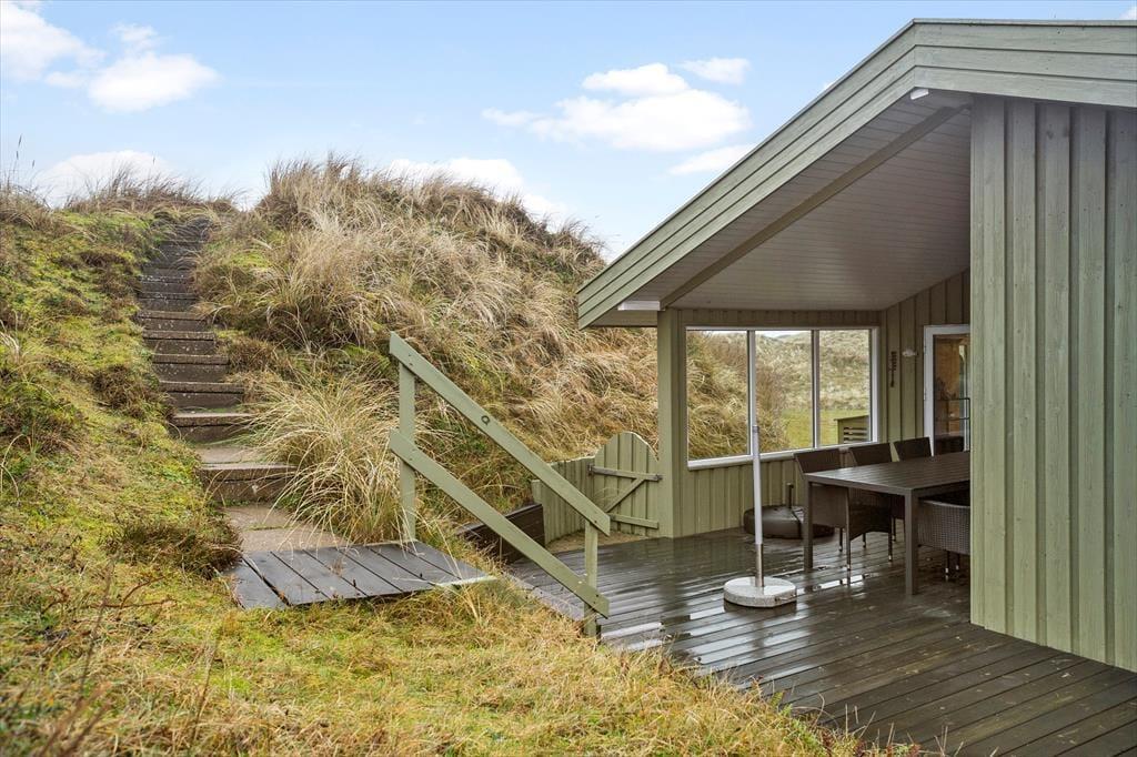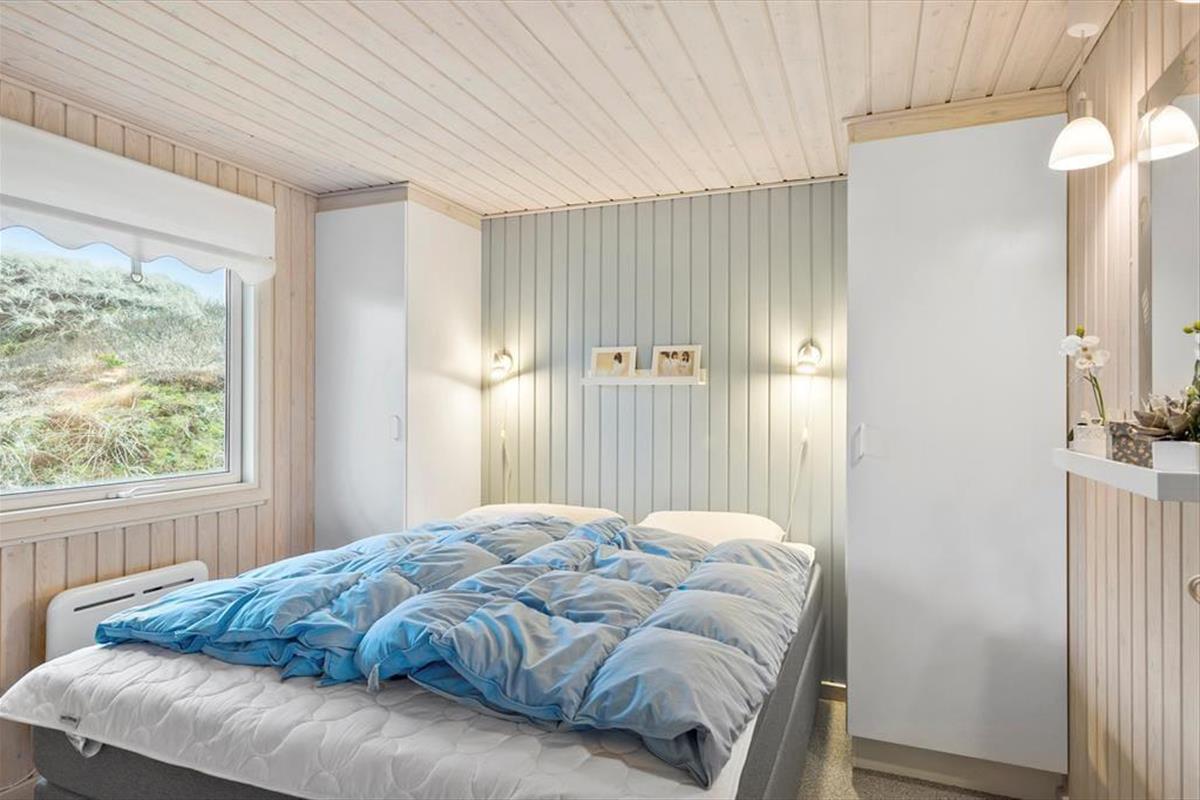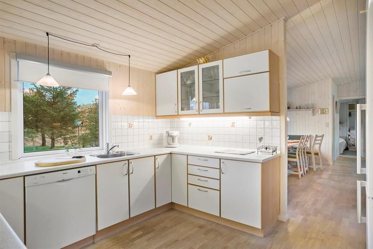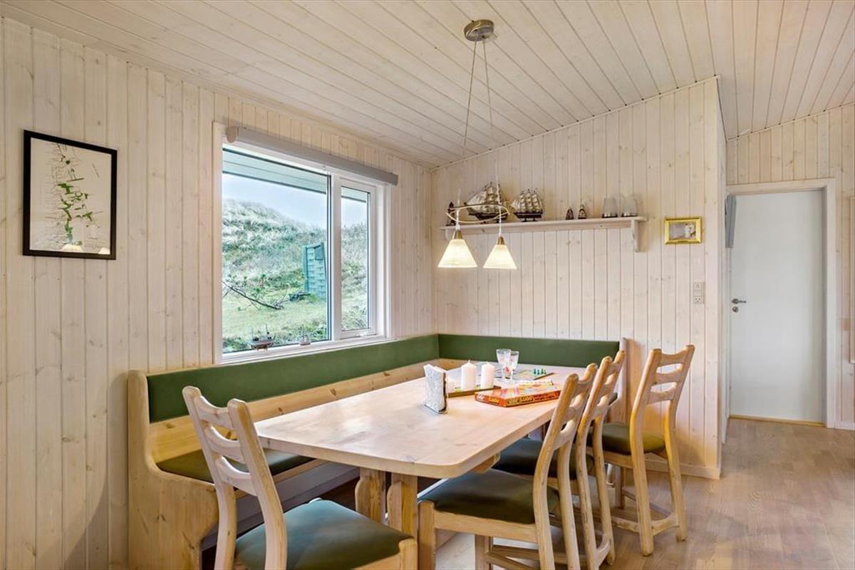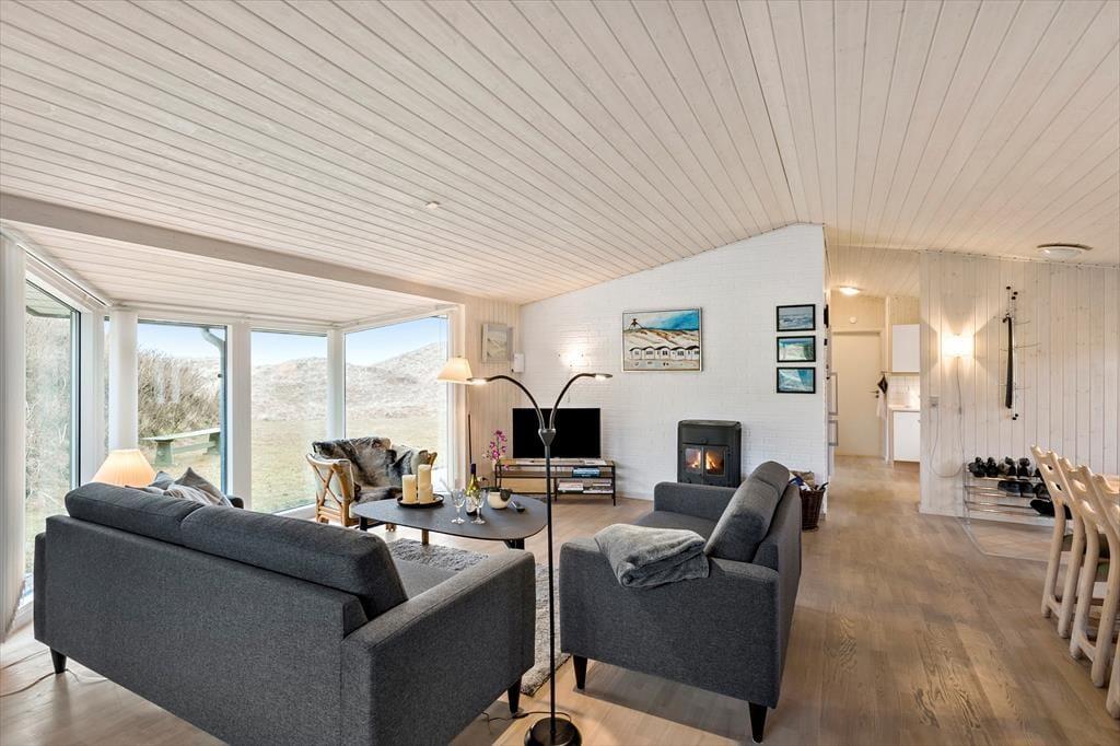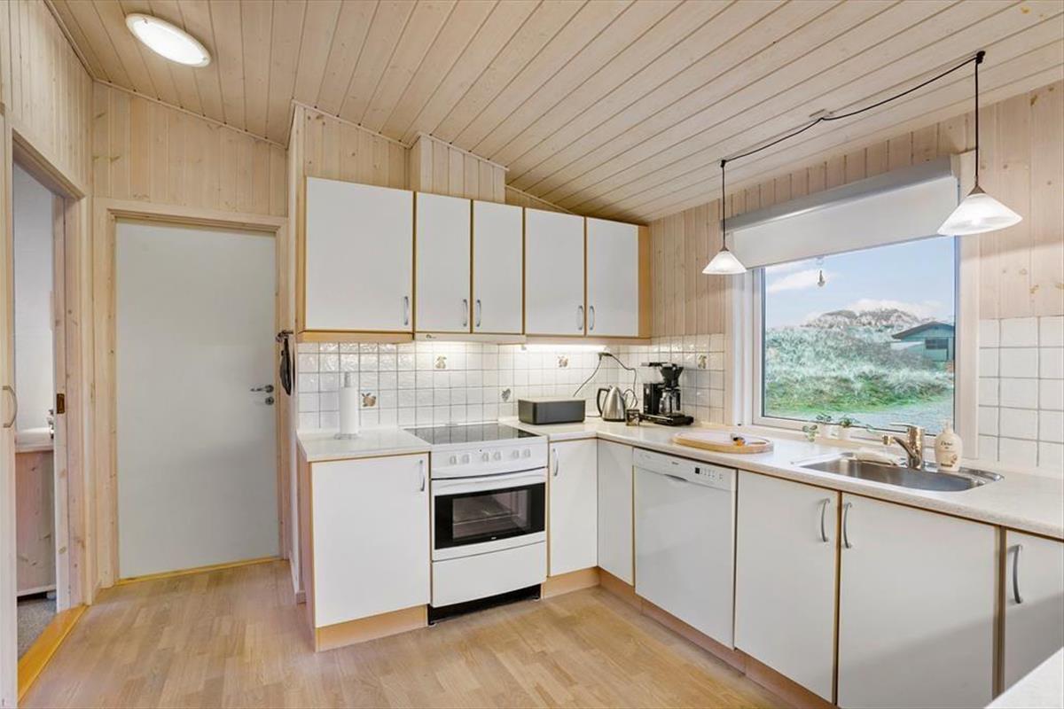 Das 117 m² große Ferienhaus besticht mit seiner attraktiven Lage am Ende des kleinen Wegs Koglevej, in der ersten Reihe vor einem Naturschutzgebiet, das Sie mit atemberaubenden Aussichten verwöhnt. Vom Vorbau des Wohnraums blicken Sie direkt auf die Dünen - ein wunderschöner Rahmen für gemütliche Stunden. Der geräumige Wohnraum beinhaltet komfortable Sitzmöglichkeiten und einen gemütlichen Essplatz. Für Unterhaltung und angenehme Temperaturen sorgen ein Flachbild-TV mit Chromecast, ein Kaminofen und eine Wärmepumpe. Die gut ausgestattete Küche ist offen mit dem Wohnraum verbunden. Der Rest der Wohnfläche ist vier guten Schlafzimmern und einem großen Badezimmer mit einer Dusche, einer Waschmaschine, einem Wäschetrockner und einer Fußbodenheizung überlassen.