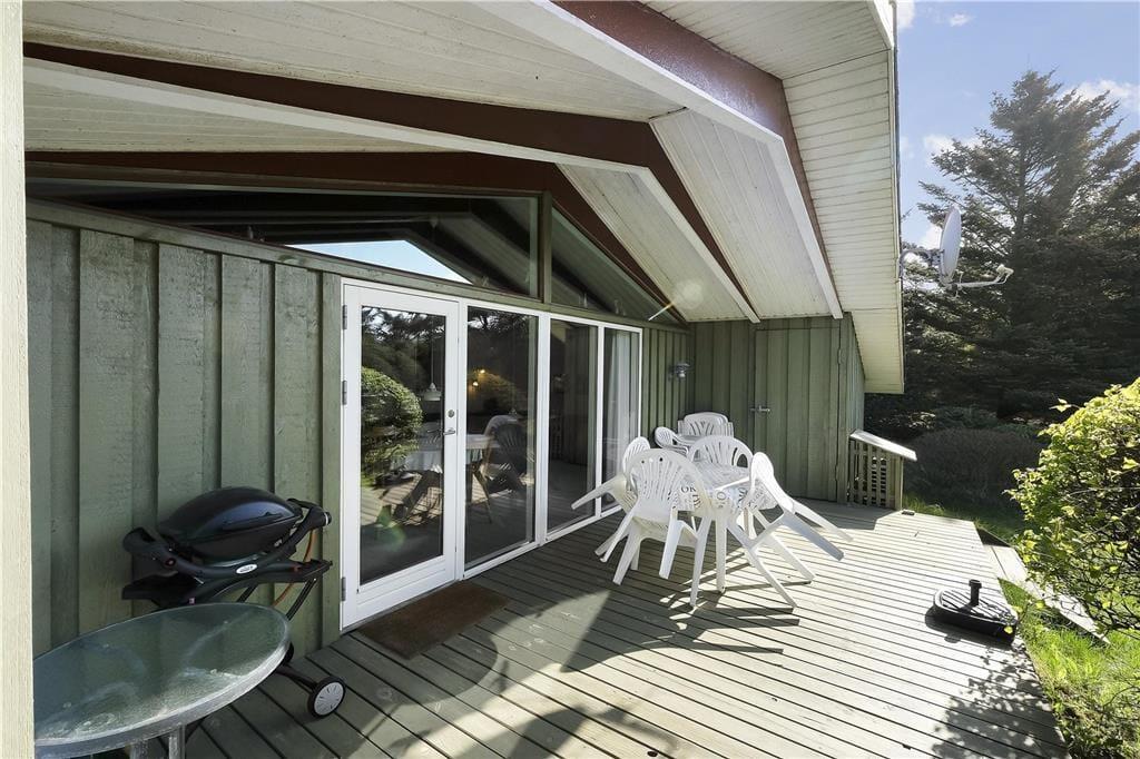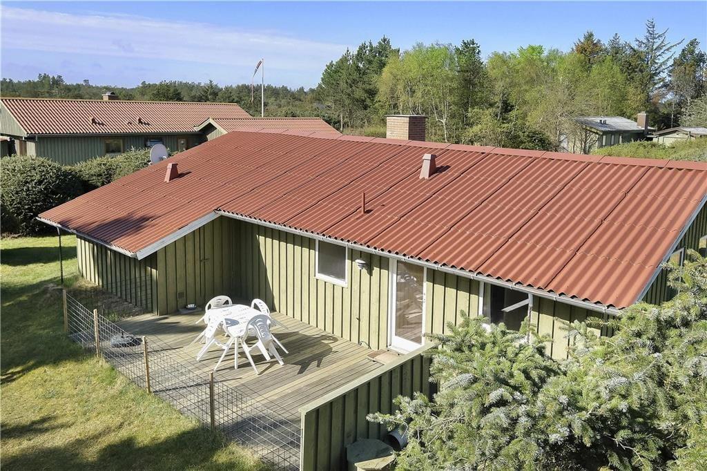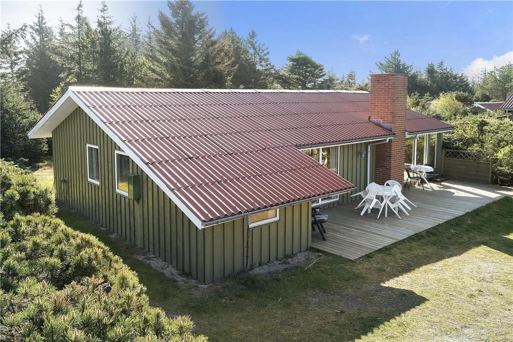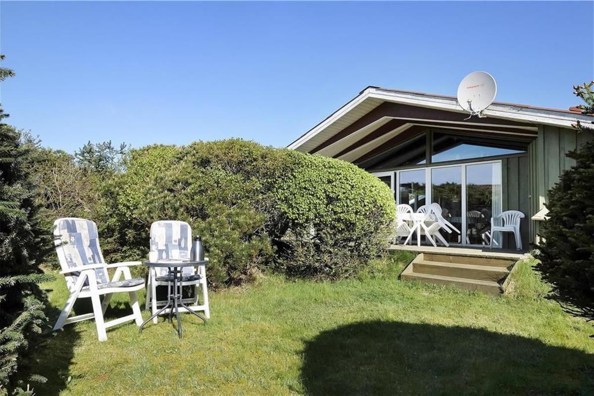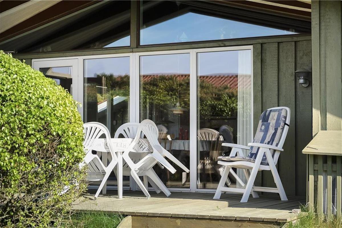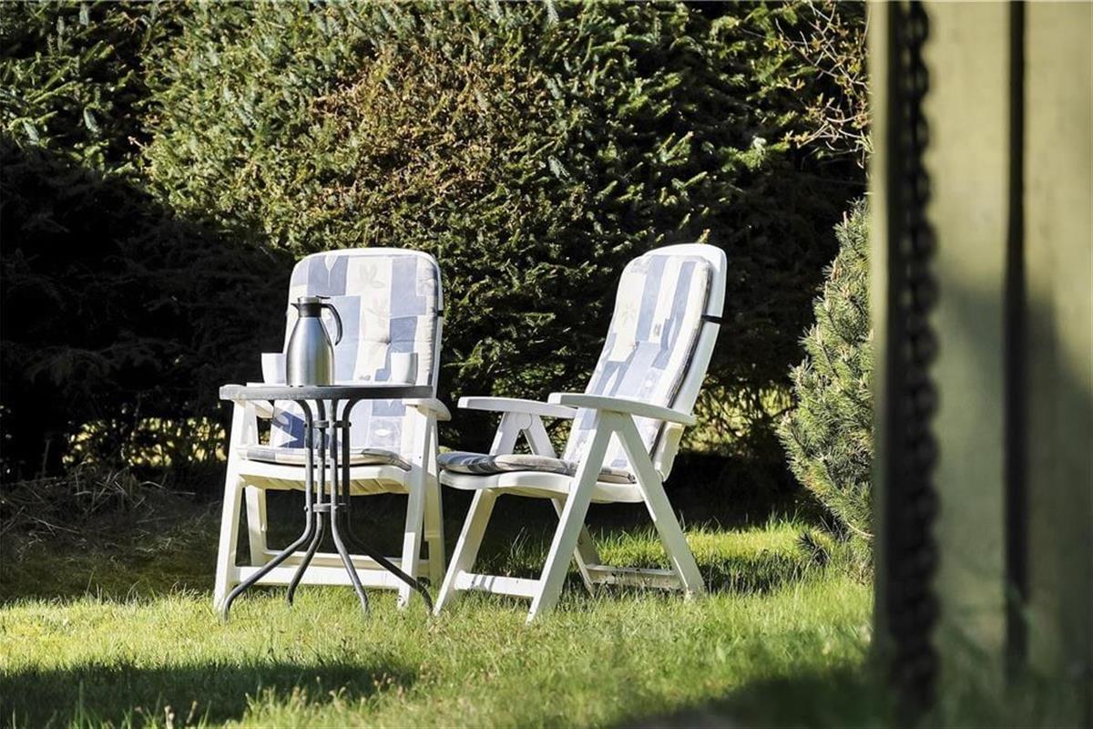 Das Haus liegt auf einem leicht hügeligen Naturgrundstück, auf einer Seite begrenzt von hohen Bäumen. Es gibt sowohl einen Sandkasten als auch eine Schaukel, sodass die Kinder draußen spielen können. Es gibt drei Terrassen, von denen die südliche überdacht ist – ideal, wenn das Wetter einmal nicht so schön ist. Alle Terrassen sind mit Gartenmöbeln und Grill ausgestattet, und eine Terrasse kann eingezäunt werden, damit Kinder oder Hunde sicher spielen können.