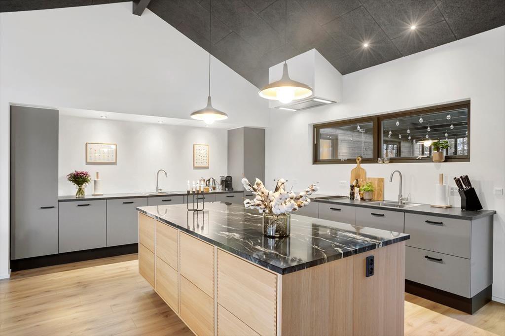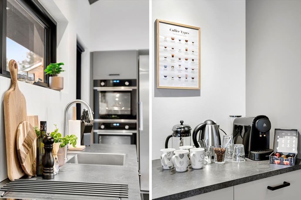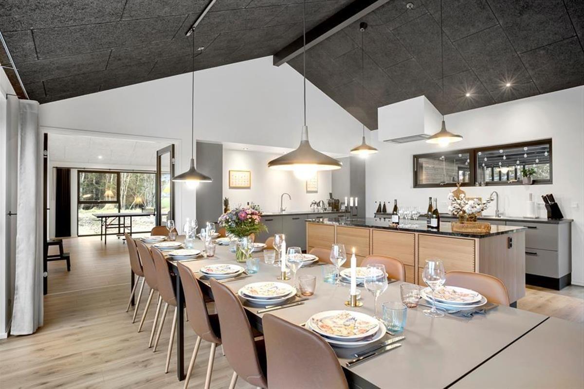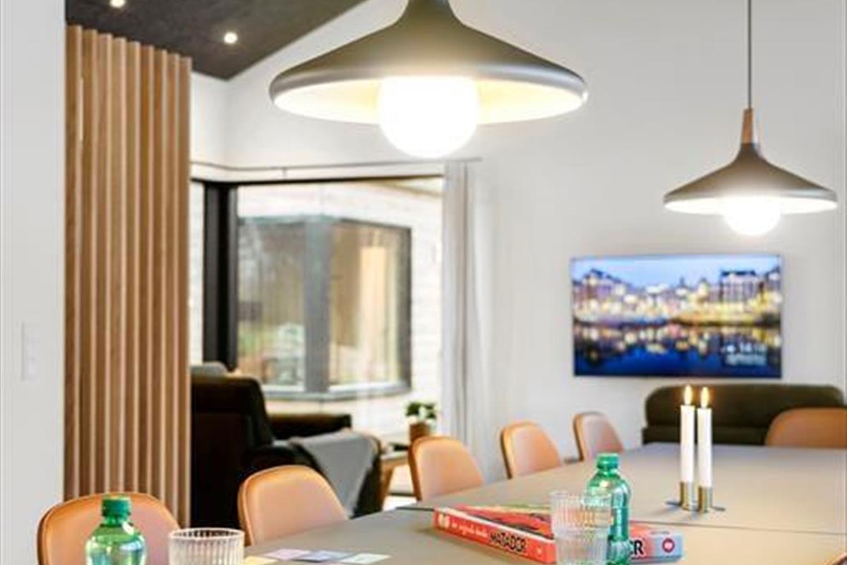 Mit Platz für 16 Erwachsene und 4 Kinder eignet sich das Ferienhaus beispielsweise gut für die Feier eines runden Geburtstags aber auch für einen gemütlichen Urlaub im Familienkreis. Das Haus wurde erst im Jahr 2024 fertiggestellt. Die Räumlichkeiten bestechen mit exklusivem Design. Dies erkennen Sie unter anderem an der großen Qualitätsküche mit einer schönen Kücheninsel, die darüber hinaus gesonderte Bereiche für die Kaffee- und die Cocktailzubereitung bietet. Mit zwei Kühlschränken, zwei Backöfen und zwei Geschirrspülern bleiben in der Küche keinerlei Wünsche offen. Gleiches gilt für die vier Badezimmer und acht Schlafräume. Selbst der Schlafboden besticht mit einer tollen Größe, die es Jung und Alt gleichermaßen ermöglicht, hier oben zu nächtigen. Der Wohnraum mit hoher Decke und der große Aktivitätsraum bieten beste Bedingungen für entspannte Momente und vergnügte Stunden.