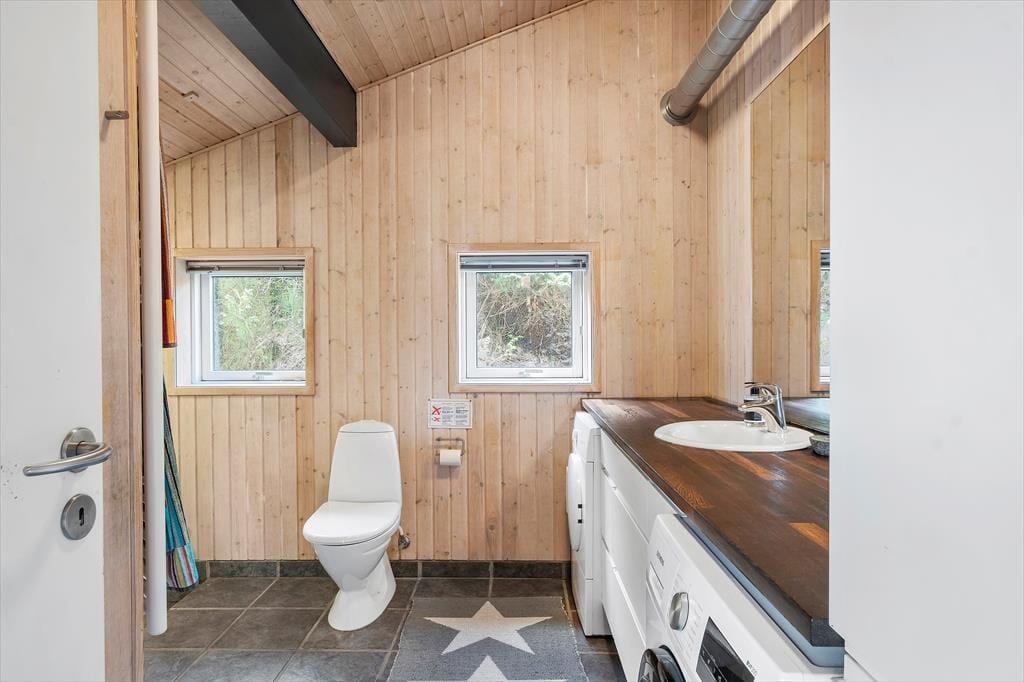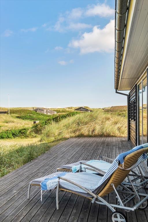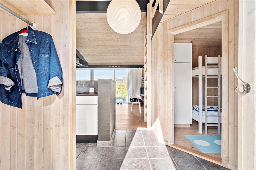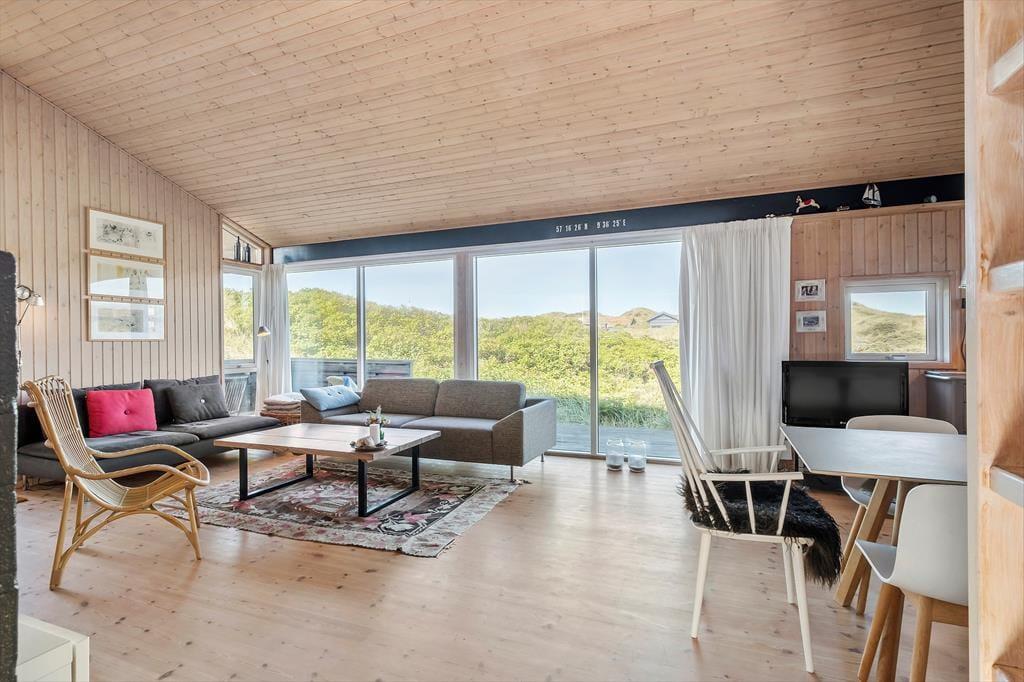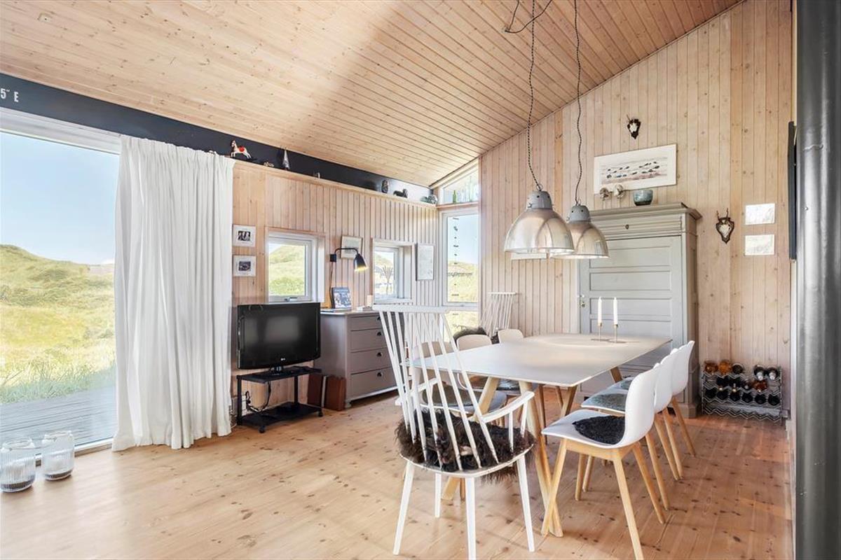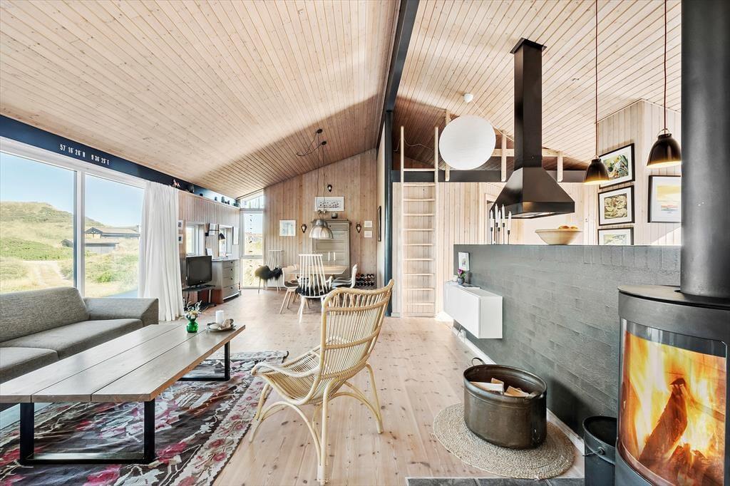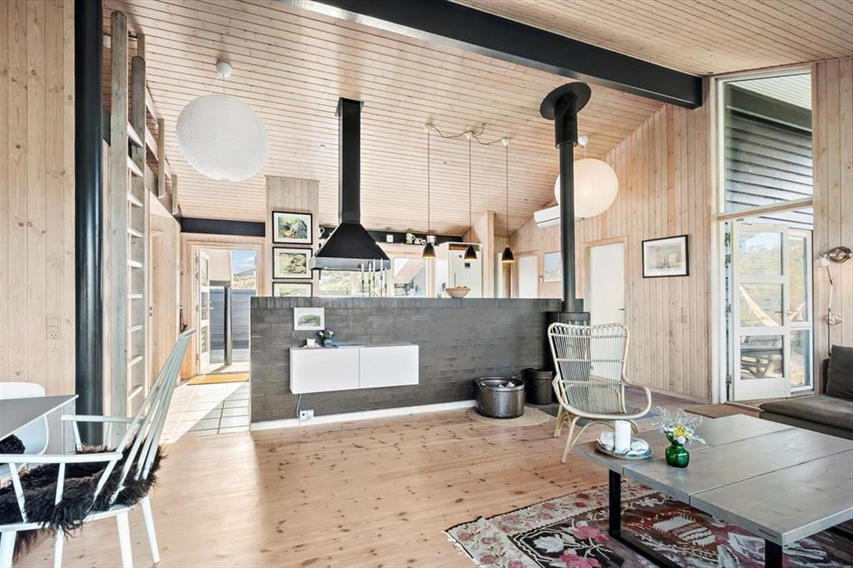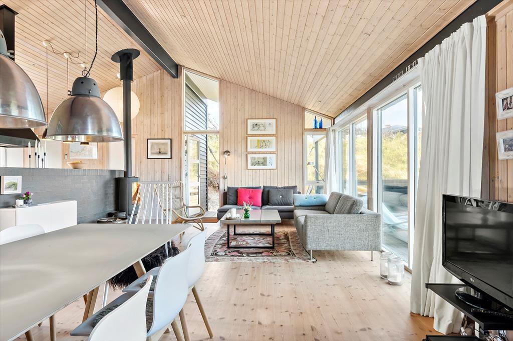 Die attraktive Natur ringsum maximiert Ihr Urlaubserlebnis. Es ist ein wirklich exklusives Gefühl, vom Wohnraum auf Heckenrosen und mit Strandhafer bewachsene Dünen zu blicken. Das Ferienhaus selber verwöhnt mit einer hellen Wohnatmosphäre, hohen Decken und einer 116 m² großen Wohnfläche. Mit drei Schlafräumen, einem Badezimmer und einem Hauswirtschaftsbereich eignet es sich gut für sechs Personen. Der Schlafboden wird sich bei Ihren Kindern großer Beliebtheit erfreuen und lädt sie zum Spielen und zum Übernachten ein. Der größte und schönste Raum des Hauses ist der Wohnraum, der mit einem durchströmenden Tageslichteinfall, einem schönen Essplatz, einer komfortablen Polstersitzgruppe und einem Gemütlichkeit spendenden Kaminofen verzaubert. Eine geräumige Küche fügt sich offen in den Wohnraum ein. Dadurch genießen Sie viel wertvolle gemeinsame Zeit im Kreise Ihrer Lieben, selbst dann, wenn Sie in der Küche die Mahlzeiten zubereiten.