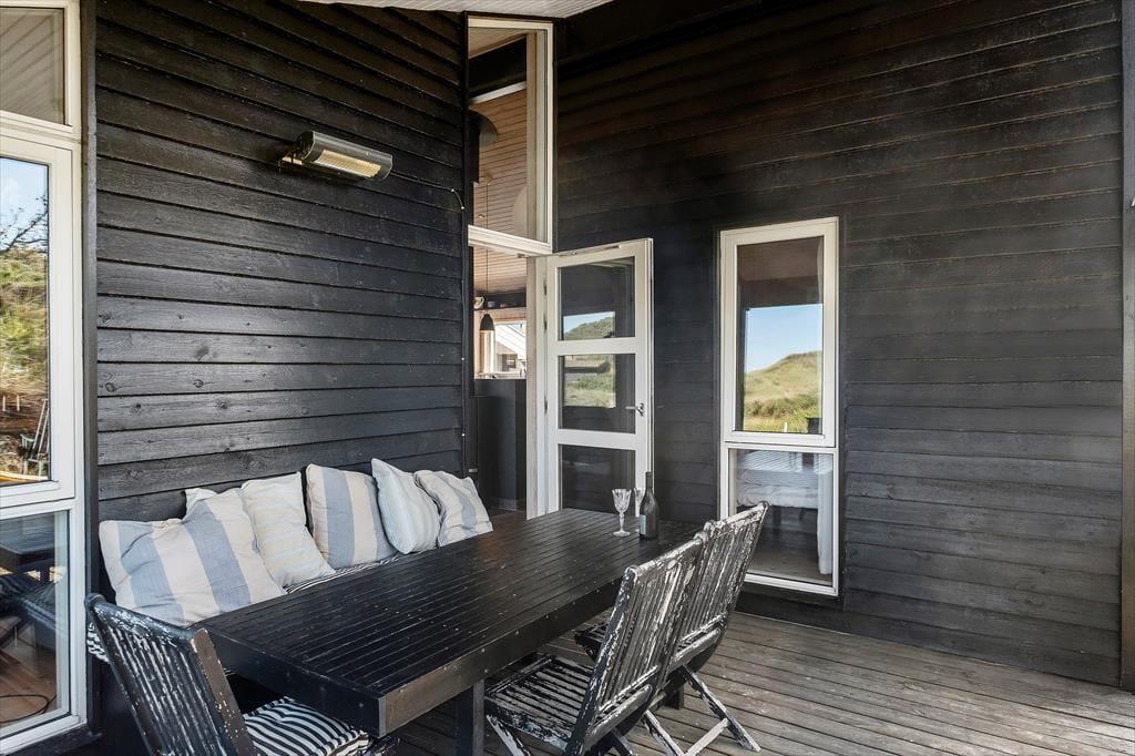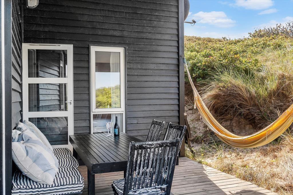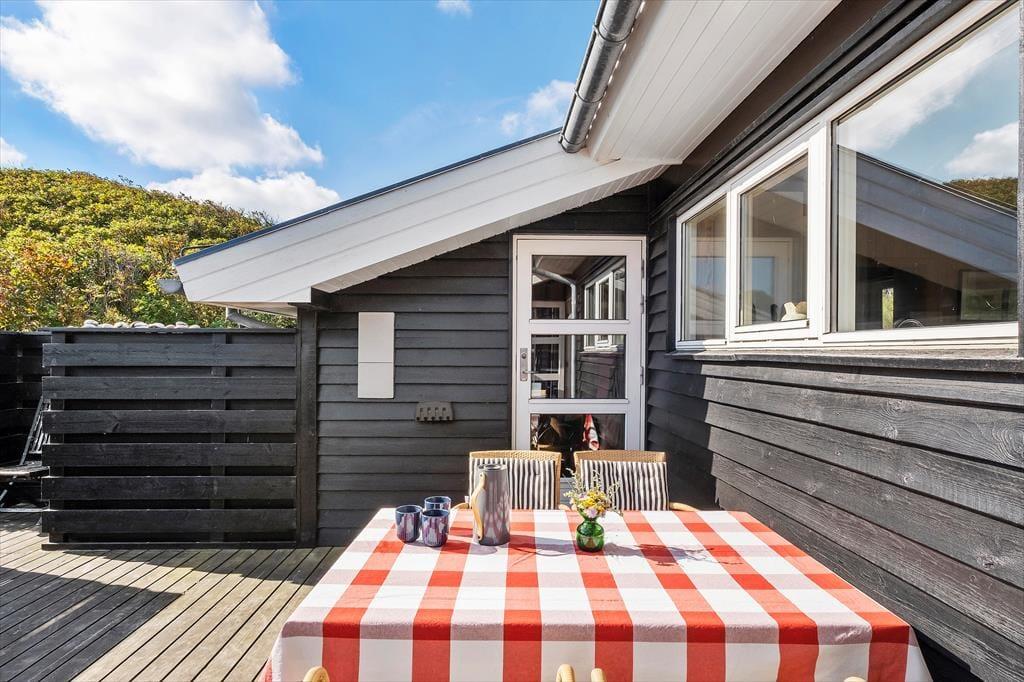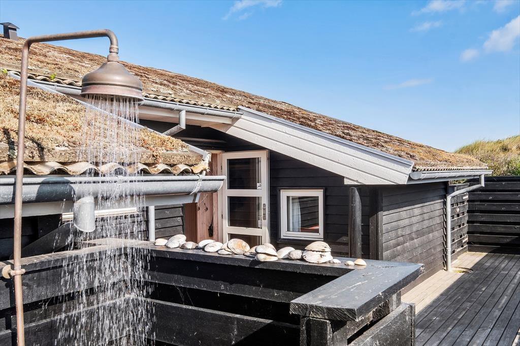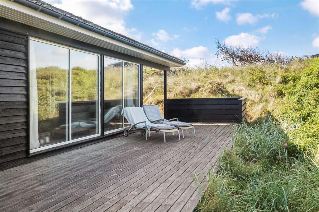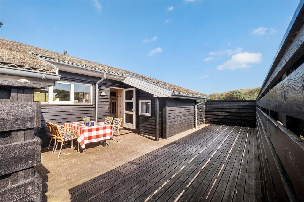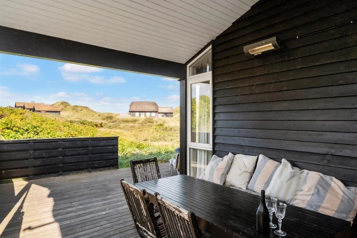Die schönen Terrassen vollenden die Urlaubsidylle. Sie können zwischen sonnigen und schattigen Bereichen wählen, auf denen Sie die herrliche Natur ringsum genießen. Die Ostterrasse, auf der eine Außendusche bereit steht, wird durch einen Zaun gut vor Wind geschützt. Die Terrasse an der Westseite des Urlaubsdomizils verfügt über einen überdachten und einen offenen Bereich und verwöhnt am Abend mit einem perfekten Ausblick auf die hinter den Dünen untergehende Sonne.