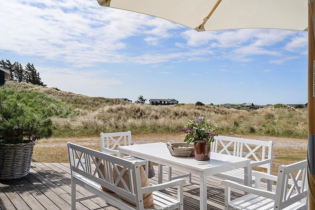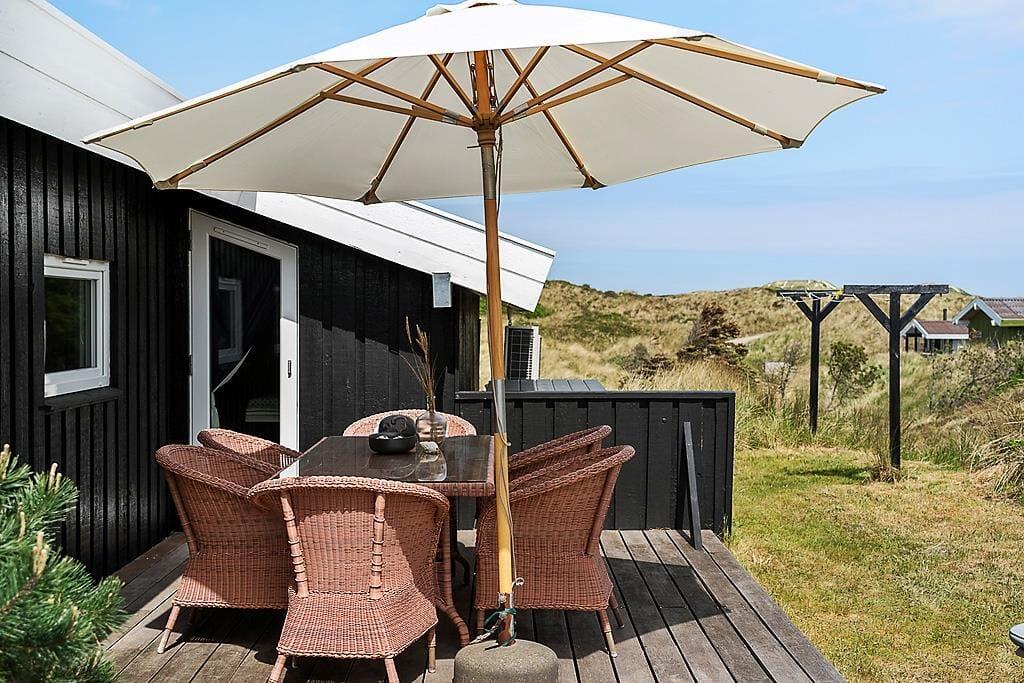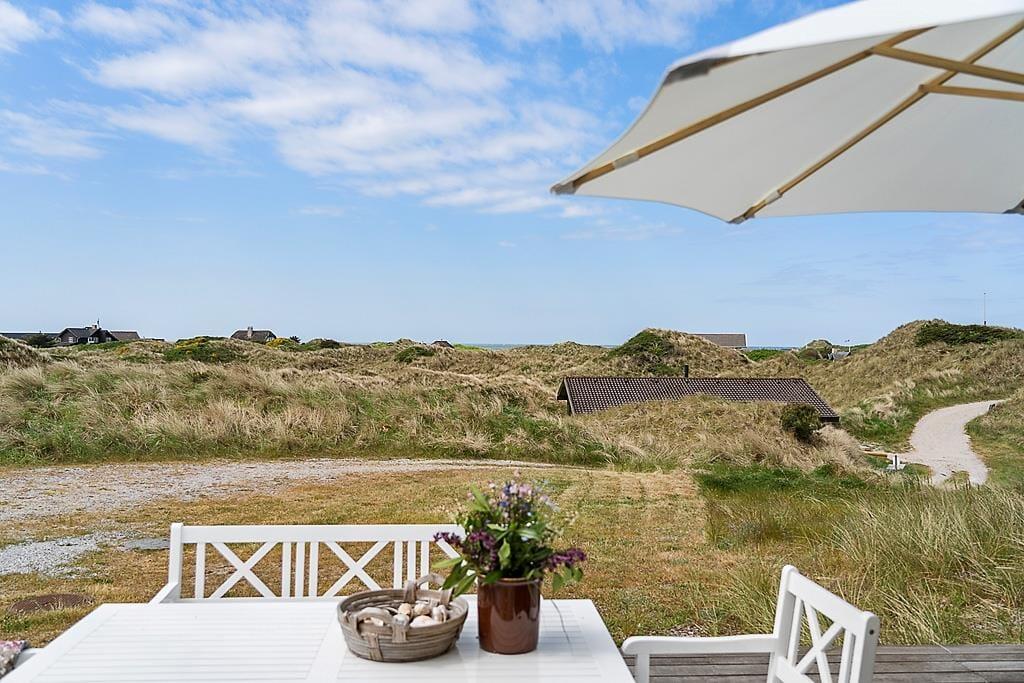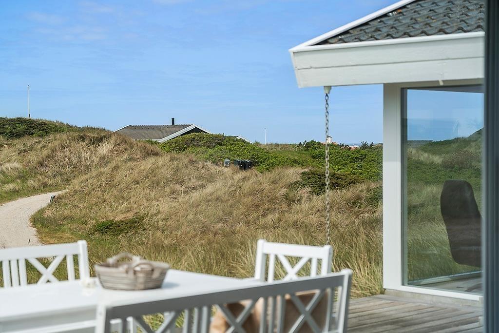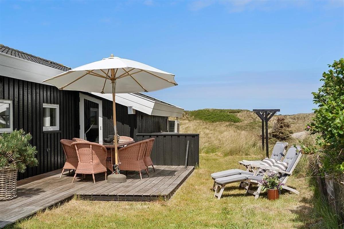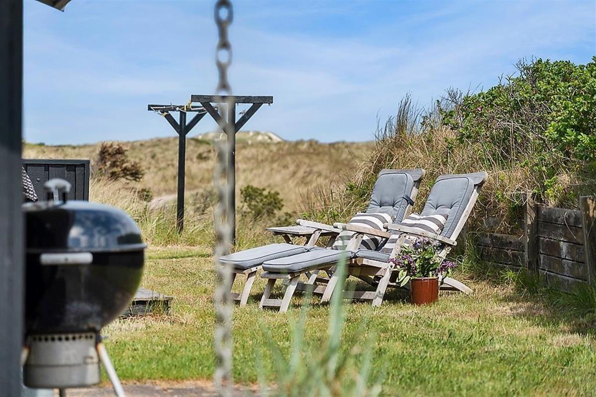 Die Umgebung rund um das Ferienhaus ist schier fantastisch. Vor dem Urlaubsdomizil ist eine große, gen Westen ausgerichtete Terrasse platziert, auf der Sie den Blick auf die sanften Dünen und den seicht im Wind wiegenden Strandhafer aus nächster Nähe genießen können - und vielleicht sogar das Meer am Horizont erblicken. Bei auffrischendem Westwind machen Sie es sich einfach auf der Ostterrasse gemütlich. Diese stellt einen weiteren schönen Aufenthaltsplatz dar und lädt mit ihren guten Gartenmöbeln und den Liegestühlen zu traumhaft entspannten Stunden unter dem hohen, nordischen Himmel ein.