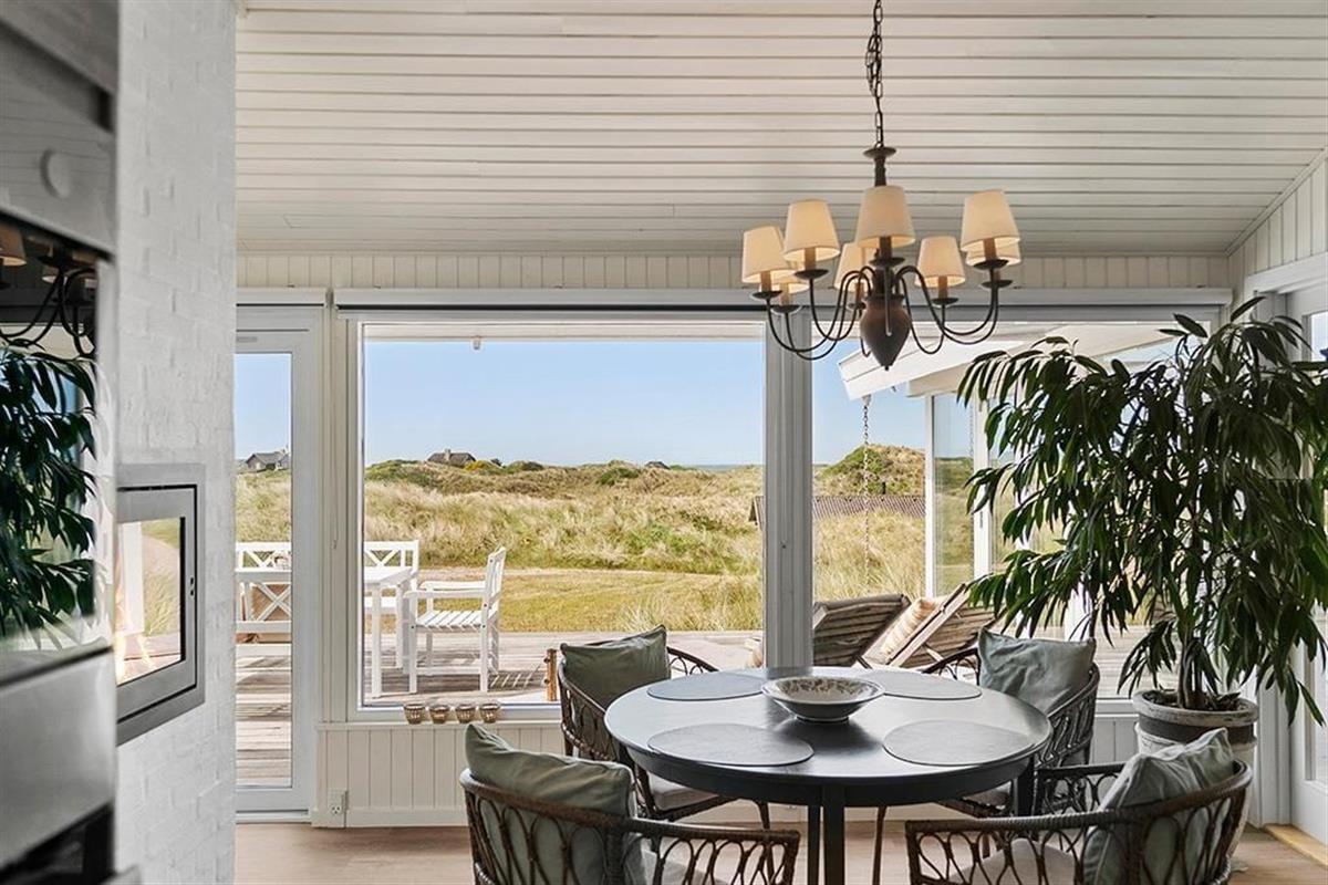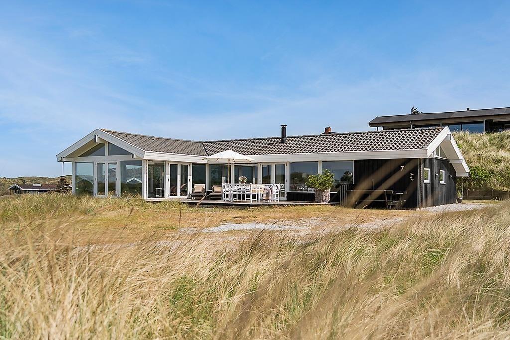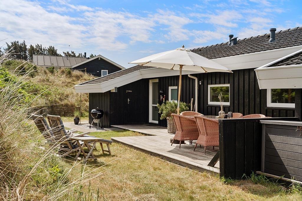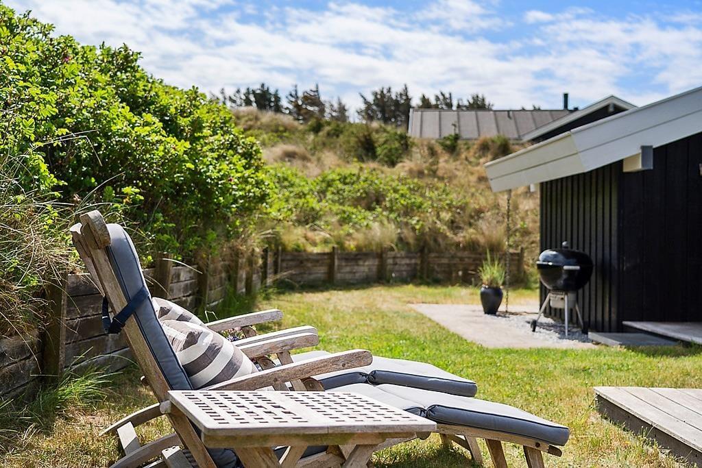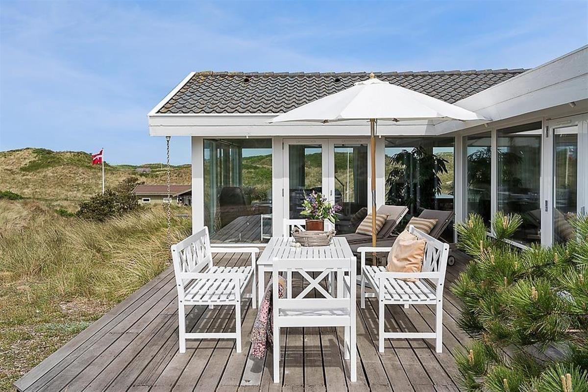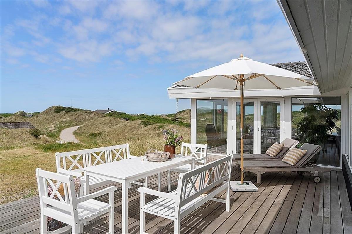 Die Umgebung rund um das Ferienhaus ist schier fantastisch. Vor dem Urlaubsdomizil ist eine große, gen Westen ausgerichtete Terrasse platziert, auf der Sie den Blick auf die sanften Dünen und den seicht im Wind wiegenden Strandhafer aus nächster Nähe genießen können - und vielleicht sogar das Meer am Horizont erblicken. Bei auffrischendem Westwind machen Sie es sich einfach auf der Ostterrasse gemütlich. Diese stellt einen weiteren schönen Aufenthaltsplatz dar und lädt mit ihren guten Gartenmöbeln und den Liegestühlen zu traumhaft entspannten Stunden unter dem hohen, nordischen Himmel ein.