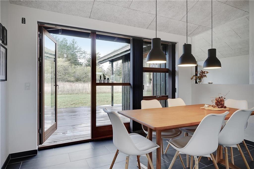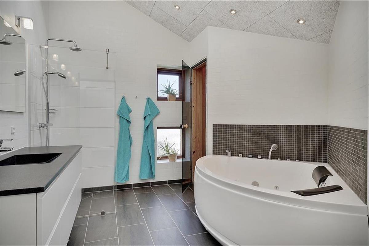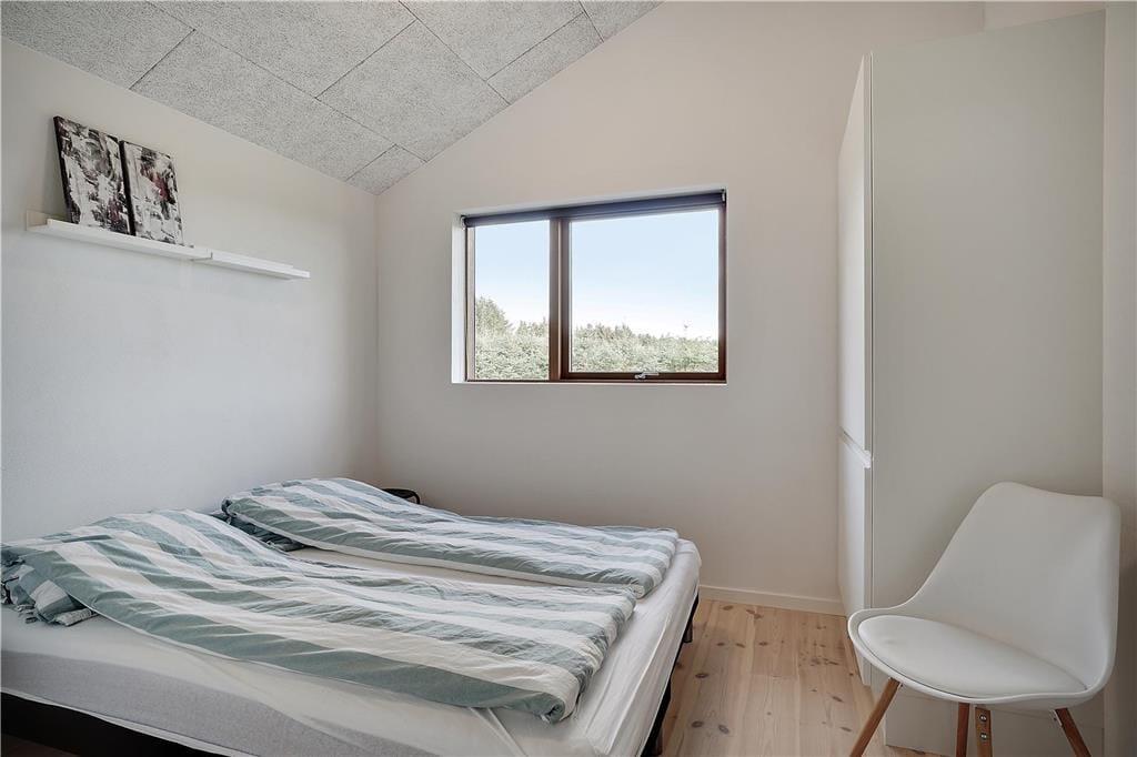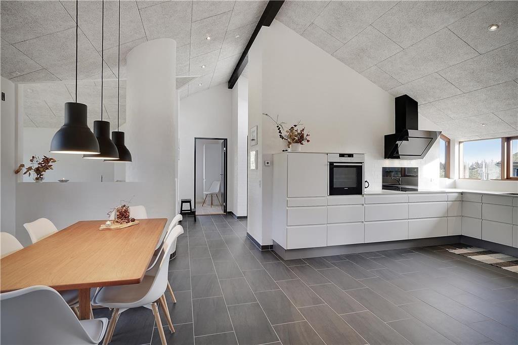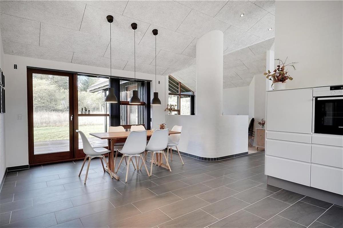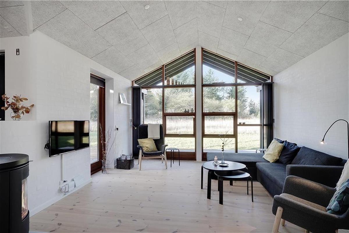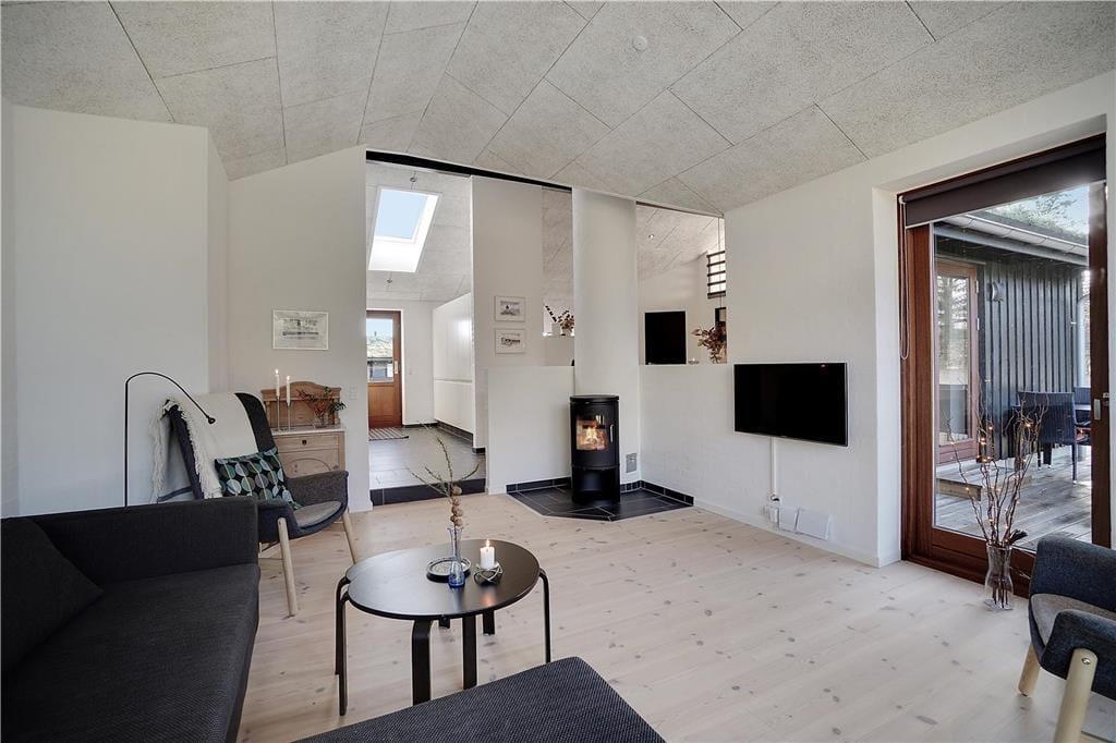 Bei der Erbauung dieses Ferienhauses im Jahr 2018 wurde großer Wert darauf gelegt, dass sich die Architektur des Objektes harmonisch in die schöne Natur Saltums einfügt. Im Aufenthaltsbereich, der sich aus dem Wohnraum und dem offen angrenzenden Küchen- und Essbereich zusammensetzt, reichen die nach Westen ausgerichteten Fensterpartien nahezu vom Boden bis zur Decke und ermöglichen Ihnen dadurch einen wunderbaren Ausblick ins Grüne. Diesen Ausblick genießen Sie nicht nur, wenn Sie sich auf dem Sofa nahe des Kaminofens entspannen, sondern beispielsweise auch dann, wenn Sie gemeinsam in der modernen, großen Küche die Mahlzeiten zubereiten. Die Umgebung besticht mit einem überaus reichen Tierleben. Somit ist es sehr wahrscheinlich, dass Sie während Ihres Urlaub das ein oder andere Reh oder auch manch umhertollenden Hasen auf Ihrem Grundstück beobachten werden. Die stilvolle Möblierung ist durch gedämpfte Farbtöne geprägt. Für eine angenehme, gute Wohnatmosphäre sorgen darüber hinaus die hohen, mit Akustikplatten versehenen Decken. Sämtliche Räume sind mit einer Fußbodenheizung versehen. Dies gilt selbstverständlich auch für die drei guten Schlafräume und den Eingangsbereich, in dem eine Waschmaschine und ein Wäschetrockner platziert sind. Zu den besonders hervorzuhebenden Details zählen die beiden attraktiven und geschmackvoll gestalteten Badezimmer, von denen eines mit einem Whirlpool und einer Sauna zu wunderbar erholsamen Momenten voller Entspannung einlädt.