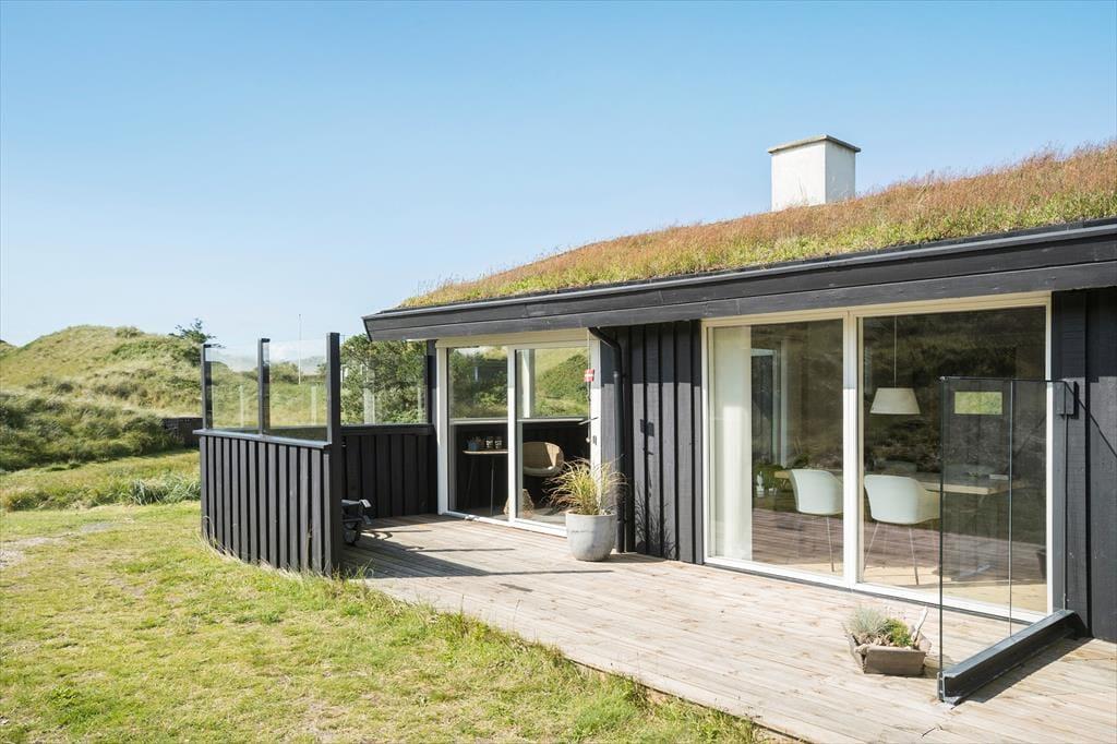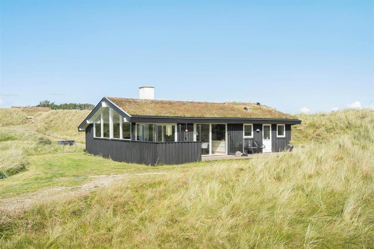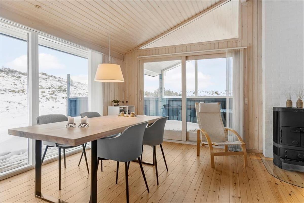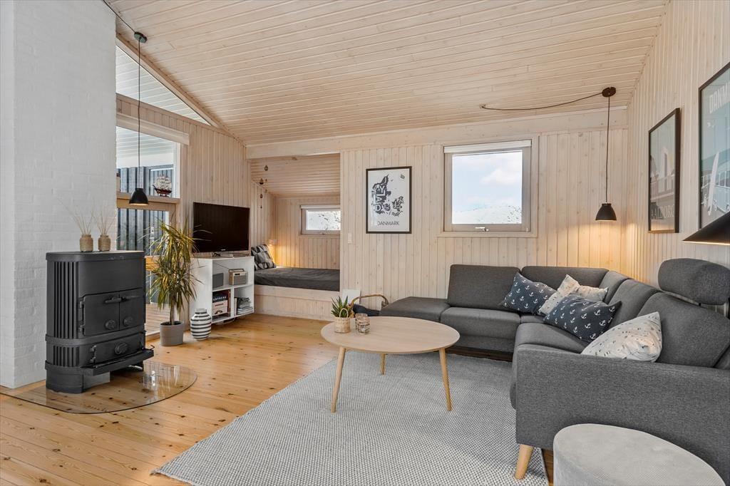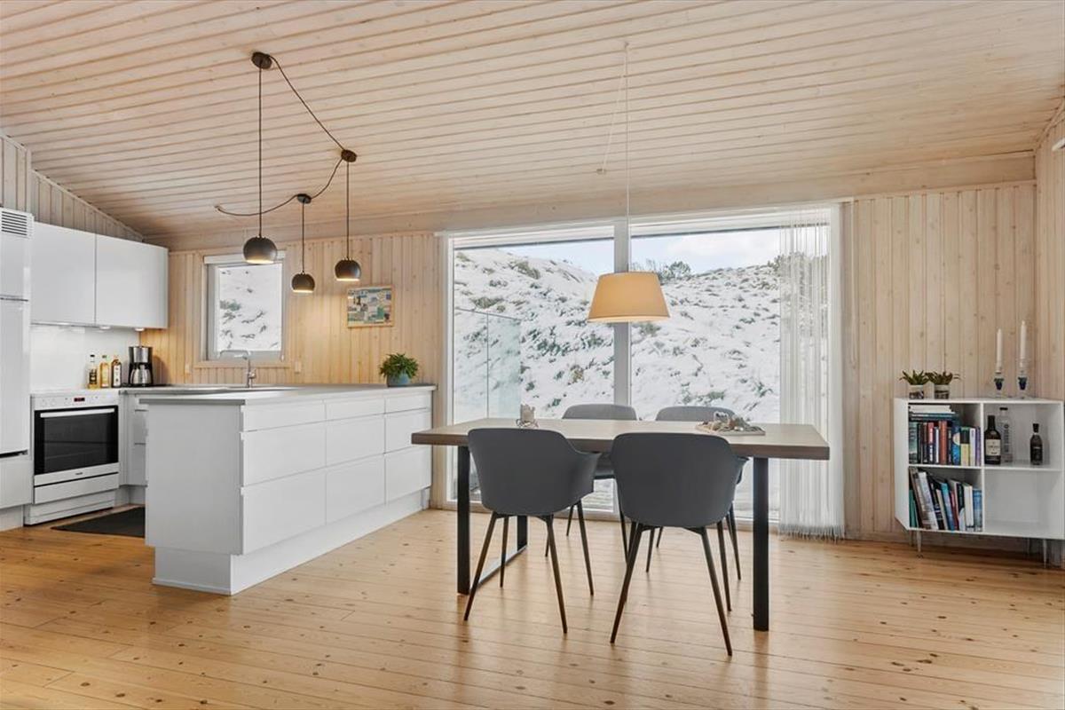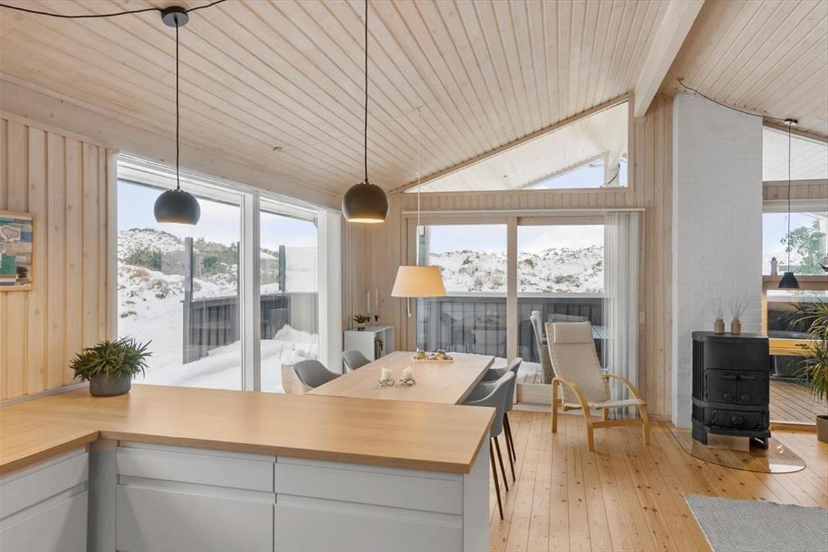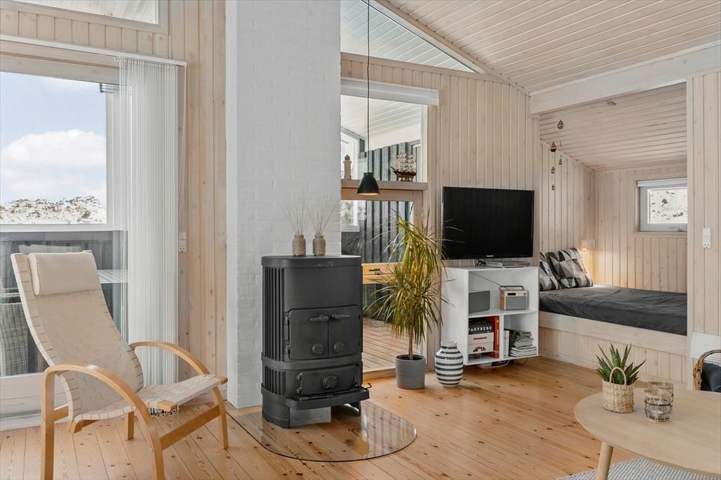 Wenn die Inneneinrichtung des Hauses beschrieben werden soll, können wir die äußere Umgebung nicht außen vor lassen: Das Haus ist nämlich mit großen Glastüren und großen Fensterfronten ausgestattet, so dass Sie von allen Seiten den Blick auf die hügelige Dünenlandschaft genießen können. Gleichzeitig gibt es einen herrlichen Lichteinfall in den Räumen, die gemütlich mit holzverkleideten Wänden und hohen Decken ausgestattet sind. Der Kaminofen schafft Gemütlichkeit im Wohnzimmer, das mit der Küche offen verbunden ist. Weiterhin verfügt das Haus über zwei Schlafzimmer mit vier Schlafplätzen. Außerdem gibt es die Möglichkeit in der Schlafnische im Wohnzimmer zu übernachten.