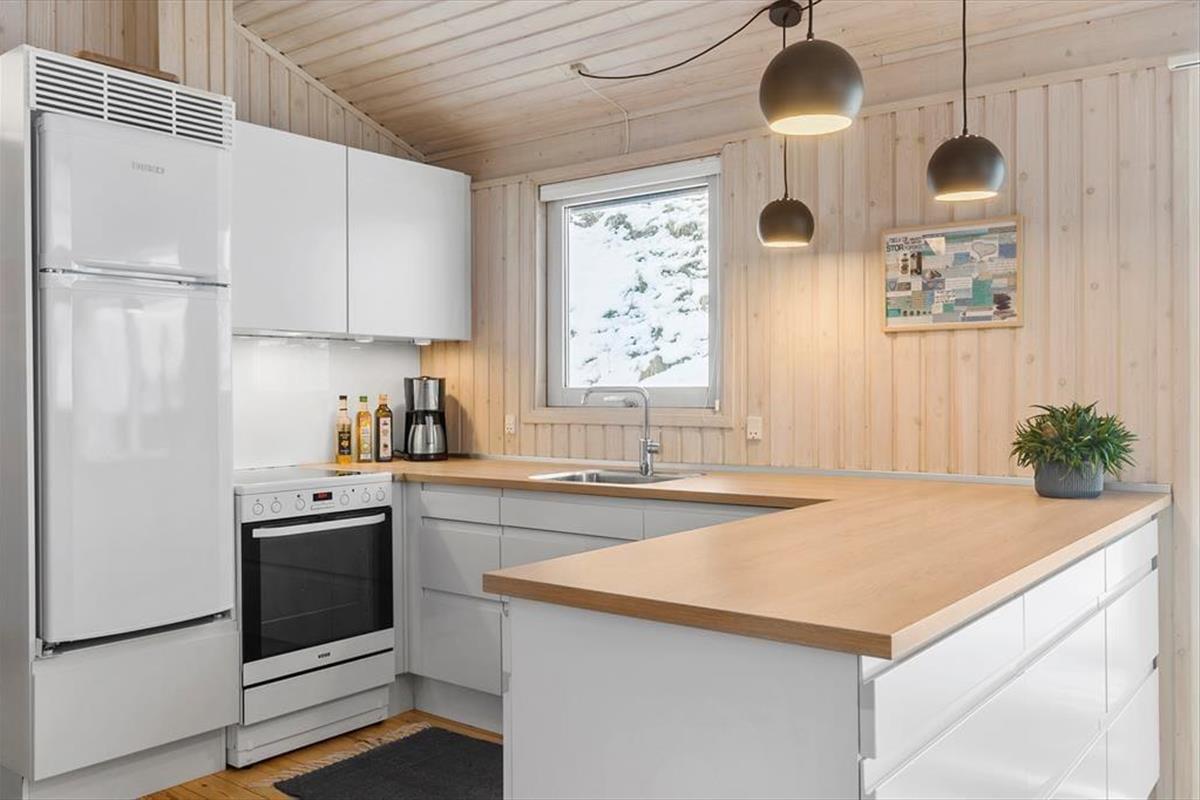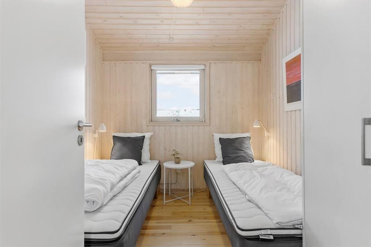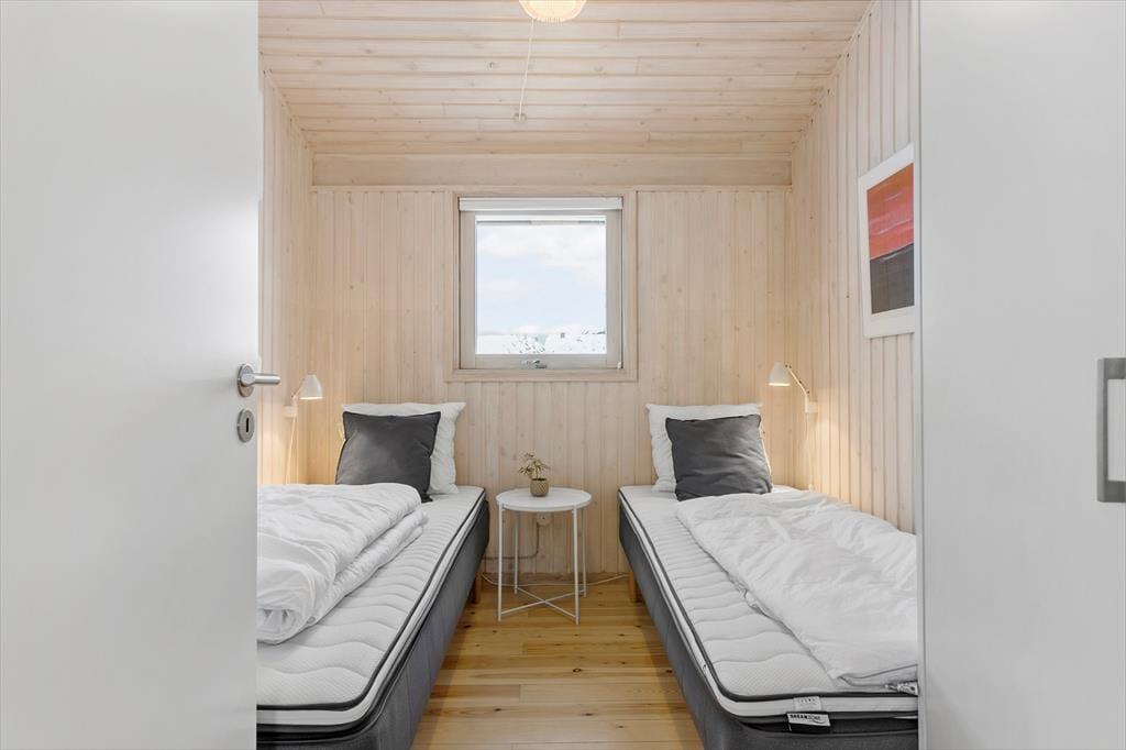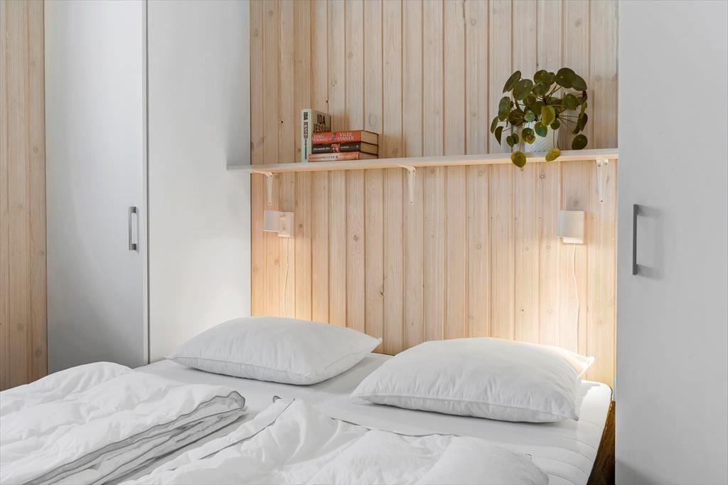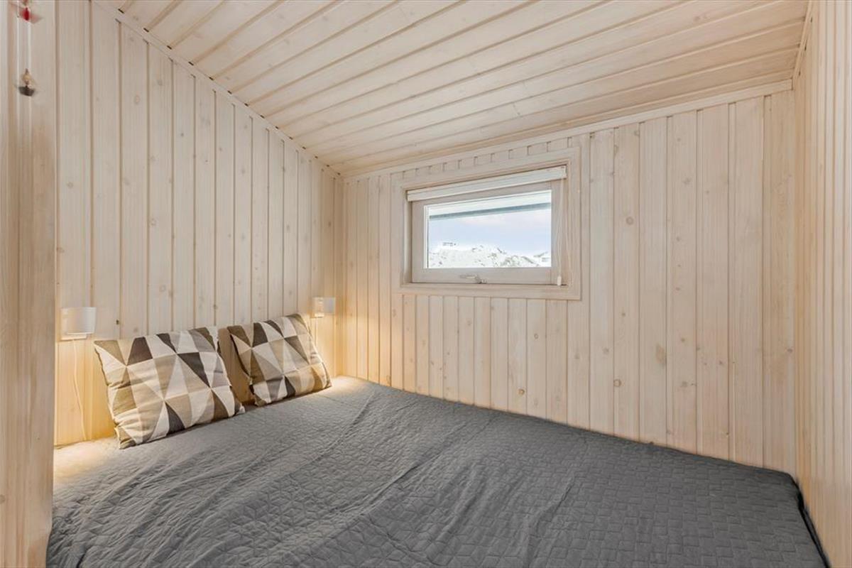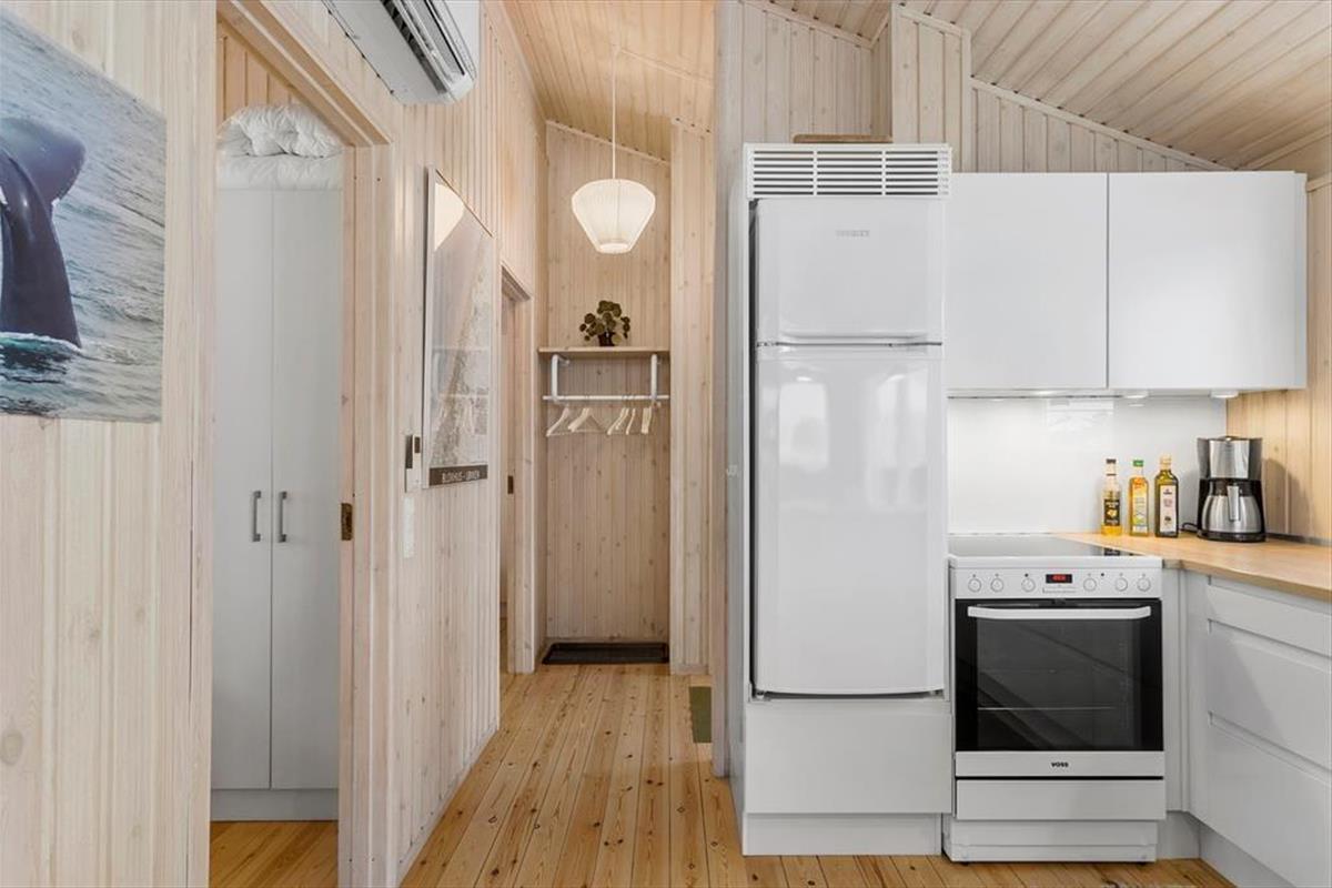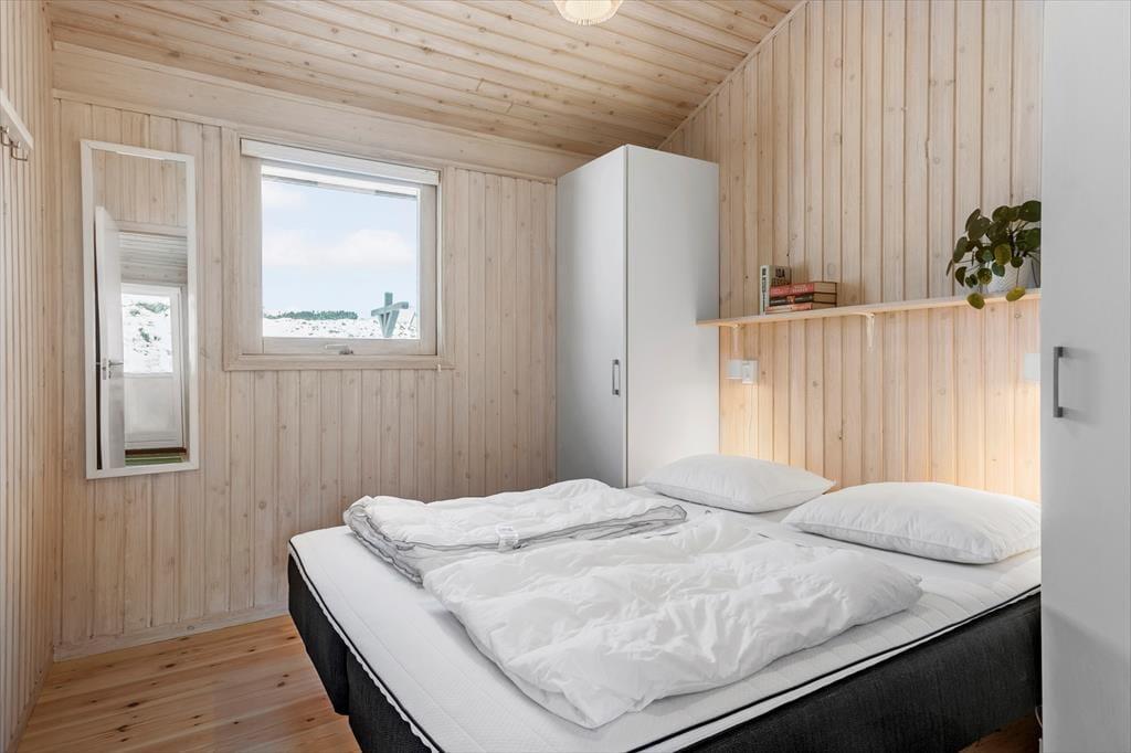 Wenn die Inneneinrichtung des Hauses beschrieben werden soll, können wir die äußere Umgebung nicht außen vor lassen: Das Haus ist nämlich mit großen Glastüren und großen Fensterfronten ausgestattet, so dass Sie von allen Seiten den Blick auf die hügelige Dünenlandschaft genießen können. Gleichzeitig gibt es einen herrlichen Lichteinfall in den Räumen, die gemütlich mit holzverkleideten Wänden und hohen Decken ausgestattet sind. Der Kaminofen schafft Gemütlichkeit im Wohnzimmer, das mit der Küche offen verbunden ist. Weiterhin verfügt das Haus über zwei Schlafzimmer mit vier Schlafplätzen. Außerdem gibt es die Möglichkeit in der Schlafnische im Wohnzimmer zu übernachten.