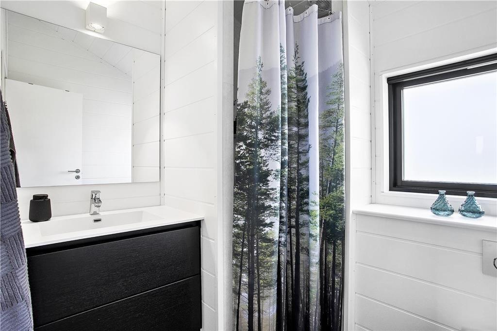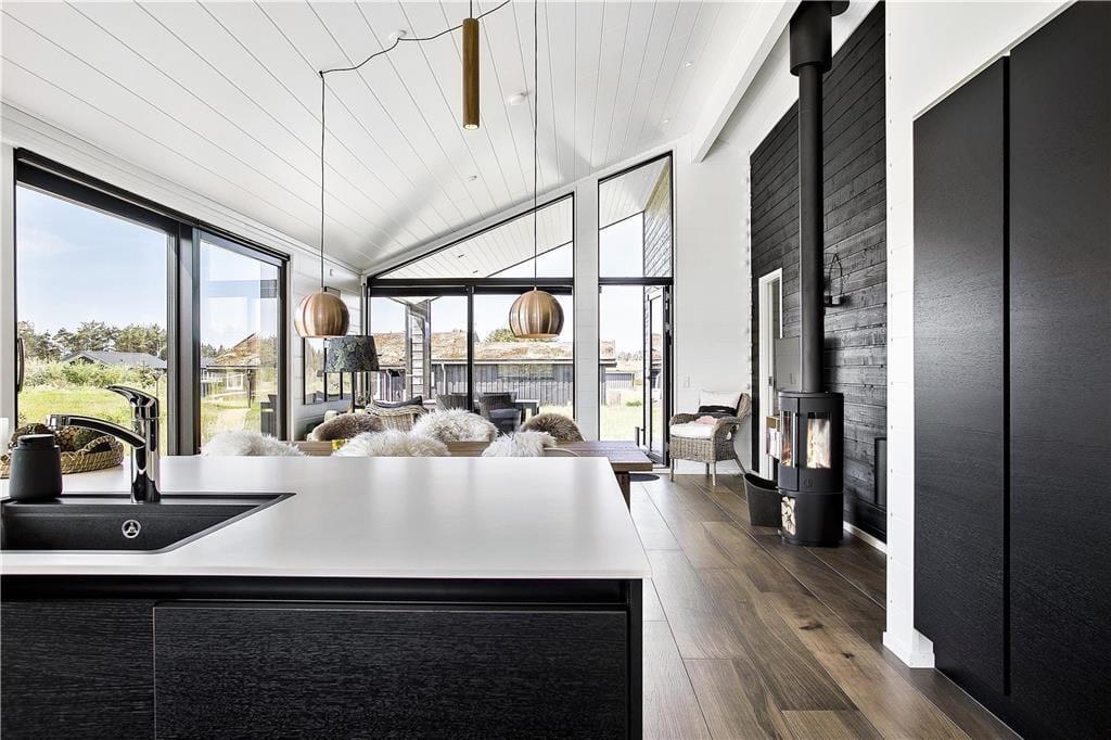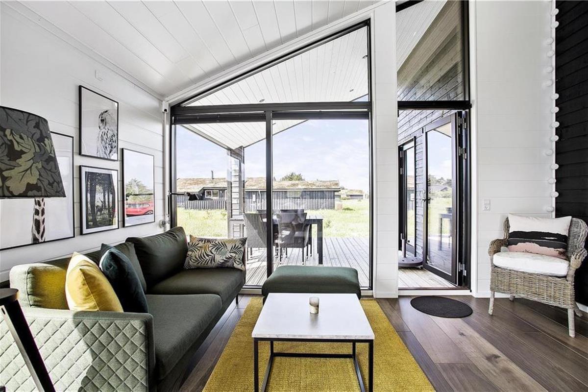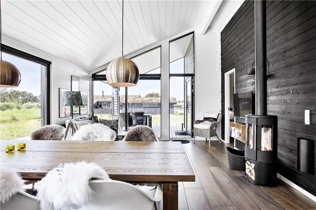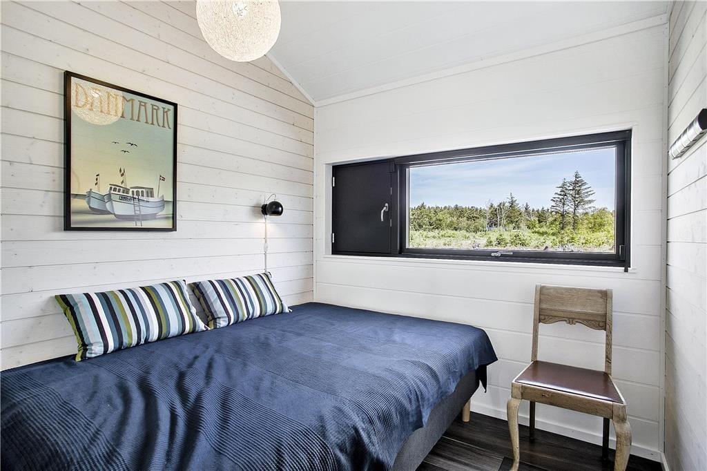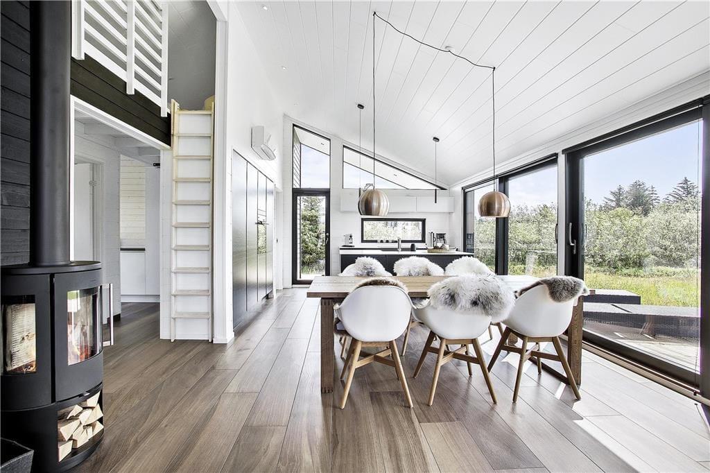 Mit seinem begrünten Dach und der rustikalen Holzverkleidung fügt sich dieses Urlaubsdomizil ganz fantastisch in die einzigartige Natur Nordjütlands ein. Große Fensterpartien durchbrechen die Fassade und sorgen dafür, dass Sie sowohl das Sonnenlicht als auch die schöne Aussicht genießen können, wenn Sie es sich vor dem Kamin im Inneren des Hauses gemütlich machen. Genauso wie die moderne Architektur, passt sich auch die Einrichtung mit ihrem neuen, nordischen Design und der ansprechenden Farbauswahl wunderbar in die Umgebung ein. Das Haus bietet Ihnen jedoch nicht nur Hochgenüsse für das Auge, sondern überzeugt auch durchweg mit einem hervorragenden Wohnkomfort. Zu erwähnen sind hierbei beispielsweise die Fußbodenheizung im Badezimmer und die in den Wohnraum integrierte Küchenabteilung, die selbst anspruchsvolle Hobbyköche zufrieden stellen dürfte. Die drei vorhandenen Schlafräume sind allesamt mit einem komfortablen Doppelbett ausgestattet. Zwei zusätzliche Schlafplätze befinden sich auf dem eingezogenen Schlafboden. Für Unterhaltung und Abwechslung in Form einer guten Filmauswahl samt sehr guter Klangqualität sorgen der Netflix-Anschluss und die Sonos-Box.