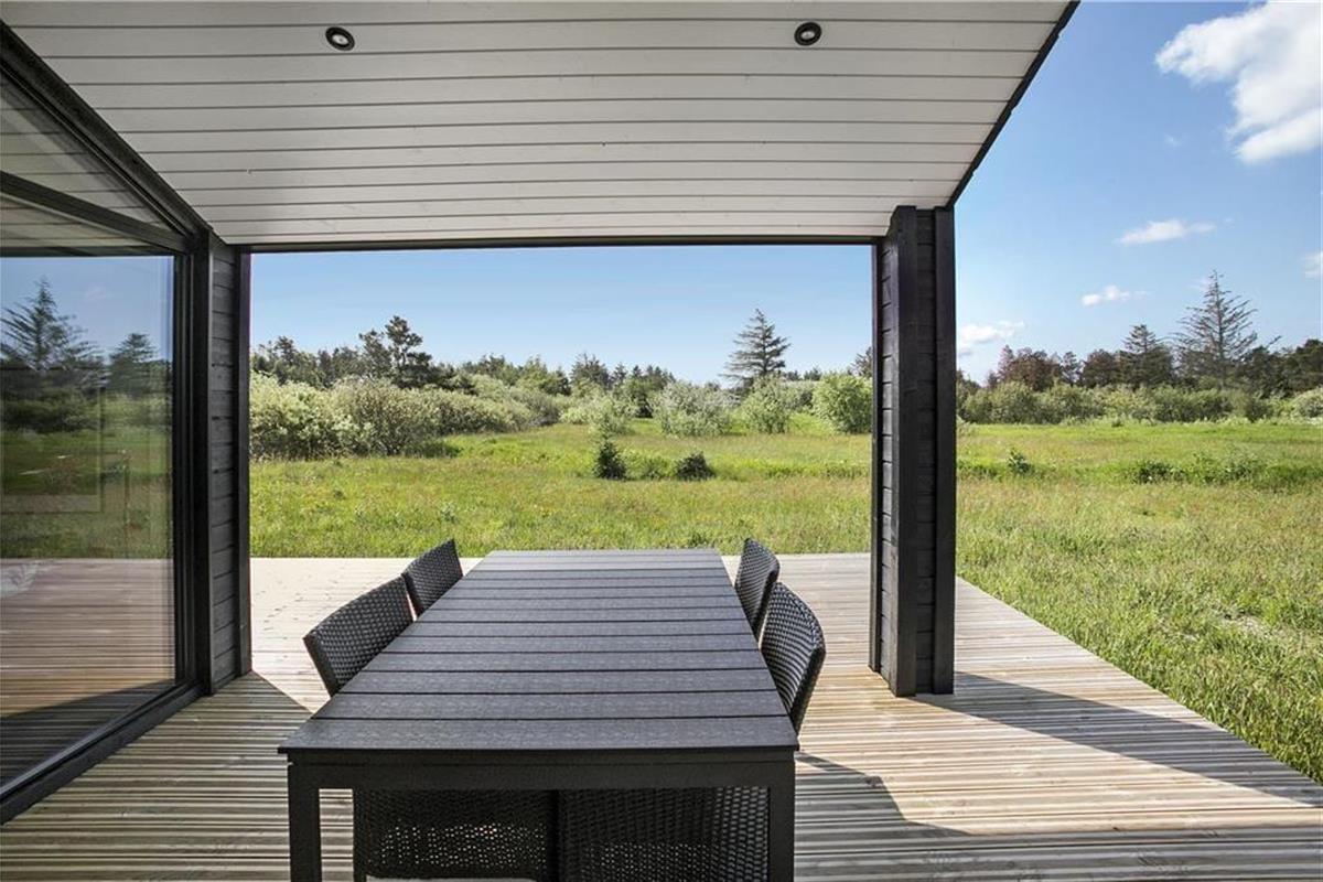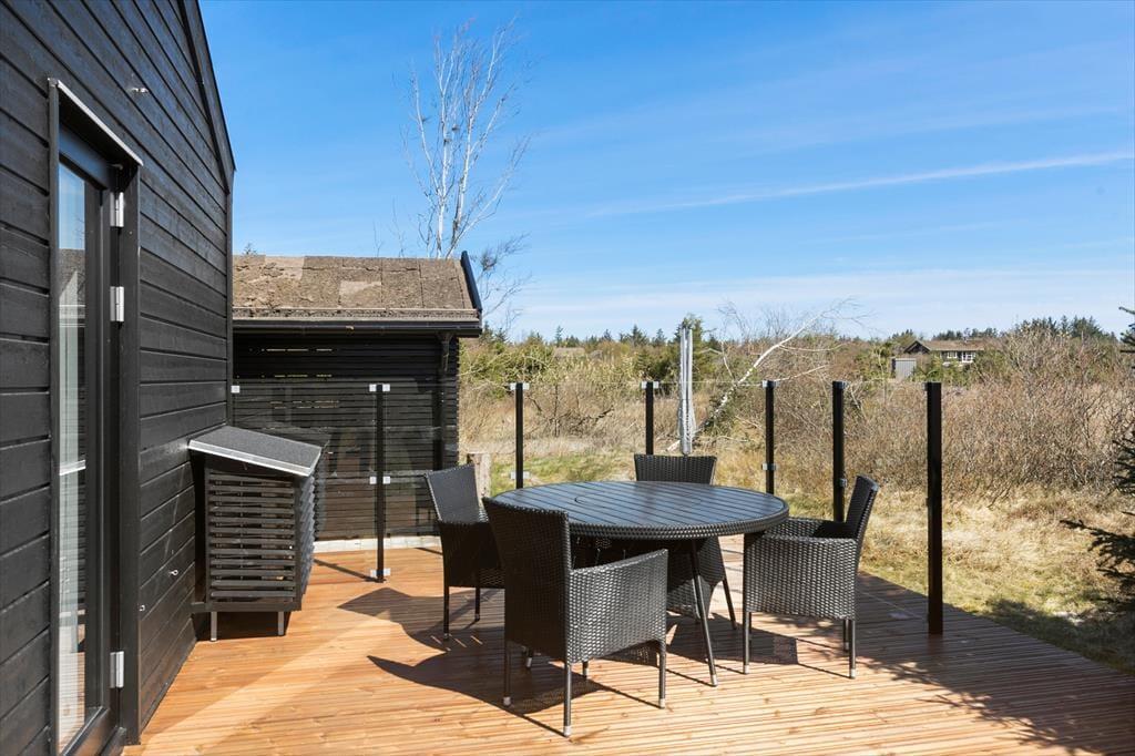 Die Aussicht und die ruhige Umgebung werden Sie auch unter freiem Himmel begeistern. Von der Holzterrasse, die das gesamte Objekt umgibt und teilweise überdacht ist, blicken Sie auf Nadelbäume, über niedrige Büsche und offene Flächen. Das Ferienhaus liegt auf dem letzten Grundstück am Ende eines geschlossenen Weges und grenzt zu einer Seite an ein unter Schutz stehendes Areal. Das einzige was Sie hier sehen werden, sind wahrscheinlich hin und wieder vorbeiziehende Rehe oder spielende Kaninchen. Es erwartet Sie also nichts anderes als Ruhe und pure Erholung und Entspannung. Ein perfekter Ort, um neue Energien für den oftmals recht hektischen Alltag zu schöpfen!