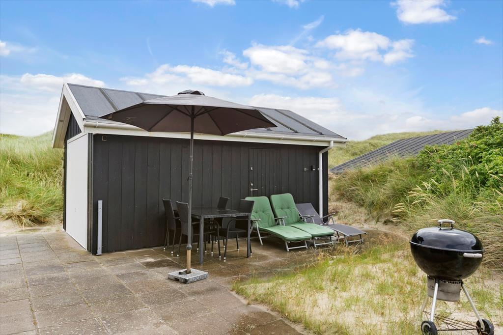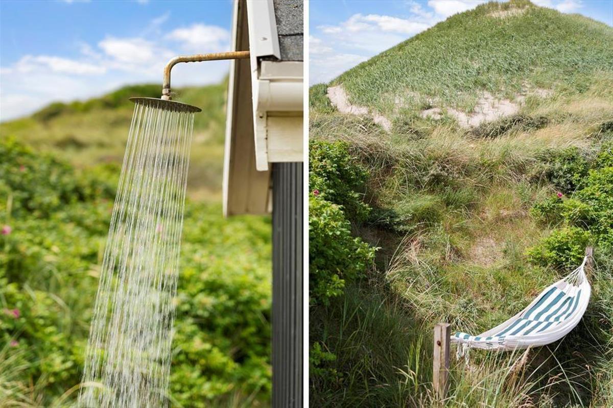 Ein großer, gefliester Terrassenbereich zieht sich rund um das Ferienhaus und auch um den zugehörigen Schuppen. Daher gibt es viele geschützte und sonnige Ecken zwischen denen Sie wählen können. Ein Teil der Terrasse ist auch überdacht, wenn Sie das vorziehen sollten. Andernfalls können Sie den Sonnenschirm zu den Sonnenliegen stellen, wenn Sie das Mittagsnickerchen im Schatten verbringen möchten. Hinter dem Schuppen gibt es eine Außendusche, sodass Sie leicht das Salzwasser abspülen und sich erfrischen können. Von mehreren Stellen des Grundstückes können Sie auf die Nordsee blicken und das Grundstück verläuft direkt zum Meer hinunter.