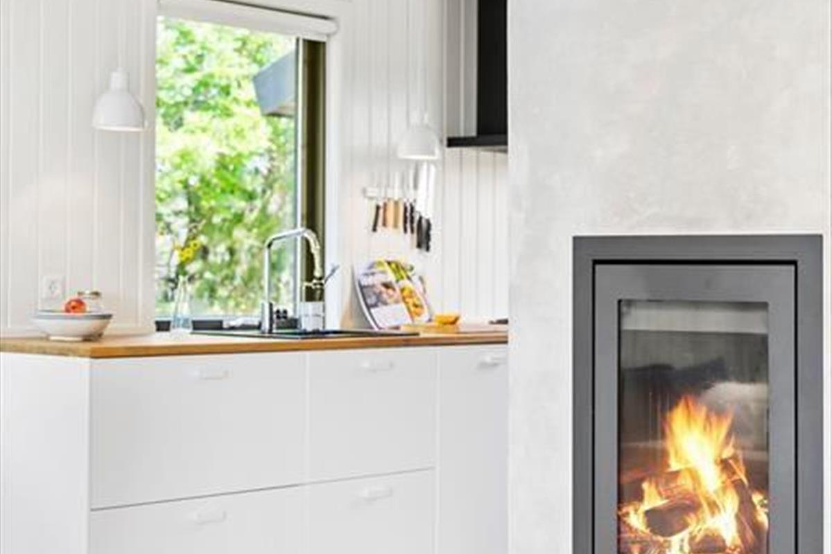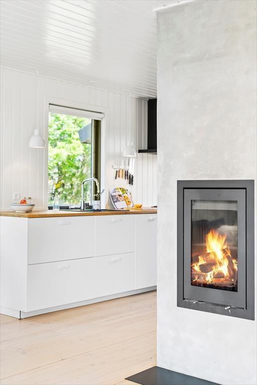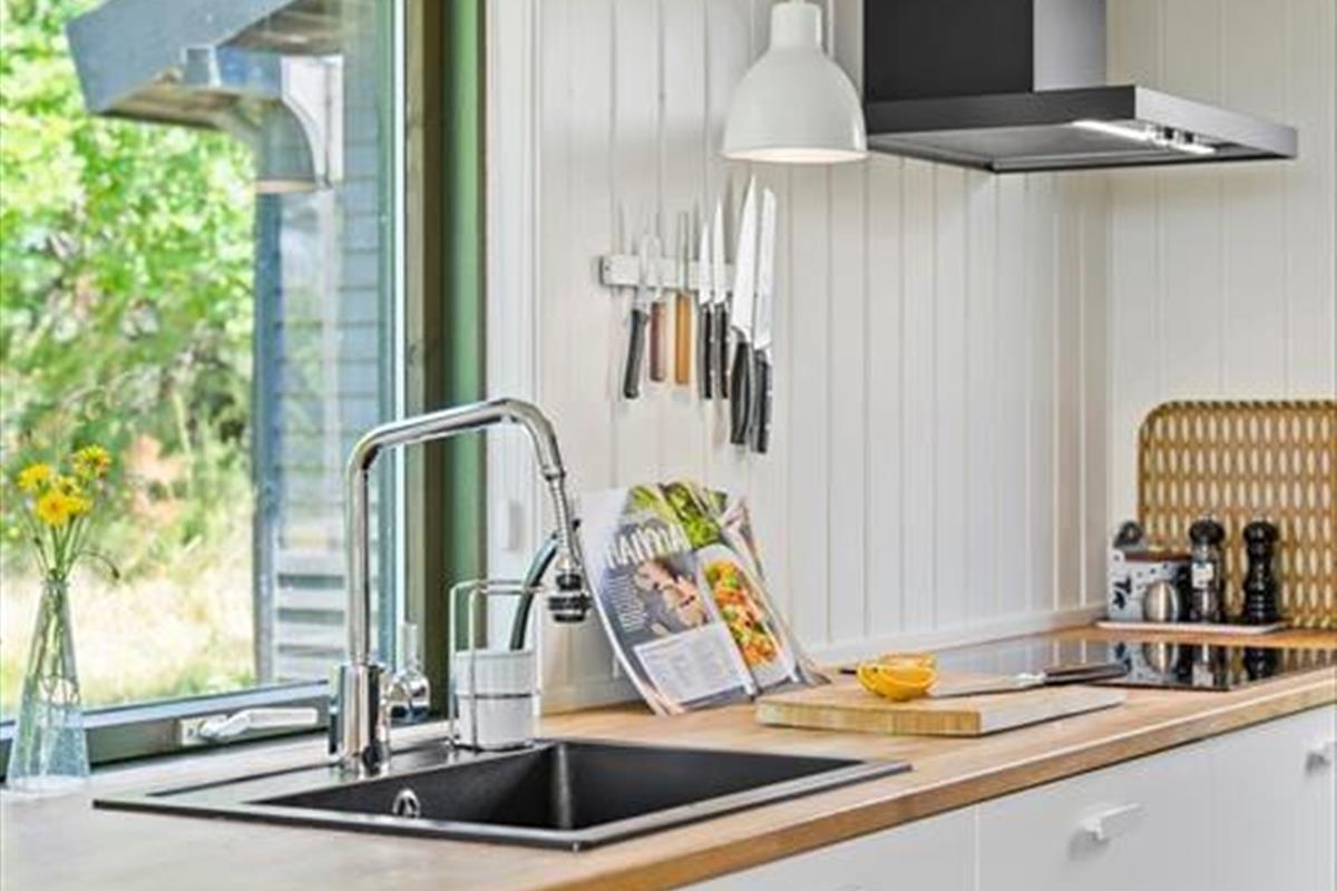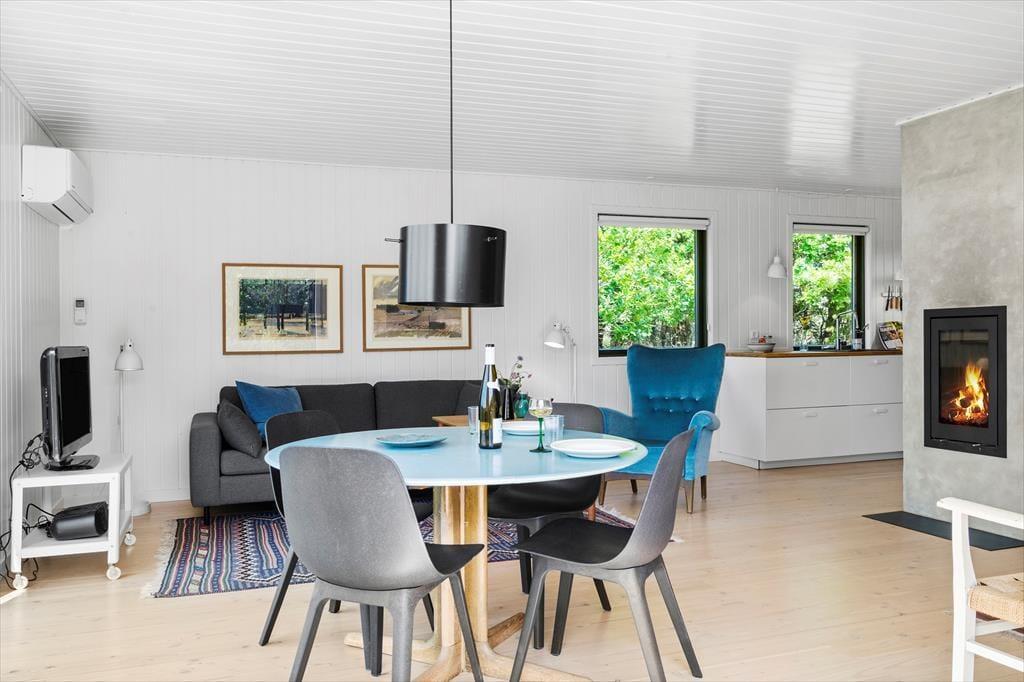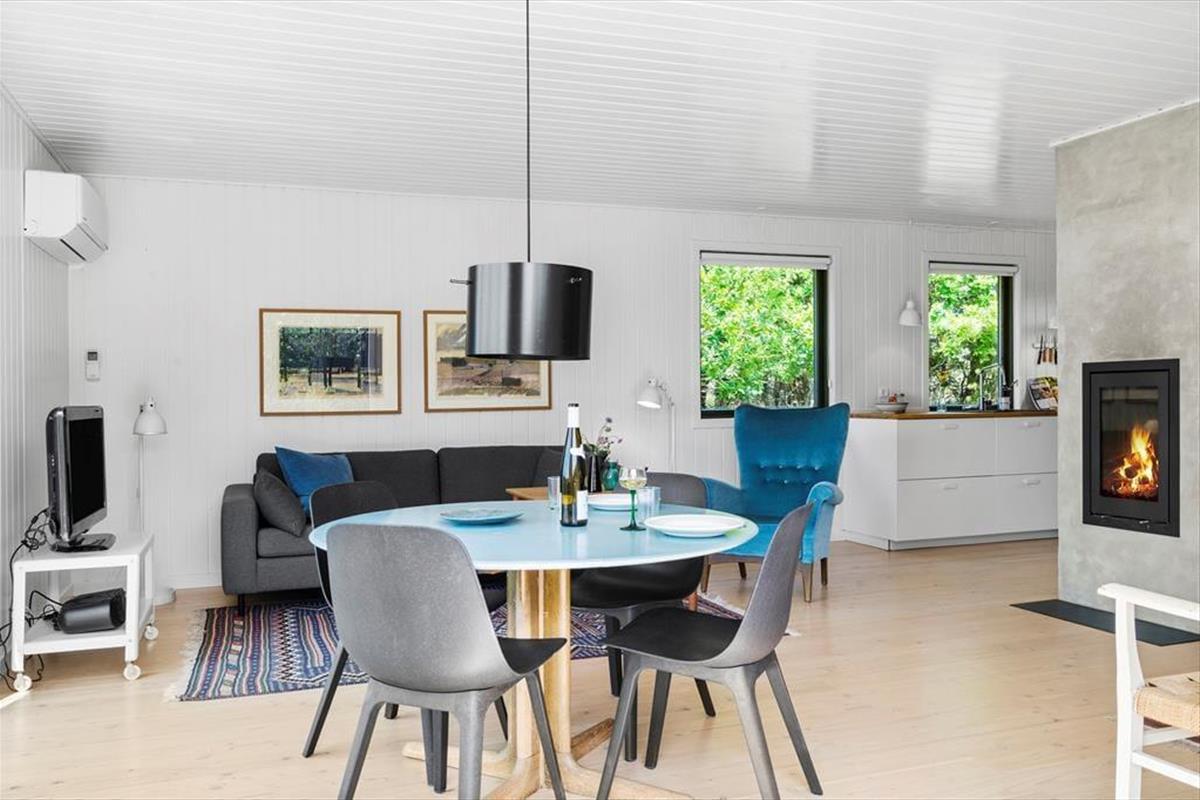 Das Ferienhaus liegt auf dem Gipfel eines Hügels. Dies erklärt auch die einmalig schöne Aussicht. Die großen Fensterpartien sorgen dafür, dass Sie auch vom Innenbereich des Hauses den Blick in die prachtvolle Umgebung genießen können. Die gilt beispielsweise für die Momente, in denen Sie gemeinsam am Esstisch des ansprechenden Wohnbereichs sitzen, der ebenso wie der Rest des Hauses in 2019 sehr schön und geschmackvoll renoviert wurde. Der Wohnbereich vereint in sich die attraktive Küche und das Wohnzimmer. Besondere Erwähnung bedarf der Kaminofen, der sich eingemauert in eine Säule zentral im Wohnraum befindet. Zur Wohnfläche zählen außerdem ein Schlafzimmer mit einem Doppelbett und ein Badezimmer, das ebenso wie der Rest des Hauses, mit seiner hellen, schlichten und geschmackvollen Gestaltung überzeugt.