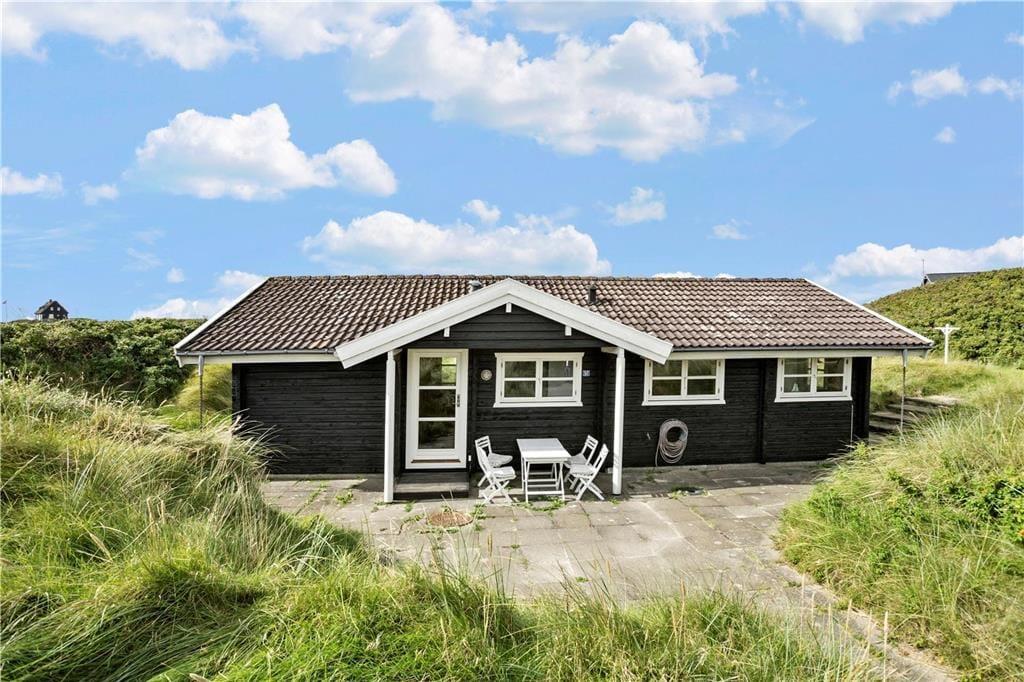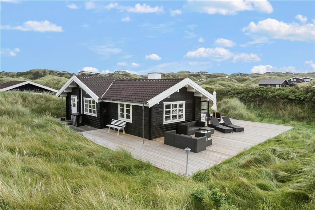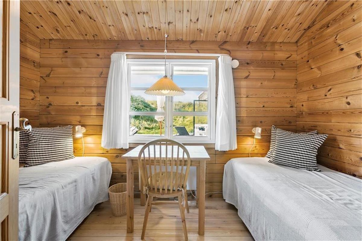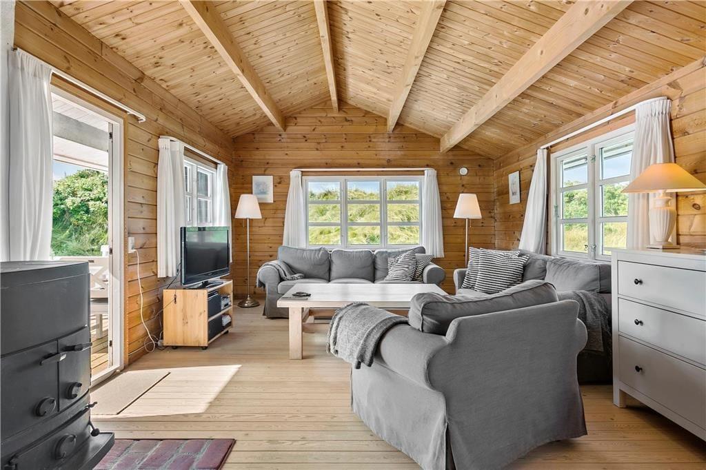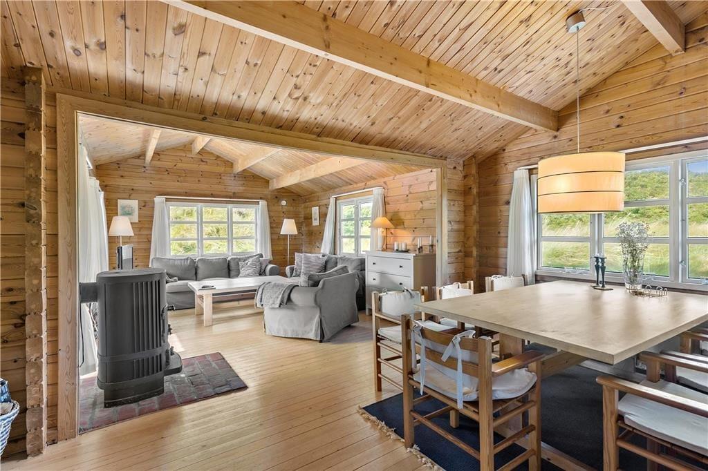 Das klassische Blockhaus steht hier seit 1974, und man kann deutlich sehen, dass sowohl das Gebäude als auch die Einrichtung über die Jahre gepflegt und modernisiert wurden. Es verkörpert wirklich das nordische Ferienhausgefühl, wenn der Kamin brennt und Sie mit Büchern oder Brettspielen im Sofa-Bereich entspannen – oder wenn Sie beim Brunch um den Esstisch sitzen und dabei die Aussicht auf die Dünen durch die Sprossenfenster genießen. Neben Wohnzimmer und Küche gibt es drei schöne Schlafzimmer und ein Badezimmer im Haus. Im dazugehörigen Nebengebäude befindet sich ein weiteres Schlafzimmer und ein Badezimmer, sodass bis zu acht Personen bequem untergebracht werden können. Ein Aktivitätsraum sorgt ebenfalls für Unterhaltung, denn in der Garage können Sie Tischtennis, Tischfußball und Dart spielen, anstatt Autos zu parken.