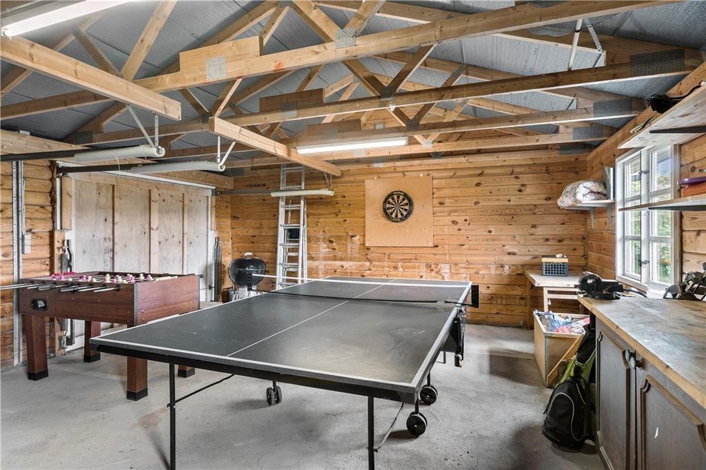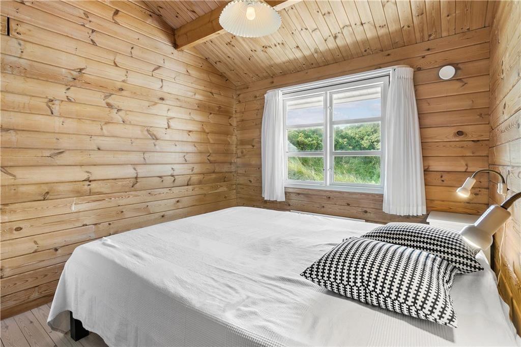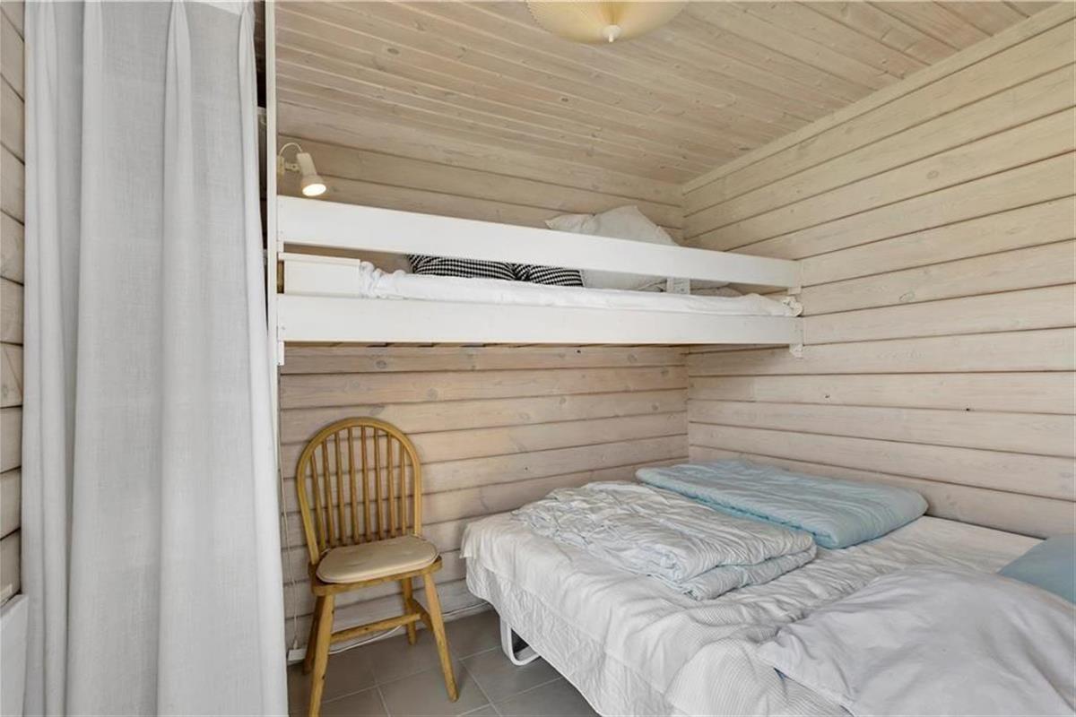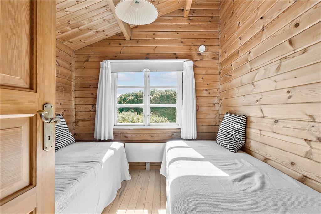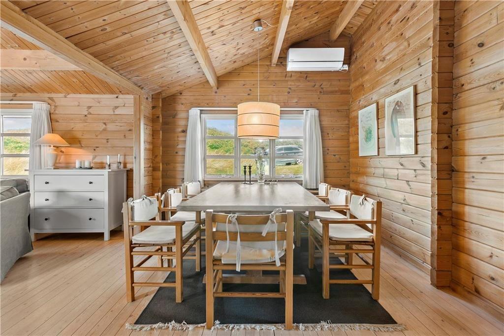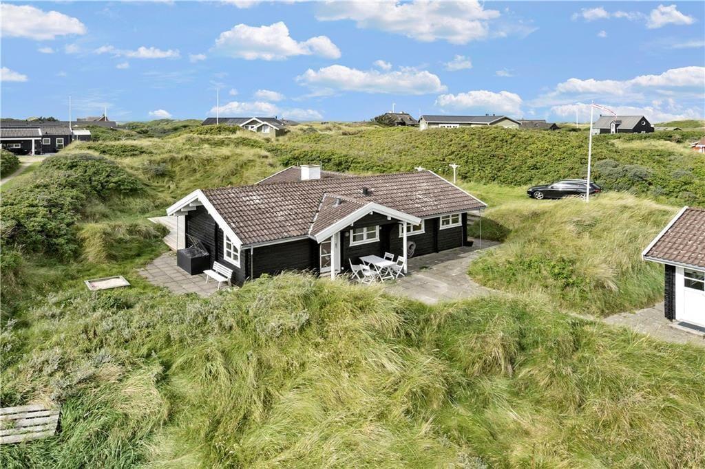 Das klassische Blockhaus steht hier seit 1974, und man kann deutlich sehen, dass sowohl das Gebäude als auch die Einrichtung über die Jahre gepflegt und modernisiert wurden. Es verkörpert wirklich das nordische Ferienhausgefühl, wenn der Kamin brennt und Sie mit Büchern oder Brettspielen im Sofa-Bereich entspannen – oder wenn Sie beim Brunch um den Esstisch sitzen und dabei die Aussicht auf die Dünen durch die Sprossenfenster genießen. Neben Wohnzimmer und Küche gibt es drei schöne Schlafzimmer und ein Badezimmer im Haus. Im dazugehörigen Nebengebäude befindet sich ein weiteres Schlafzimmer und ein Badezimmer, sodass bis zu acht Personen bequem untergebracht werden können. Ein Aktivitätsraum sorgt ebenfalls für Unterhaltung, denn in der Garage können Sie Tischtennis, Tischfußball und Dart spielen, anstatt Autos zu parken.