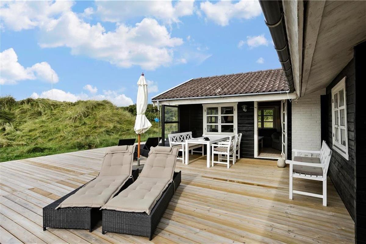 Eine große und sonnige Holzterrasse erstreckt sich nach Süden und Westen vom Ferienhaus, ausgestattet mit Liegestühlen und Gartenmöbeln, die das Urlaubsleben besonders komfortabel machen. Es ist ein ganz besonderes Gefühl, sich hier in der friedlichen Umgebung zwischen Dünenhafer und Hagebuttenbüschen zu sonnen. An den anderen Seiten des Hauses gibt es gepflasterte Bereiche, sodass Sie zu jeder Tageszeit der Sonne folgen und ein schönes Plätzchen finden können.
