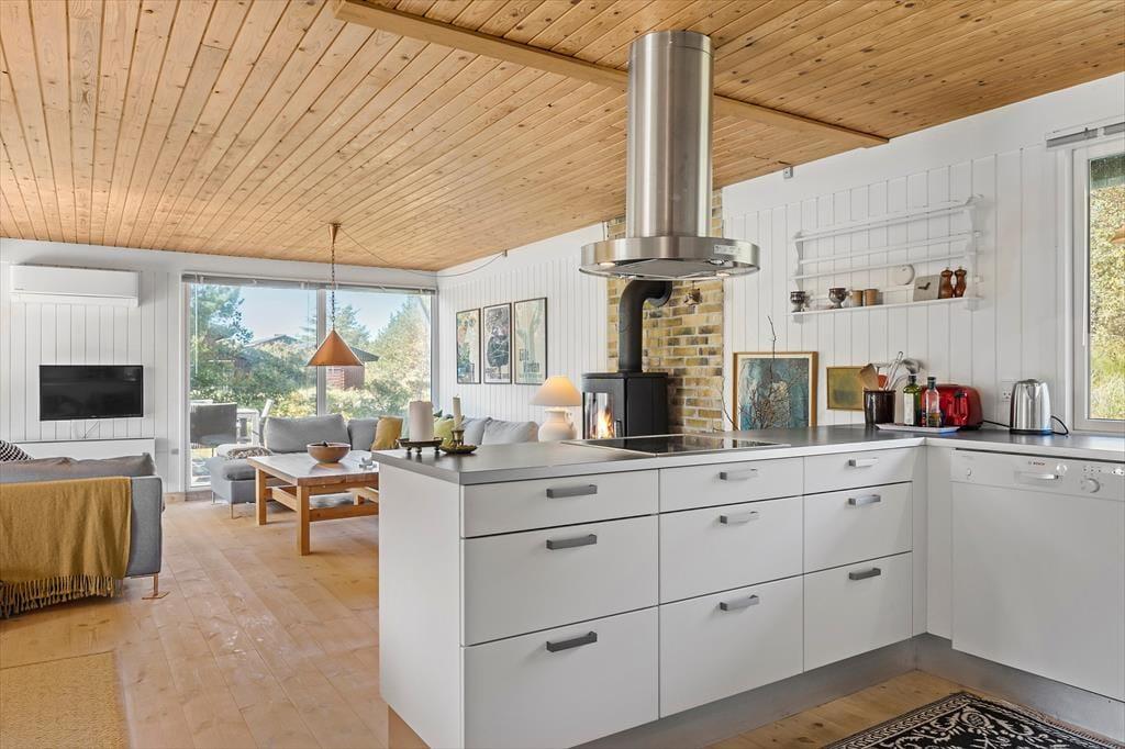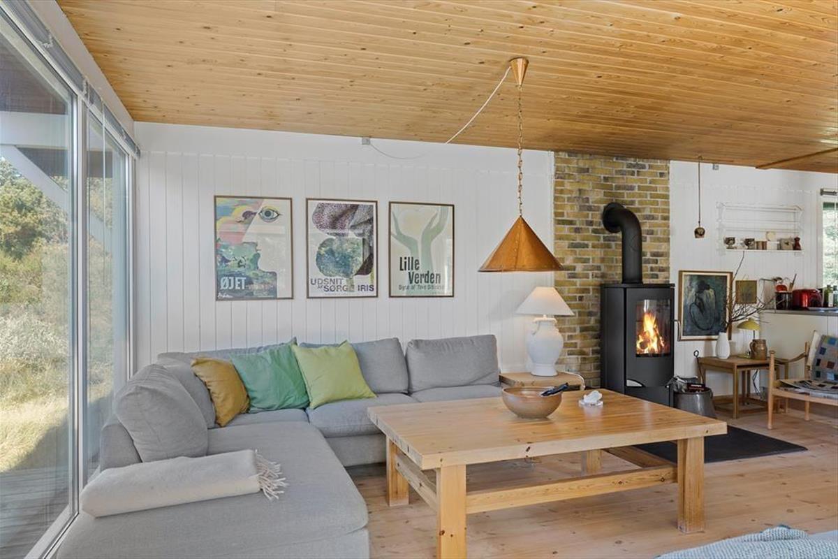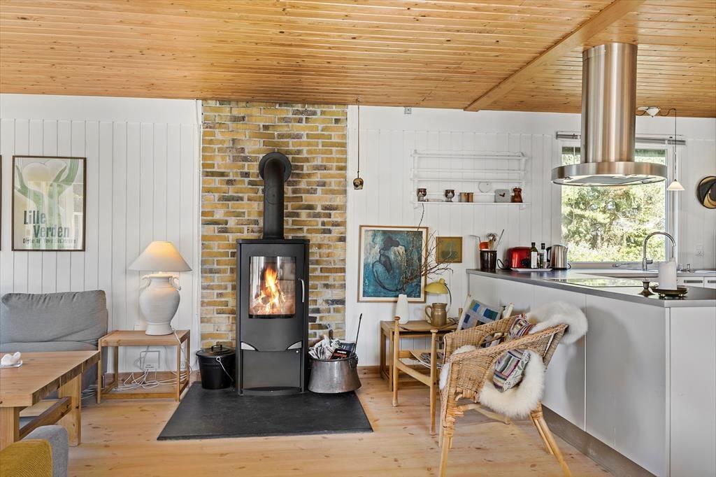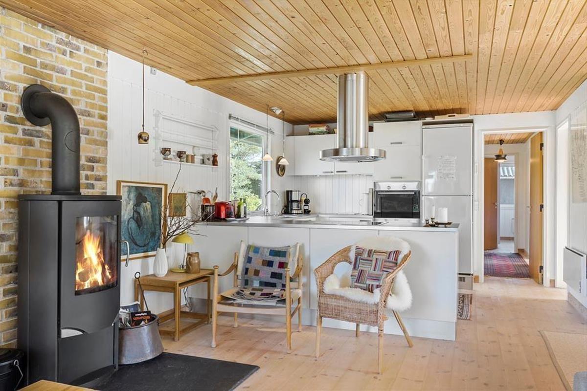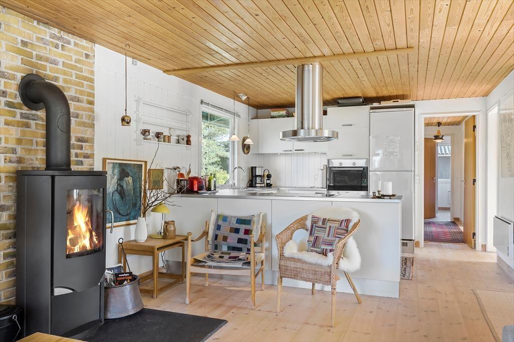 In diesem attraktiven Urlaubsdomizil hat es der Eigentümer geschafft, eine feine Balance zwischen Retro-Stil und Moderne zu finden, so dass die Innenbereiche sowohl gemütlich als auch funktional wirken. Die gewählten Farbtöne sind angenehm hell und die zahlreichen, ganz bezaubernden Einrichtungsdetails vermitteln Ihnen die ganz typisch dänische Ferienhausstimmung, die Sie dazu verleitet, Ihren Gedanken freien Lauf zu lassen und die Urlaubstage gemütlich dahinplätschern und jegliche festen Planungen vergessen zu lassen. Wenn Sie sich gerne im Hausinneren aufhalten, können Sie sich im Kreise Ihrer Liebsten im großen Aufenthaltsraum versammeln, der den Wohnraum und die Küche offen und harmonisch in sich vereint. An kühlen Tagen und Abenden verleiht der romantisch knisternde und behaglich wärmende Kaminofen dem Raum eine traumhaft gemütliche Stimmung. An warmen Sommertagen stellen Sie hingegen einfach die Terrassentüren weit auf, sodass die Terrasse als natürliche Erweiterung der Wohnfläche fungiert. Unabhängig von der Jahreszeit ist es herrlich, sich in den vier Schlafräumen zur Ruhe zu begeben und sich nach einem langen, interessanten und erlebnisreichen Urlaubstag so richtig schön auszuschlafen. Vorher können Sie sich selbstverständlich im hauseigenen Badezimmer noch eine Dusche gönnen und Ihre Zähne putzen.