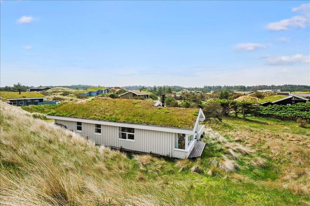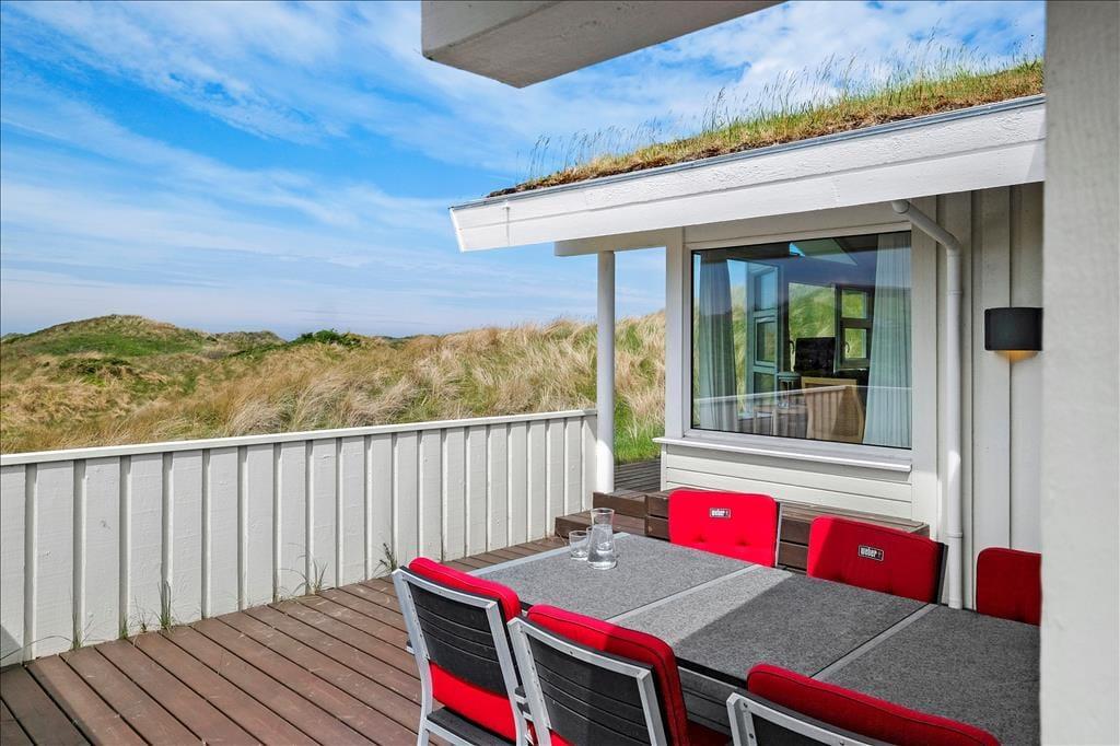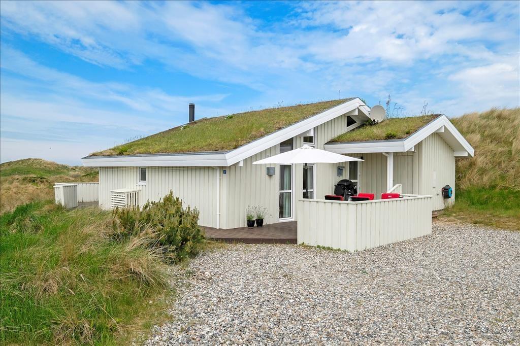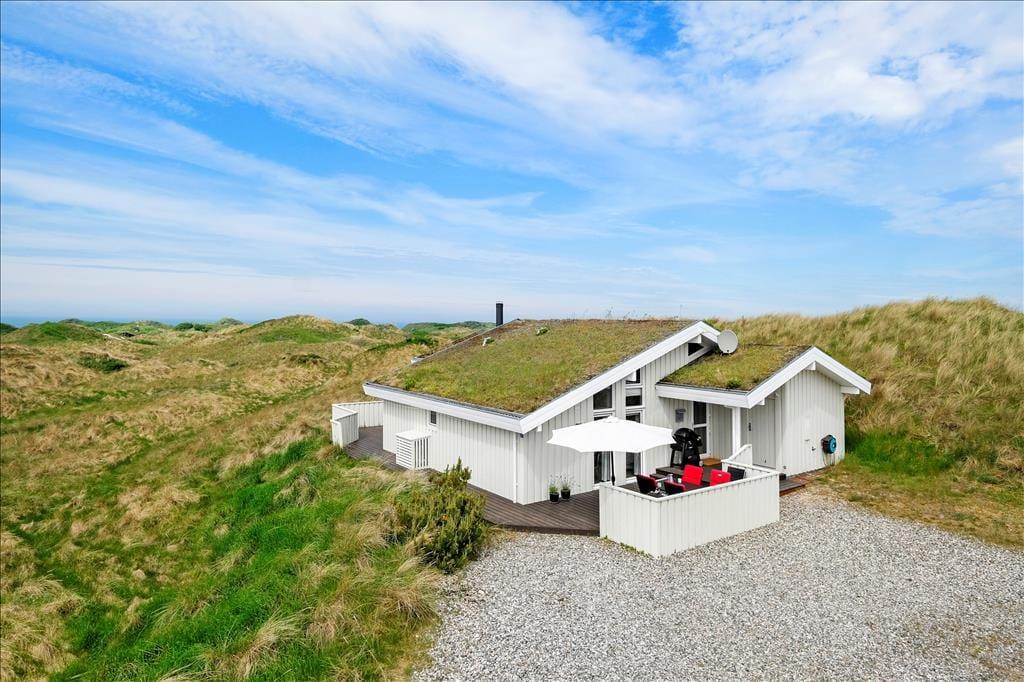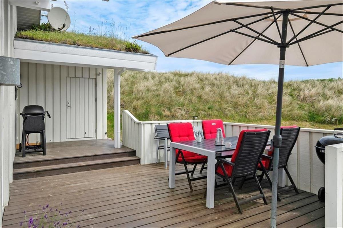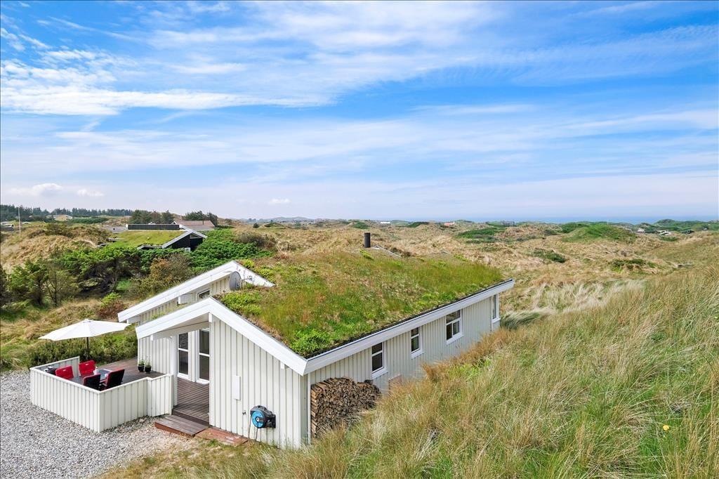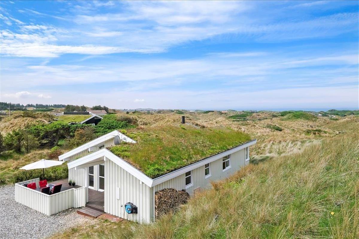 Das Ferienhaus liegt auf einem 1979 m2 großen Dünengrundstück, welches mit der naturschönen Umgebung verschmilzt. Um das Ferienhaus herum kann man zwischen zwei herrlichen Terrassen wählen, und besonders die Westterrasse lockt mit seiner prächtigen Platzierung raus zu der unberührten Landschaft. Es ist leicht in seinen Gedanken zu versinken, wenn Sie sich hier behaglich in den Gartenstühlen zurechtgesetzt haben und die Sonne genießen, das Sommerleben und diese hübsche Szenerie – vielleicht mit etwas Leckerem auf den Grill, wenn es Zeit zum Abendessen ist.