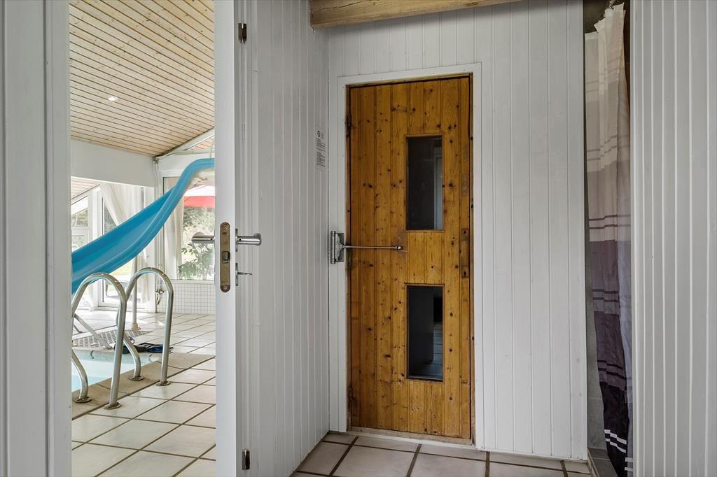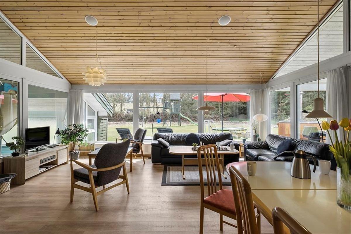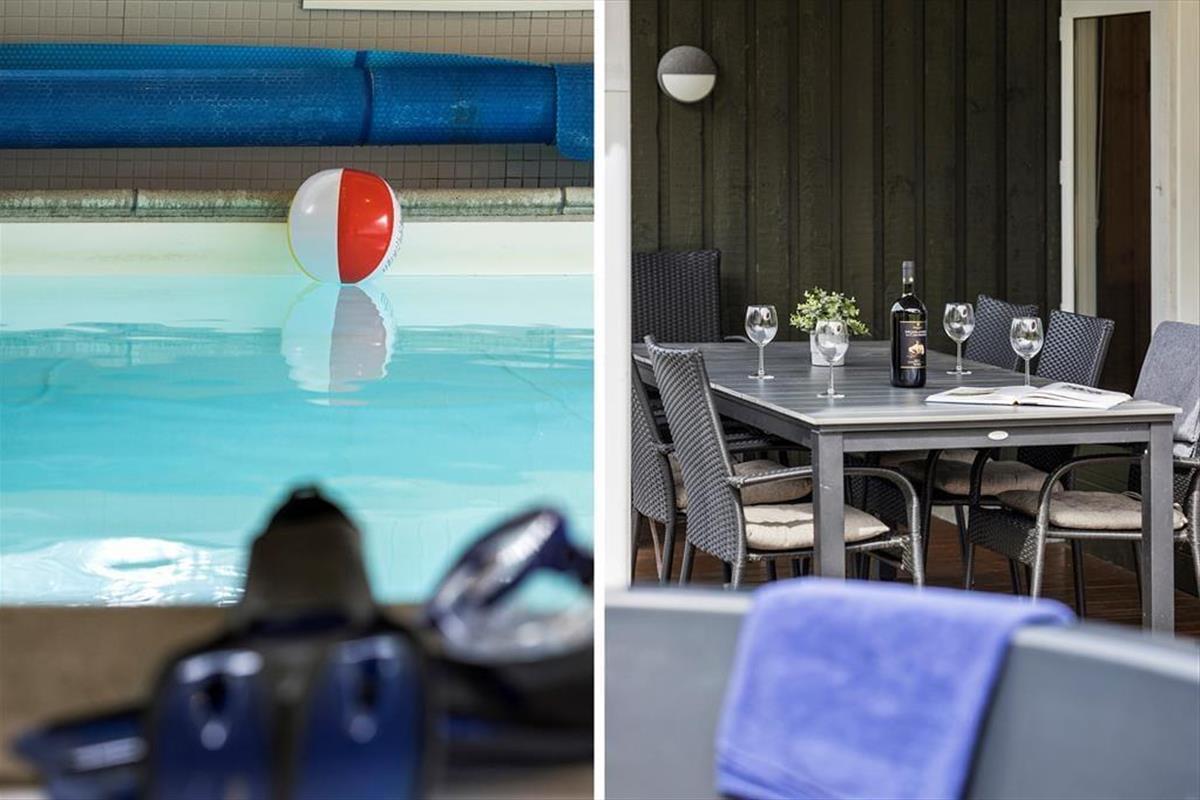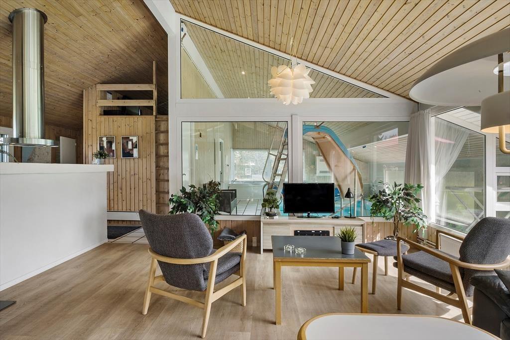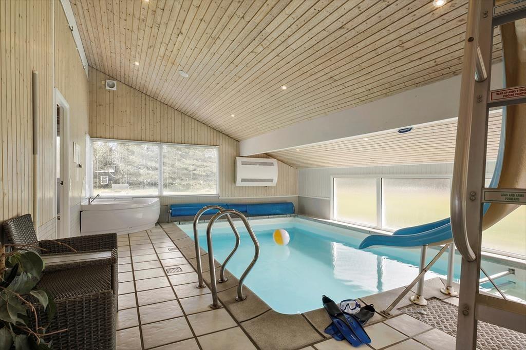 Mit seiner 150 m² umfassenden Wohnfläche, eignet sich dieses ansprechend renovierte Ferienhaus problemlos für den Urlaub mit Ihrer gesamten Familie oder mit ihren Freunden. Die vier vorhandenen Schlafräume bieten Platz für insgesamt 10 übernachtende Gäste. Zwei der Schlafräume sind mit jeweils einem Doppelbett ausgestattet. Im dritten Schlafraum treffen Sie auf zwei Einzelbetten und im vierten auf zwei Etagenbetten. Hinzu gesellen sich zwei Schlafböden, die in offener Verbindung zum großen, gut eingerichteten Wohnraum liegen. Auf dem Schlafboden sind auch ein Playstation installiert. Die Küche fügt sich harmonisch und offen in den Wohnraum ein. Im Wohnbereich versüßen Ihnen mehrere tolle Details Ihren Aufenthalt. Zu diesen zählen unter anderem der gemütlich knisternde Kaminofen, der Fernseher samt Chromecast-Anschluss und der Weinkühler in der Küche. Die Fensterfront des Raumes ermöglicht Ihnen zwar keinen Ausblick in den Garten, dafür aber in den Indoor-Poolbereich, in dem Sie mit Ihren Lieben ausgiebig baden oder sich im Whirlpool entspannen können. Für die kleinsten Urlauber steht direkt am Pool auch ein Kinderbecken bereit. Zur Poolabteilung zählt außerdem eine Sauna, die sich in Verlängerung von einem der beiden geschmackvoll renovierten Badezimmer befindet. Zur Ausstattung des schönen Ferienhauses zählt außerdem ein Multiraum-Musiksystem, wodurch Sie im Poolraum, im Wohnbereich und auch auf der Terrasse für ein wenig zusätzliche Stimmung sorgen können. Ein zusätzliches, erwähnenswertes Detail ist das dimmbare Licht im Poolbereich.