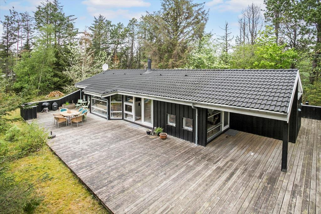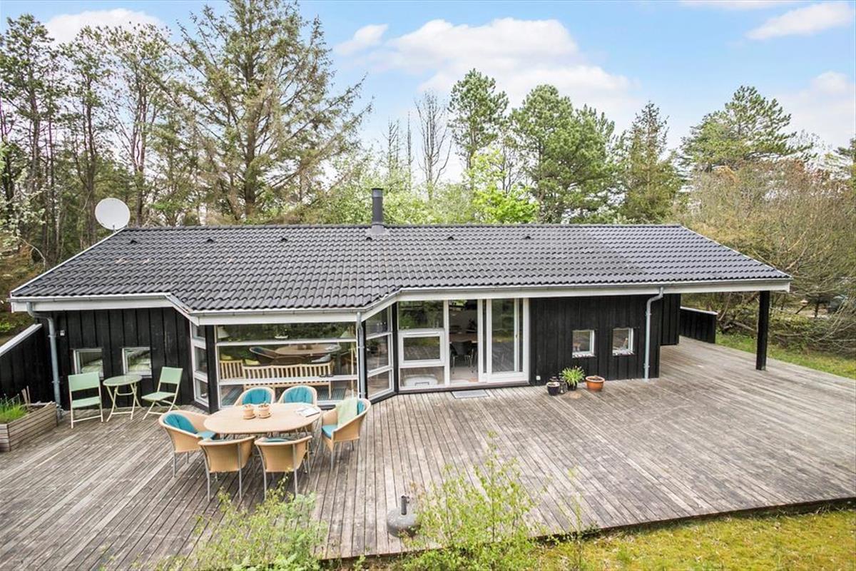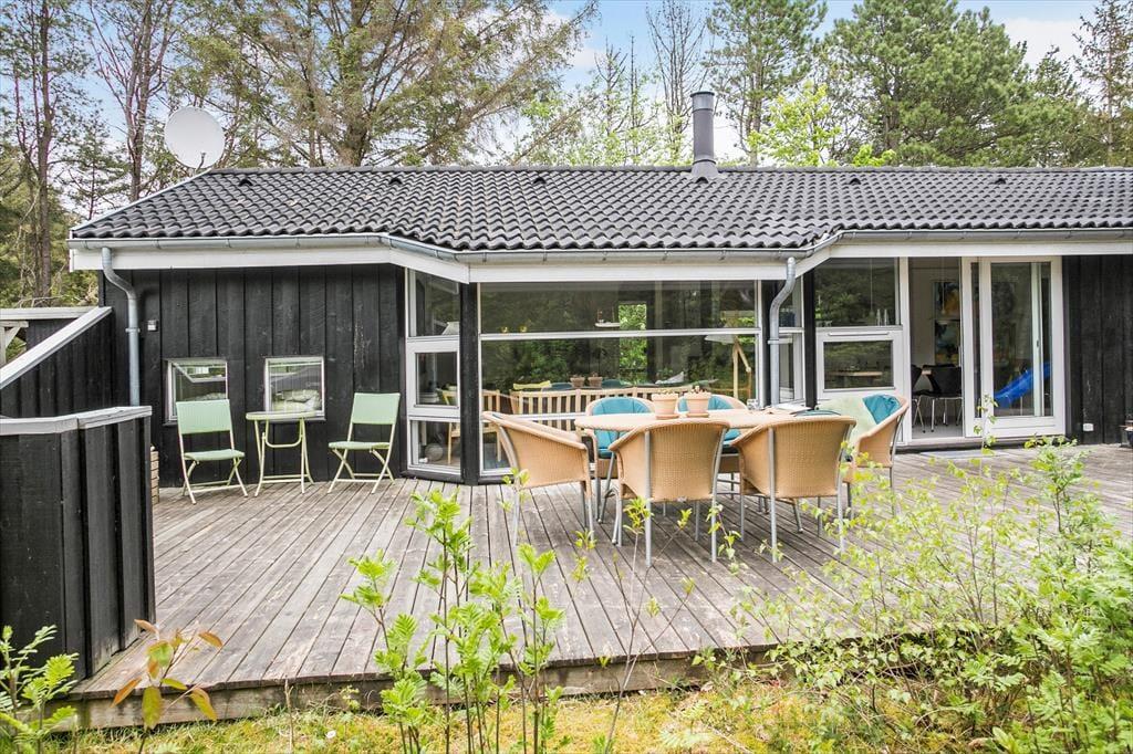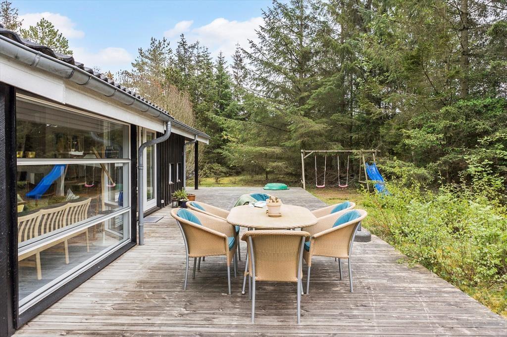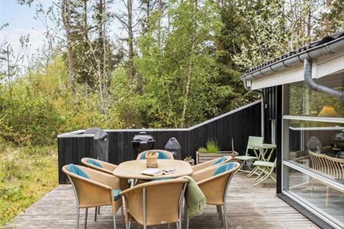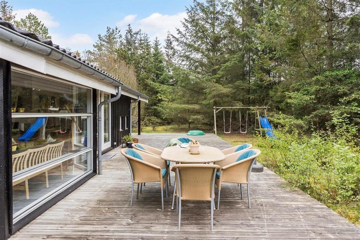 Das große Naturgrundstück befindet sich ungestört und teilweise von Bäumen umzäunt, damit Sie sich in aller Ruhe im Freien aufhalten können. Die tolle Holzterrasse verläuft auf drei Seiten und hat einen kleinen, überdachten Teil, damit Sie den dänischen Sommer bestens auskosten können.