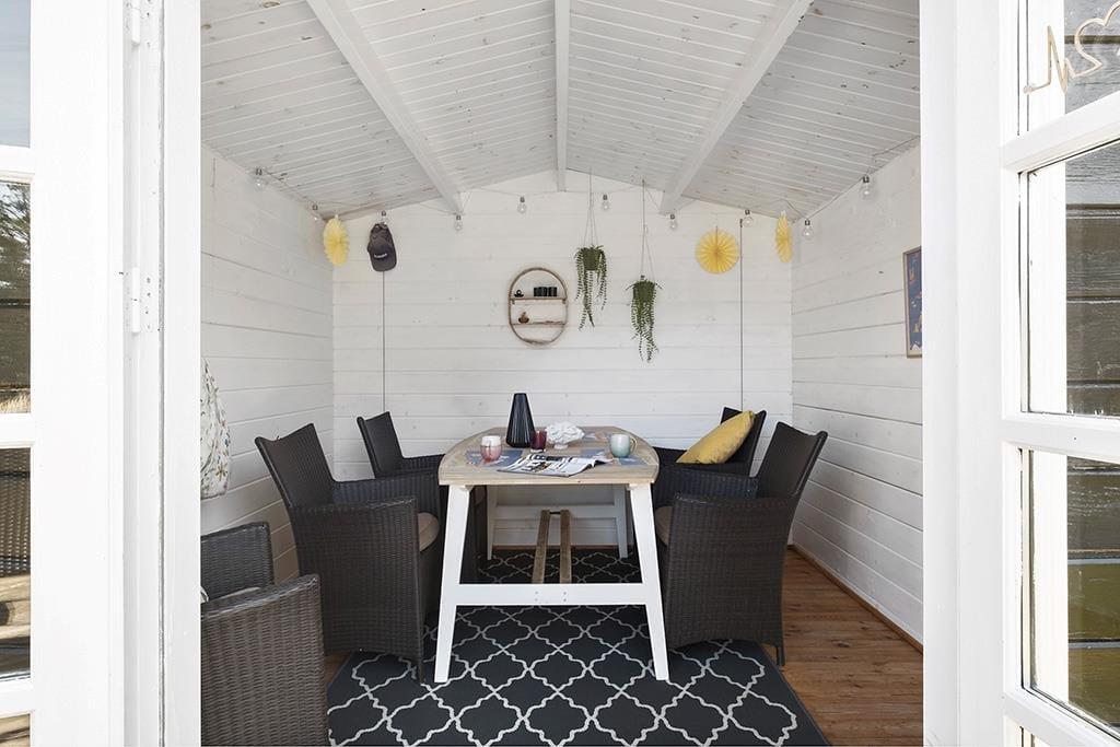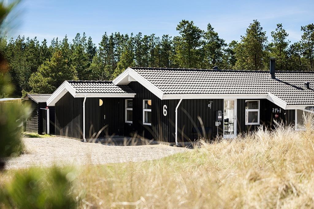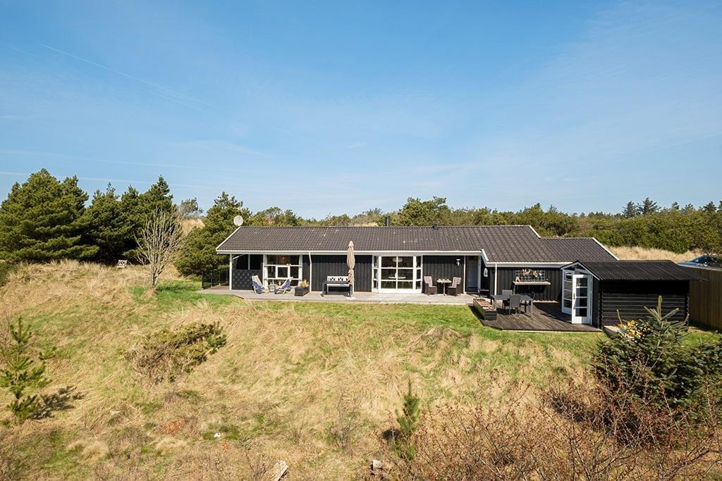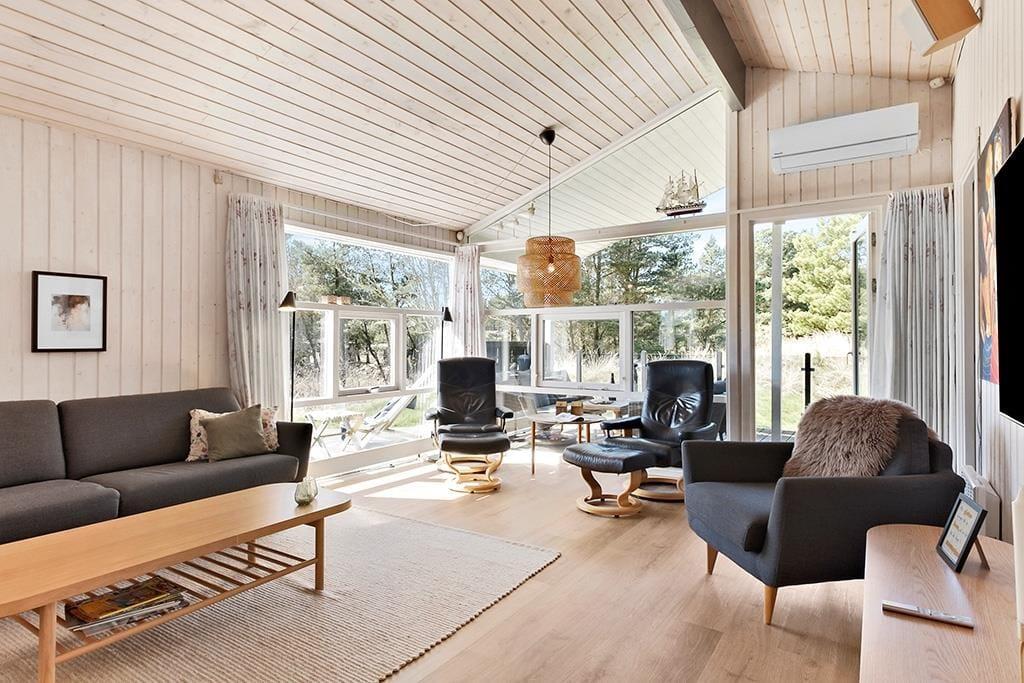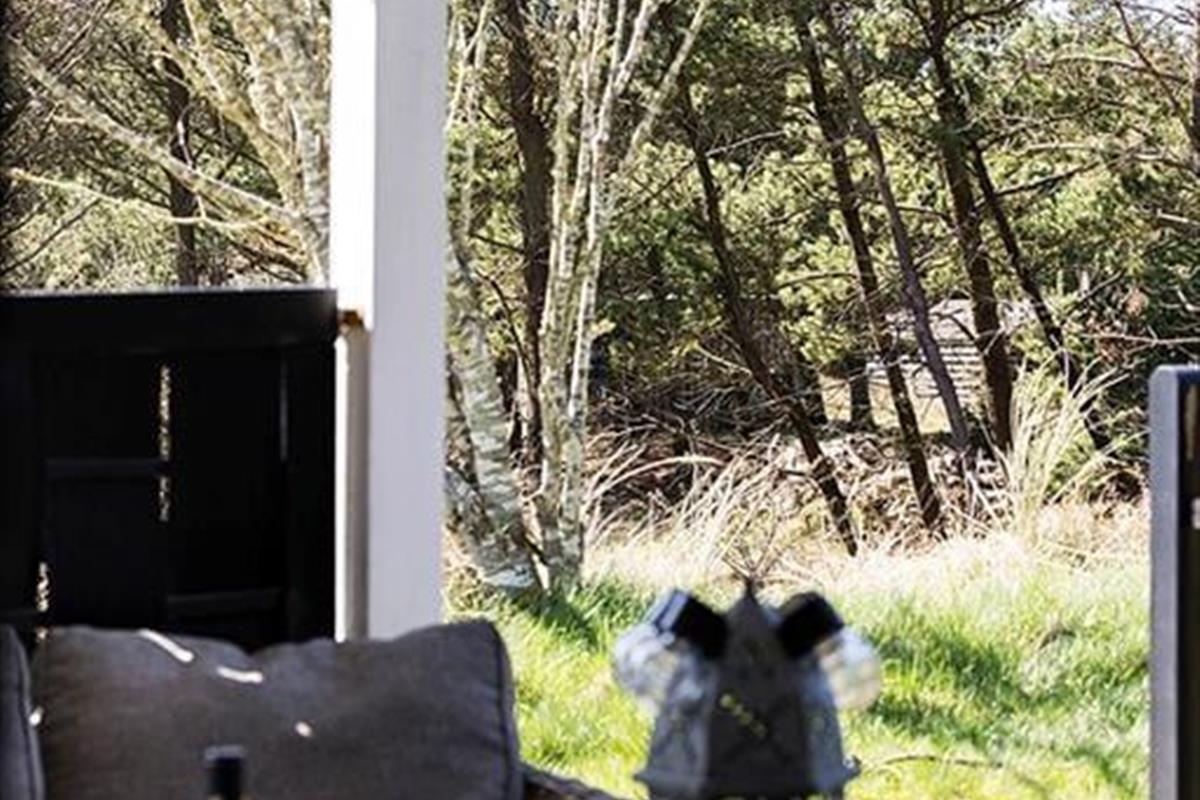 Es gibt drei Terrassen um den Großteil des Hauses. Der Teil am Wohnzimmer ist zudem überdacht und abgeschirmt. Hier sitzt es sich ideal am Abend, wenn es dämmert. Die wunderbare Natur mit hohen Bäumen und hügeligen Dünen ist fantastisch, denn hier lässt es sich bestens abschalten.