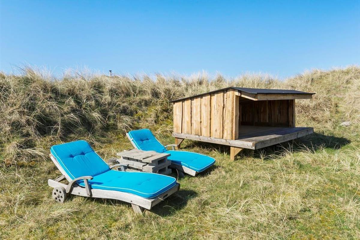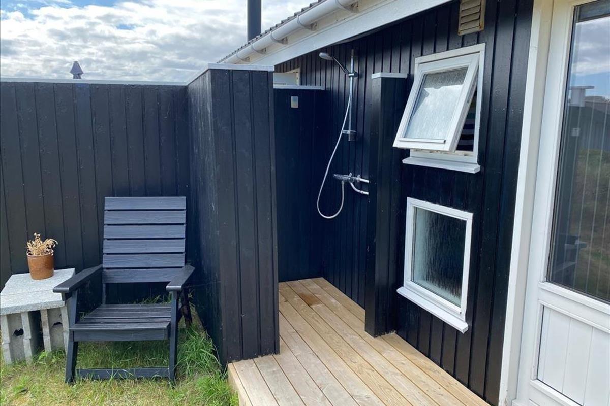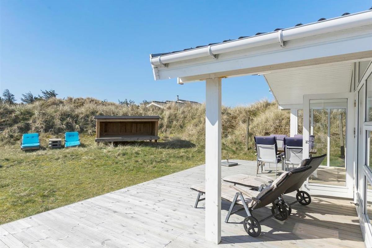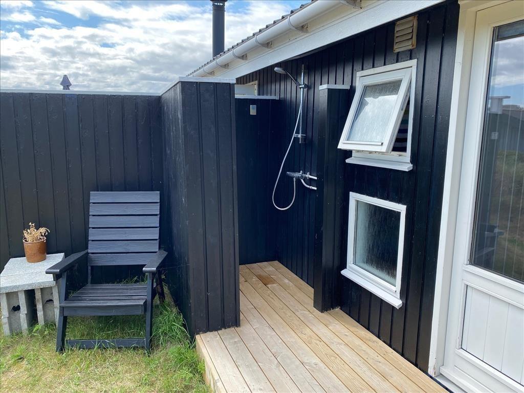 Wenn das Wetter schön ist, ist die große Terrasse der perfekte Ort zum Entspannen, mit viel Platz für sowohl Erholung als auch Spiel. Die Terrasse lädt zum Sonnenbaden in der Sommerwärme ein, und mit einer Außendusche kannst du schnell den Sand nach einem Strandbesuch abspülen. Das wunderschöne Naturgrundstück rund um das Ferienhaus schafft die perfekte Kulisse für Aktivitäten im Freien. Wenn du Glück hast, kannst du die gemütliche Atmosphäre um ein Lagerfeuer im angrenzenden Shelterbereich genießen, wo du einen unvergesslichen Abend unter den Sternen verbringen kannst.