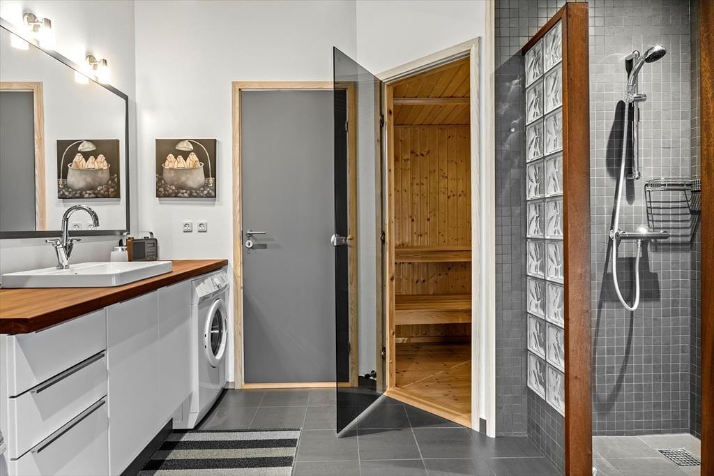 Das 107 qm² große Ferienhaus besitzt eine wohldurchdachte Einrichtung für sechs Personen. Die Schlafplätze sind auf drei Schlafzimmer verteilt. Im Badezimmer befindet sich nicht nur eine Duschnische, Waschmaschine und Fußbodenheizung, sondern ebenfalls ein Whirlpool und eine Sauna für Wohlfühlmomente. Kühlere Urlaubstage verbringen Sie wahrscheinlich überwiegend im Wohnzimmer, wo Sie es sich mit einer warmen Tasse Kaffee auf dem Sofa vor dem Kaminofen gemütlich machen können. Von dort aus haben Sie freie Sicht auf den Flachbildfernseher, sowie auf die grüne Landschaft, welche sich vor ihren Fenstern ausbreitet. Im Übrigen befindet sich im Wohnzimmer ein gemütlicher Esstisch, von dem es nur wenige Schritte in die gut ausgestattete Küche sind.