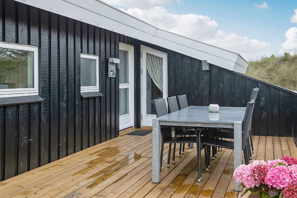 Auf der großen Westterrasse des Hauses kann man die sonnigen Urlaubstage und die frische Meeresbrise herrlich entspannt genießen. Zudem steht nach Osten eine geschützte Frühstücksterrasse zur Verfügung. Das zugehörige, große Naturgrundstück ist hügelig und naturbelassen. Obwohl das Ferienhaus erhöht liegt, sind Haus und Terrasse durch die umliegenden Dünen gut geschützt. Für die Kinder ist eine Schaukel vorhanden.
