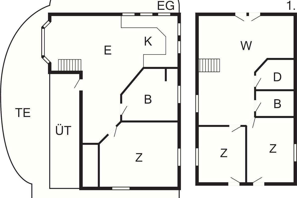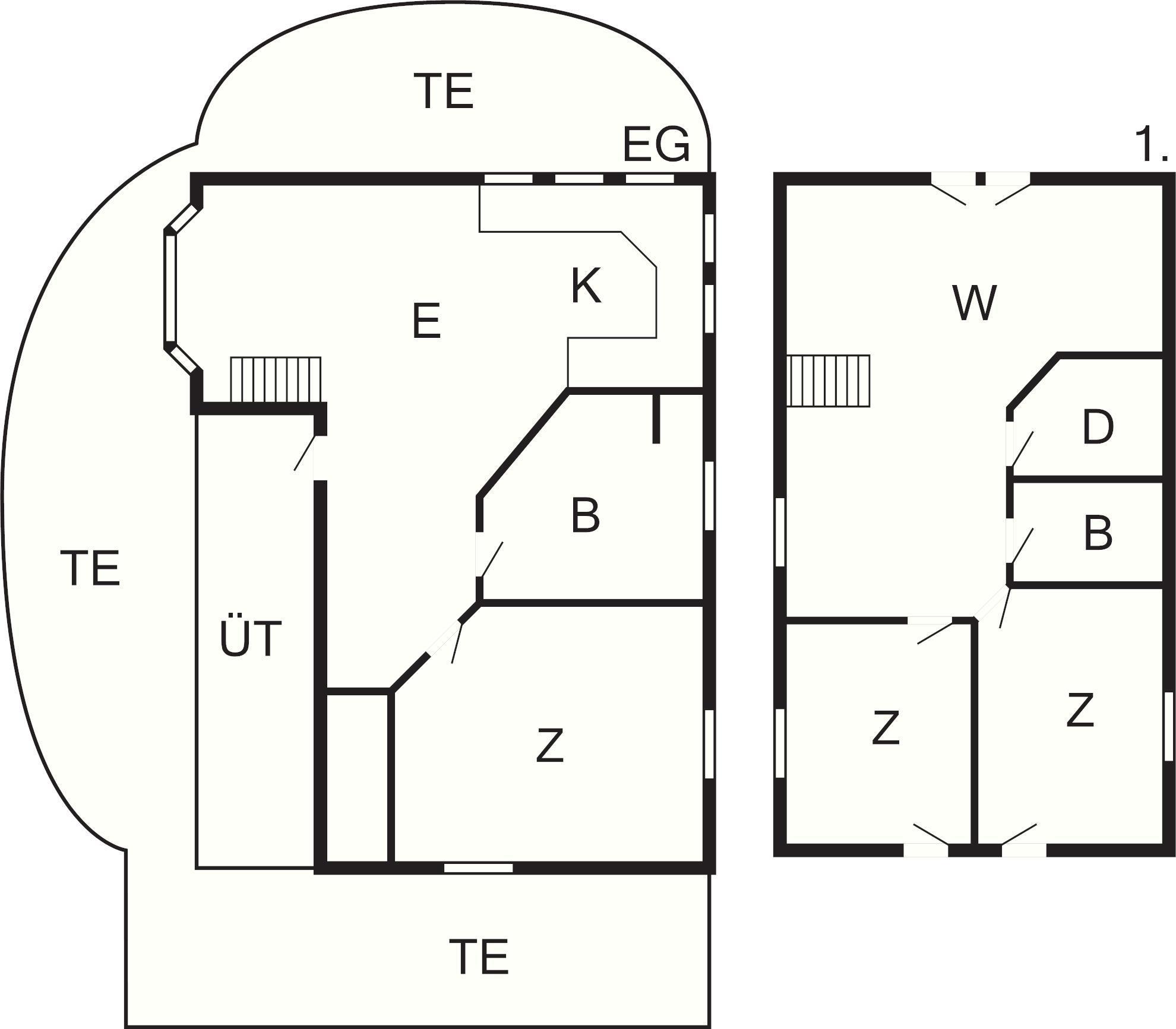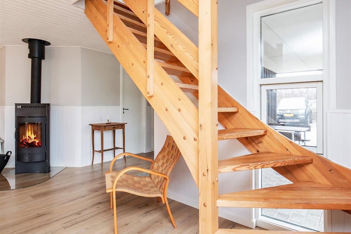 Das Ferienhaus bietet zwei Wohnebenen, wobei die untere Etage größtenteils aus einem gut ausgestatteten Küchen-/Wohnbereich mit Ess- und Sitzecke für das Familienleben besteht. Zudem ein Badezimmer mit Waschmaschine und Trockner, Flur und ein großes Schlafzimmer unten.