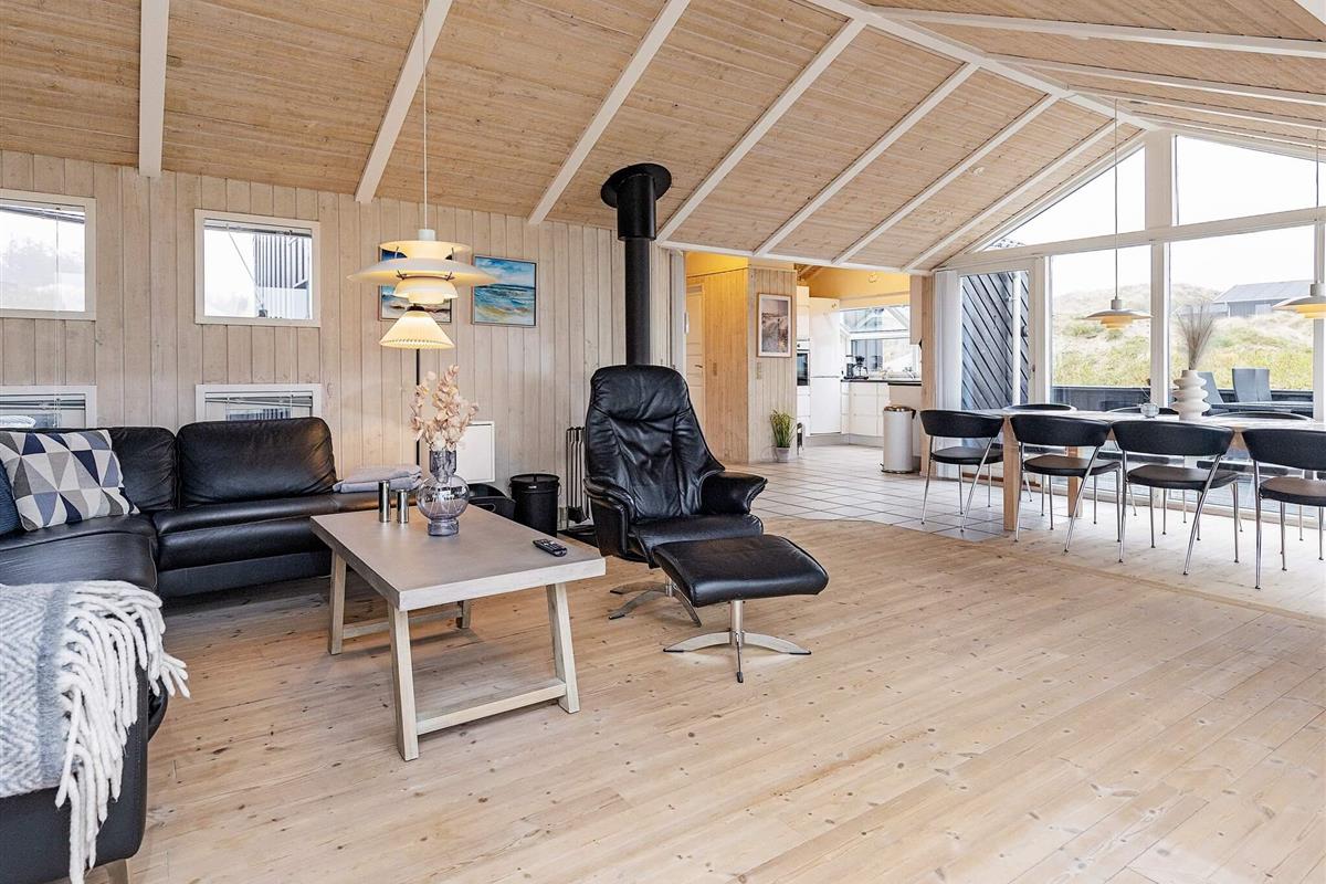 Das Wohnzimmer des Ferienhauses verfügt über große Fenster mit Meerblick, die viel Licht in Wohnzimmer und Küche bringen. Neben dem Wellnessbereich ist das Wohnzimmer der zentrale Treffpunkt. Es ist ein großer und äußerst einladender Wohnbereich mit Holzofen, Essbereich und integrierter Küche. Das Wohnzimmer verfügt außerdem über einen großen Flachbildfernseher, falls Sie Ihren Blick von der herrlichen Aussicht durch die Panoramafenster abwenden können.