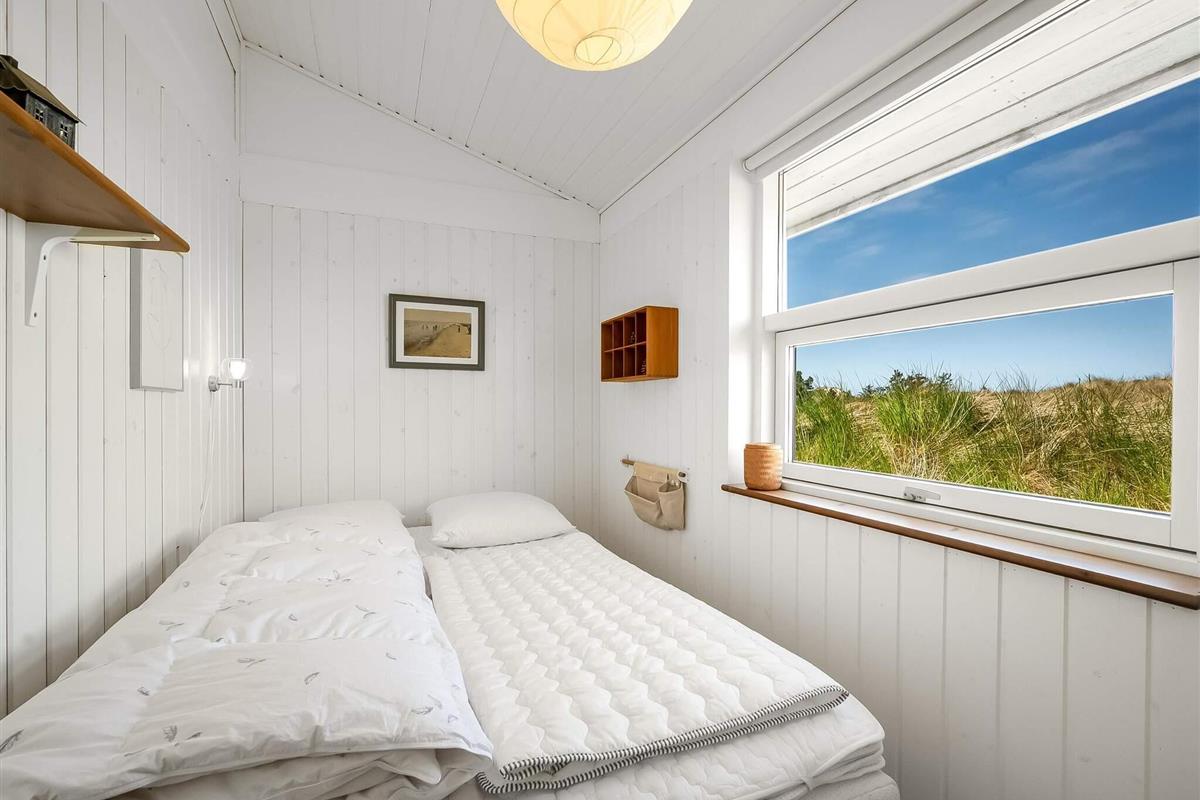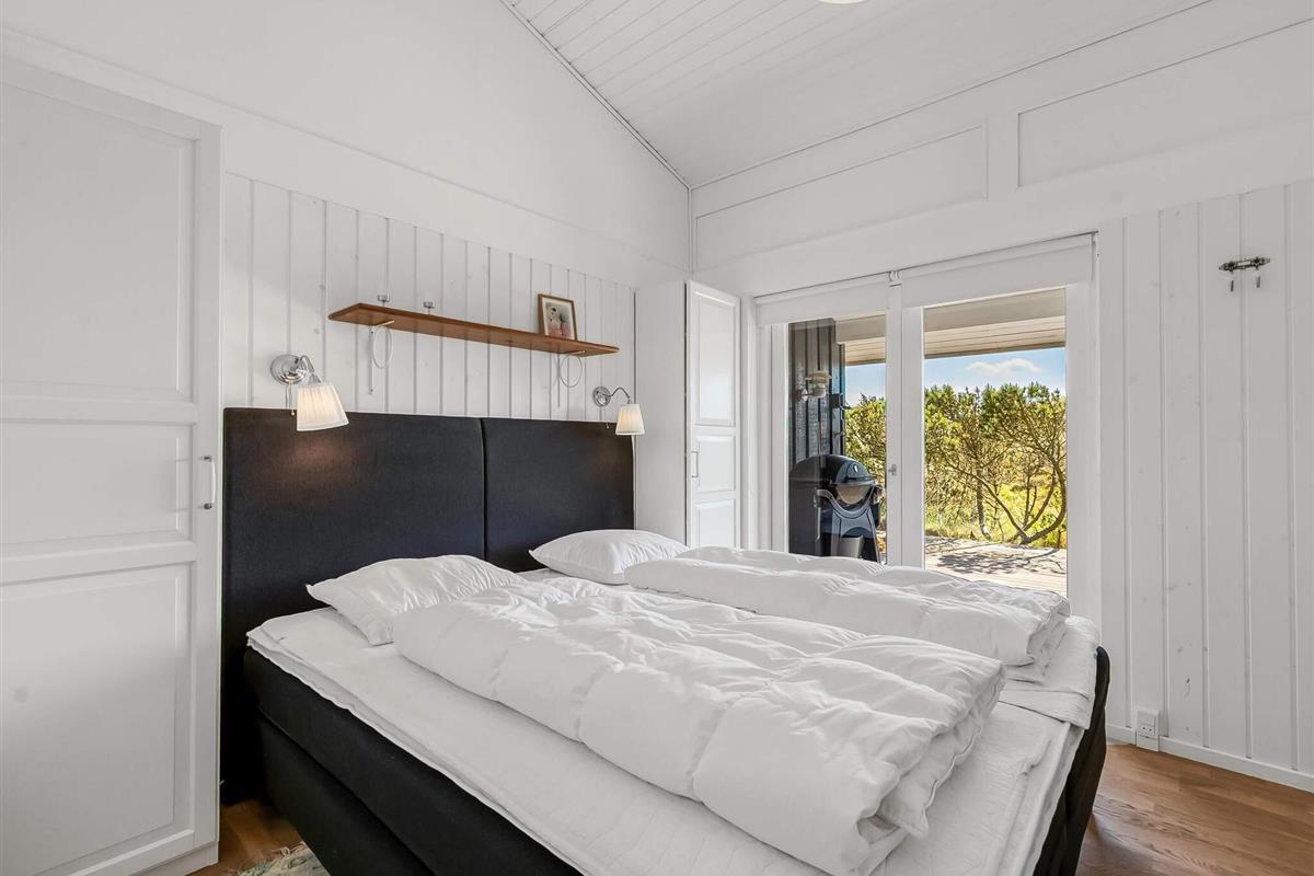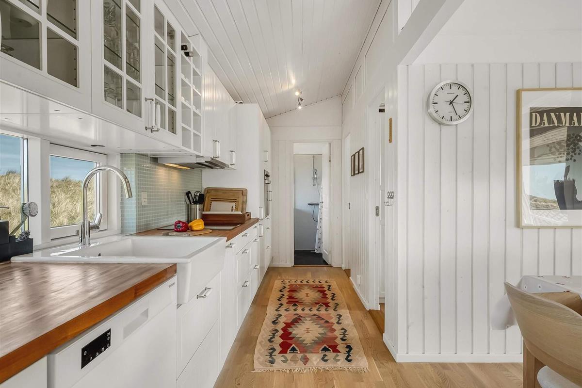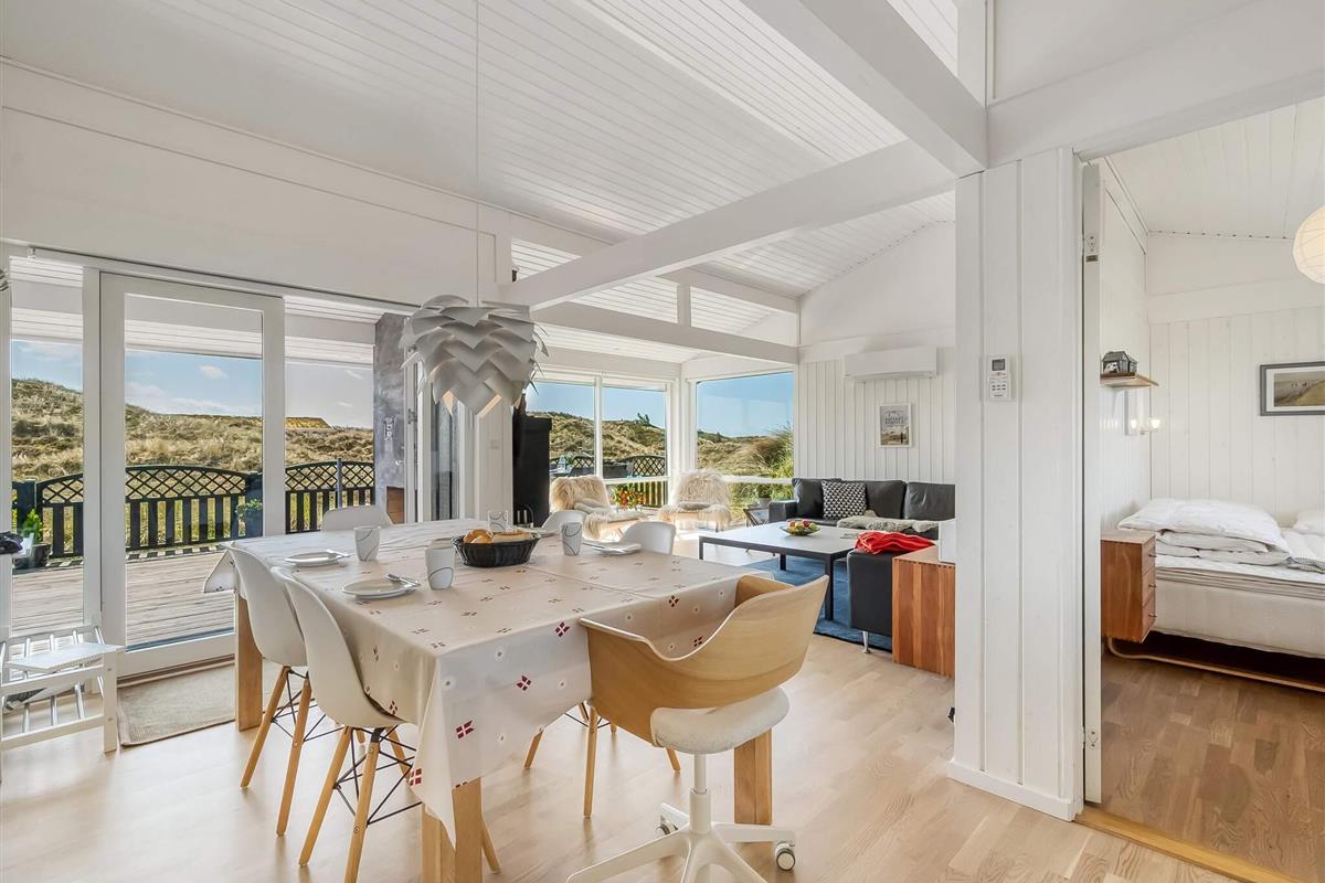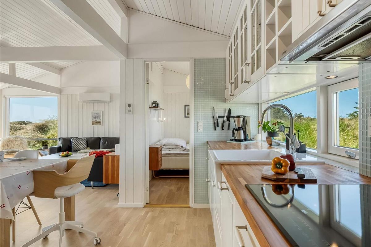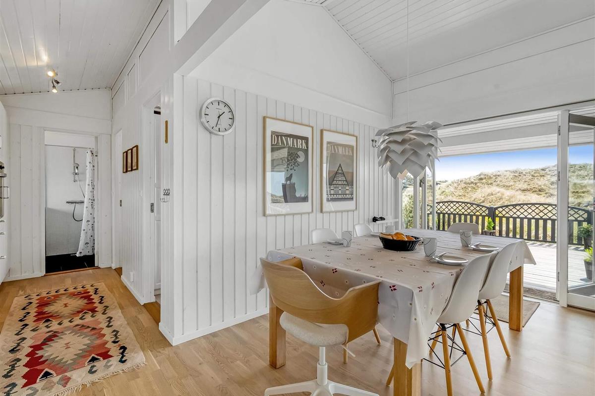 Det moderne sommerhus har en harmonisk og lys indretning med store vinduespartier, der inviterer det smukke klitlandskab helt ind i stuen. Det åbne opholdsrum kombinerer køkken og stue, og brændeovnen sørger for hygge og varme, når aftenerne bliver kølige. To af de tre soveværelser har direkte udgang til terrassen, og det stilrene badeværelse fuldender komforten indendørs. Plads til 5 personer.