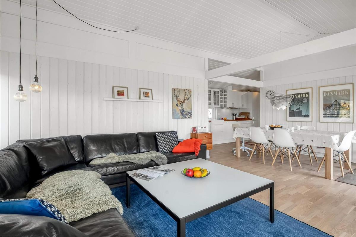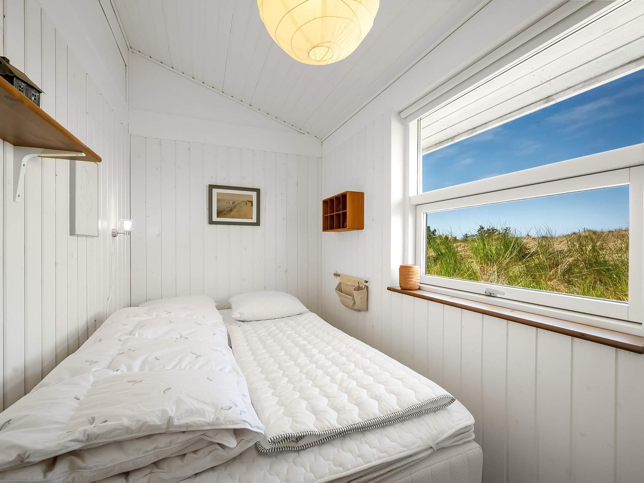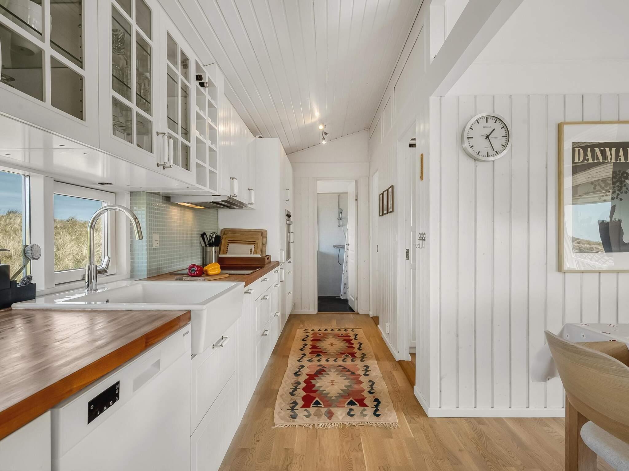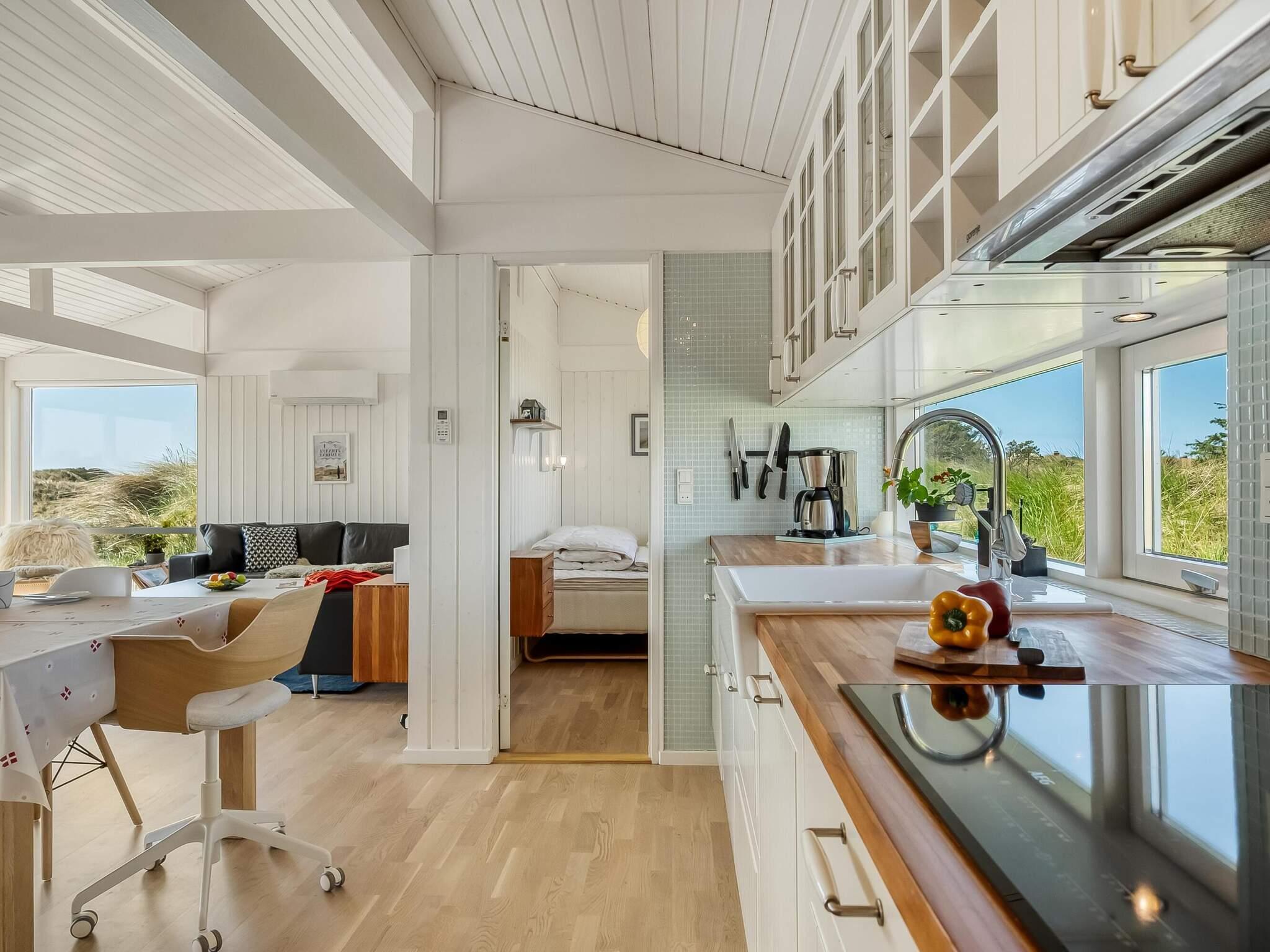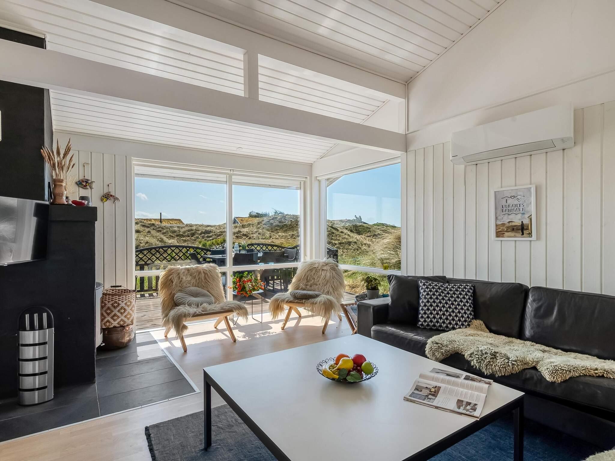 Det moderne sommerhus har en harmonisk og lys indretning med store vinduespartier, der inviterer det smukke klitlandskab helt ind i stuen. Det åbne opholdsrum kombinerer køkken og stue, og brændeovnen sørger for hygge og varme, når aftenerne bliver kølige. To af de tre soveværelser har direkte udgang til terrassen, og det stilrene badeværelse fuldender komforten indendørs. Plads til 5 personer.