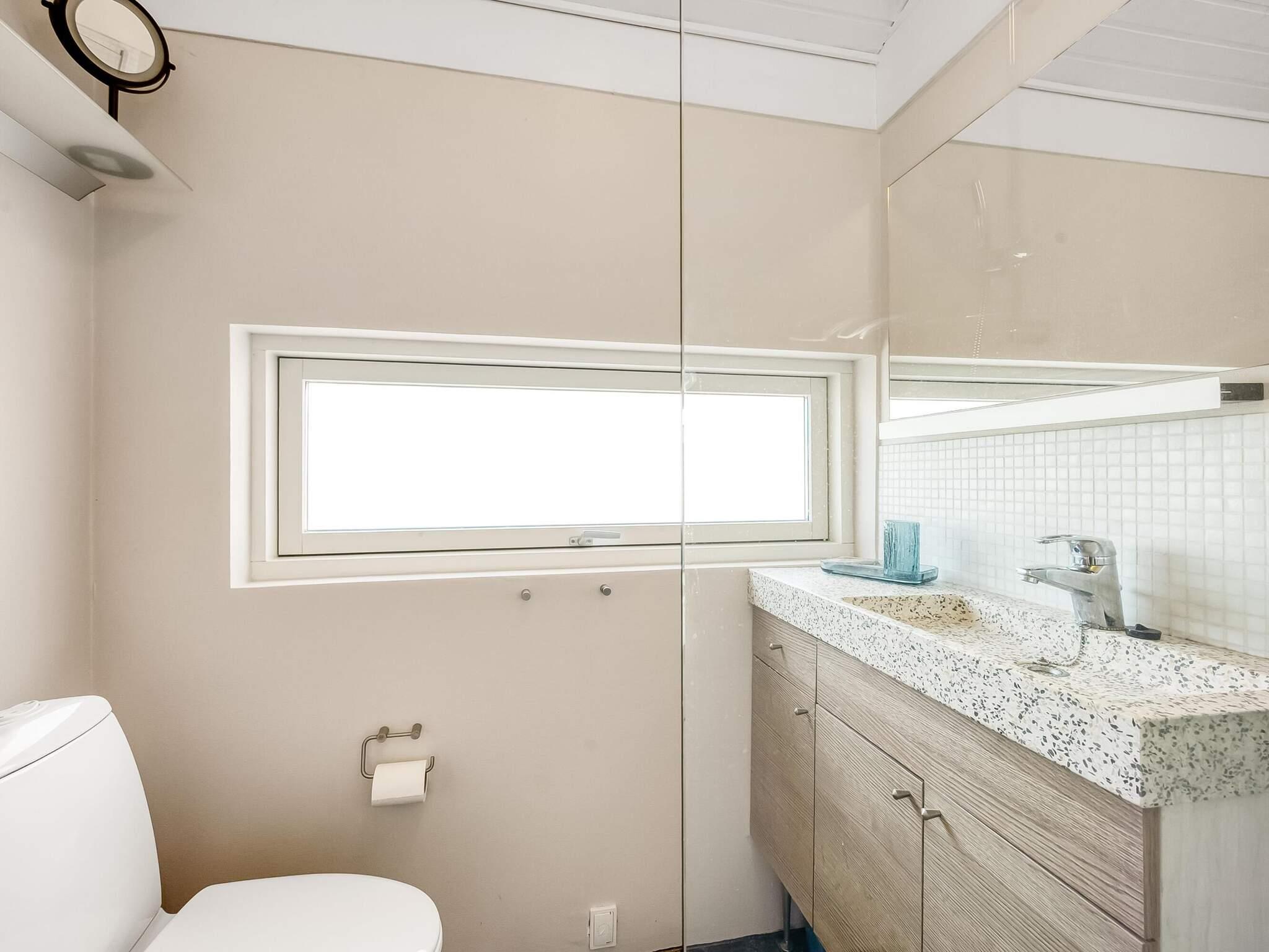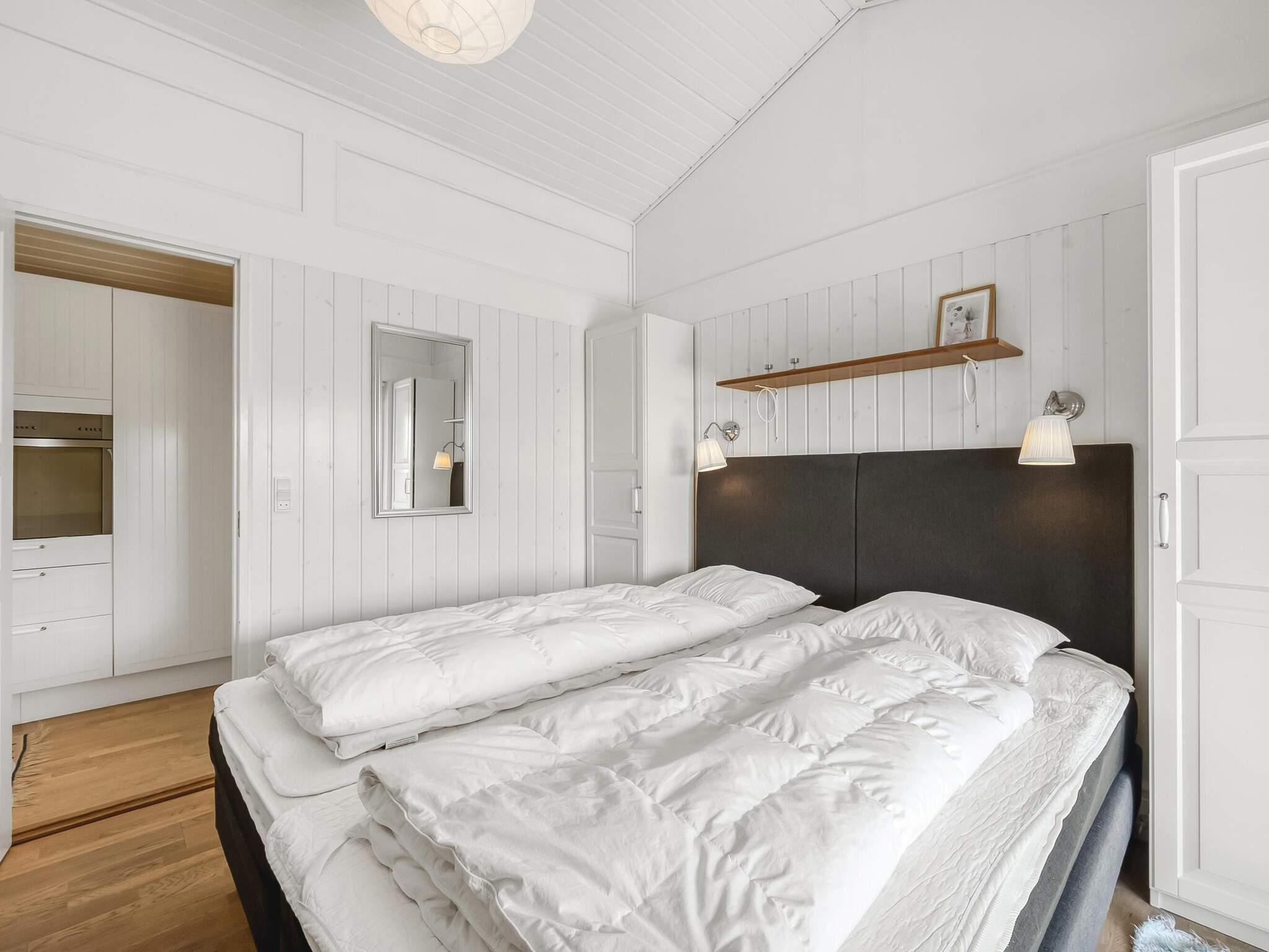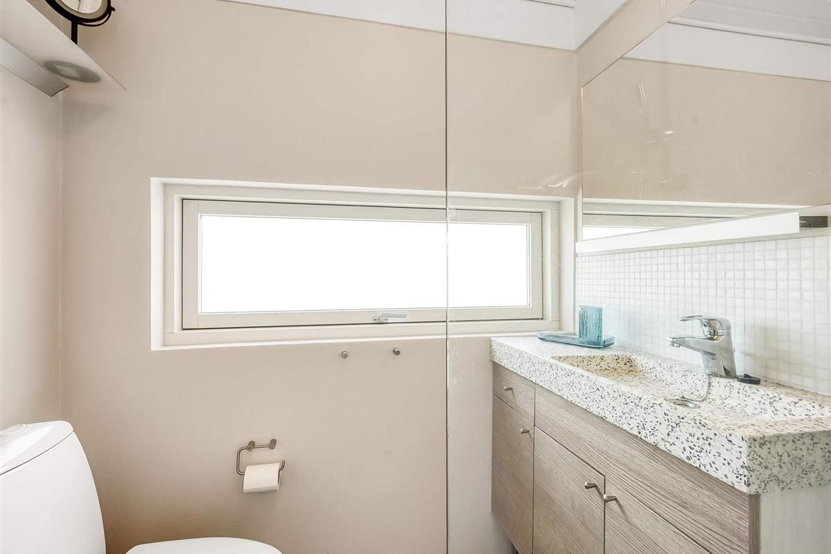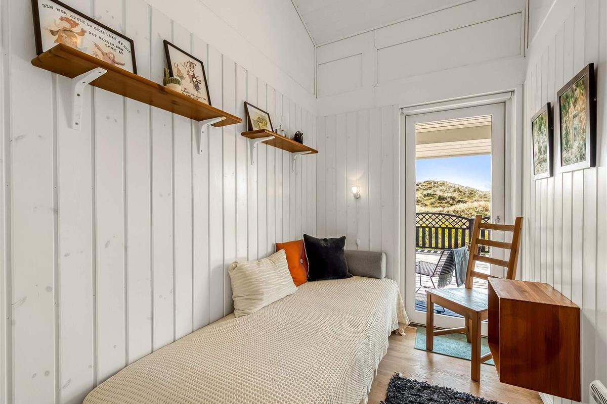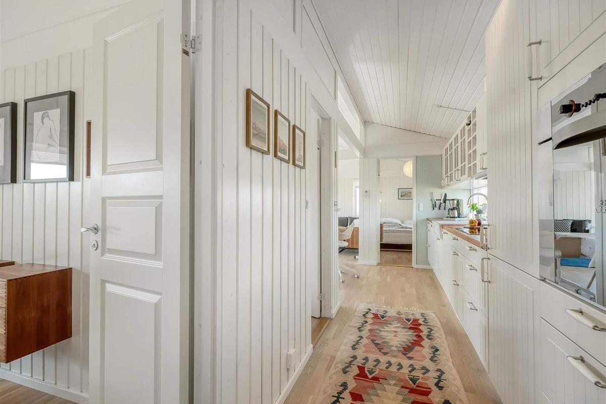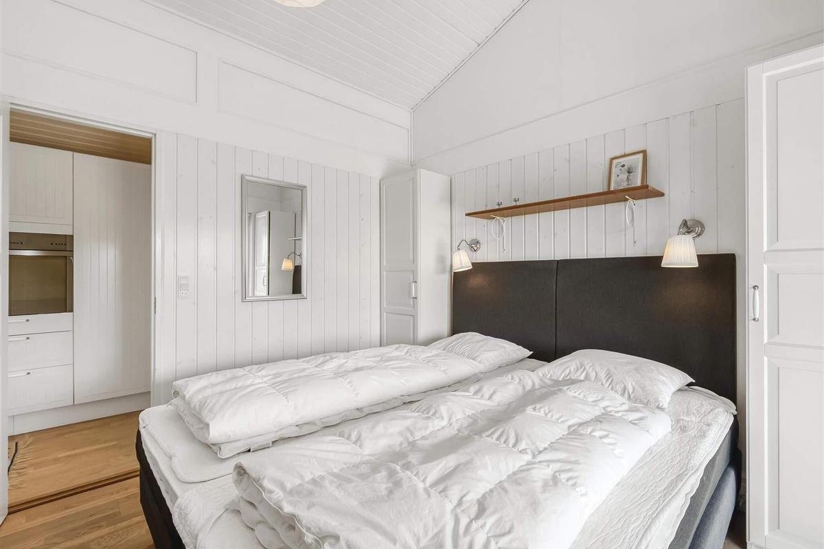 Det moderne sommerhus har en harmonisk og lys indretning med store vinduespartier, der inviterer det smukke klitlandskab helt ind i stuen. Det åbne opholdsrum kombinerer køkken og stue, og brændeovnen sørger for hygge og varme, når aftenerne bliver kølige. To af de tre soveværelser har direkte udgang til terrassen, og det stilrene badeværelse fuldender komforten indendørs. Plads til 5 personer.