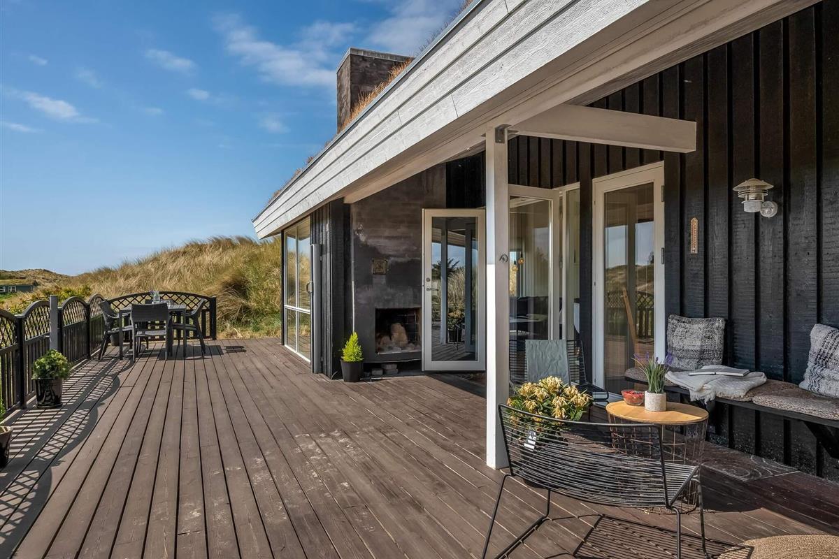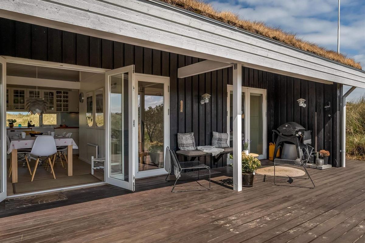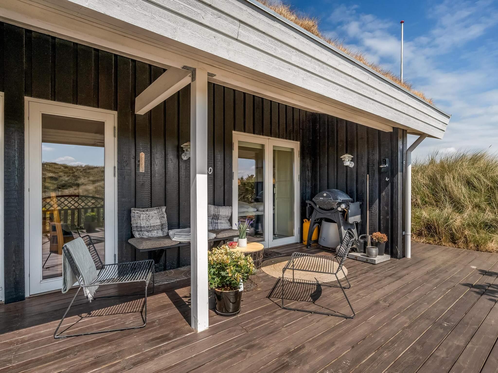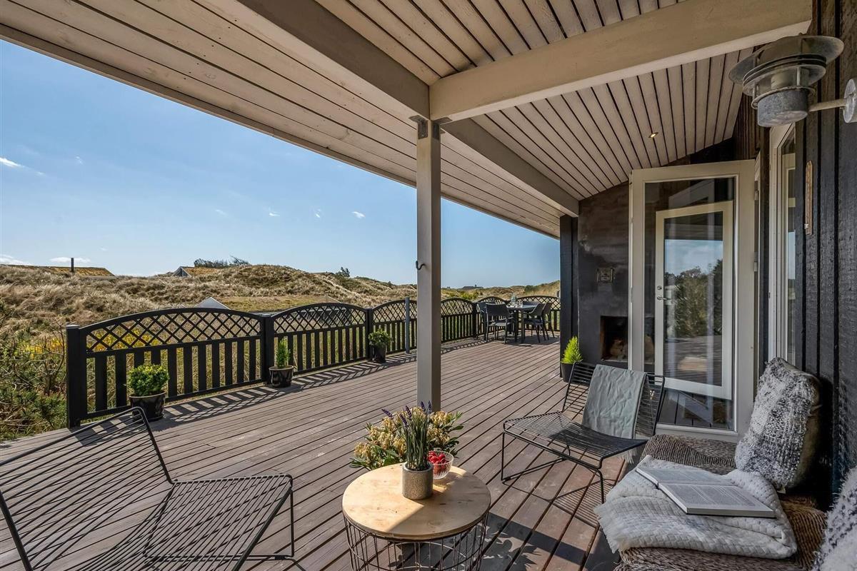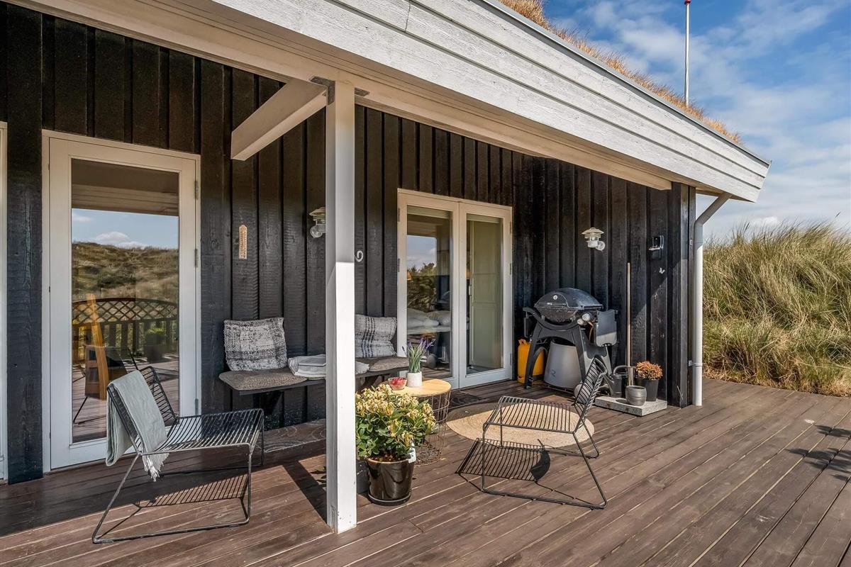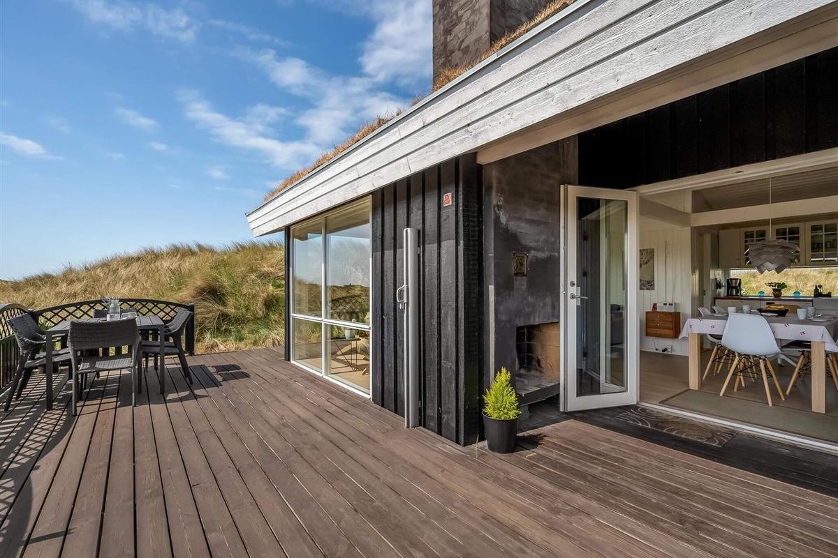 Udendørs venter flere gode terrasser – en stor, delvist overdækket terrasse mod syd og en mindre, åben terrasse mod øst, godt beskyttet af klitterne. Her kan du nyde sol, ro og feriestemning hele dagen. Om aftenen kan du tænde op i udepejsen og nyde det sidste lys, mens du lytter til Vesterhavets brusen i baggrunden."